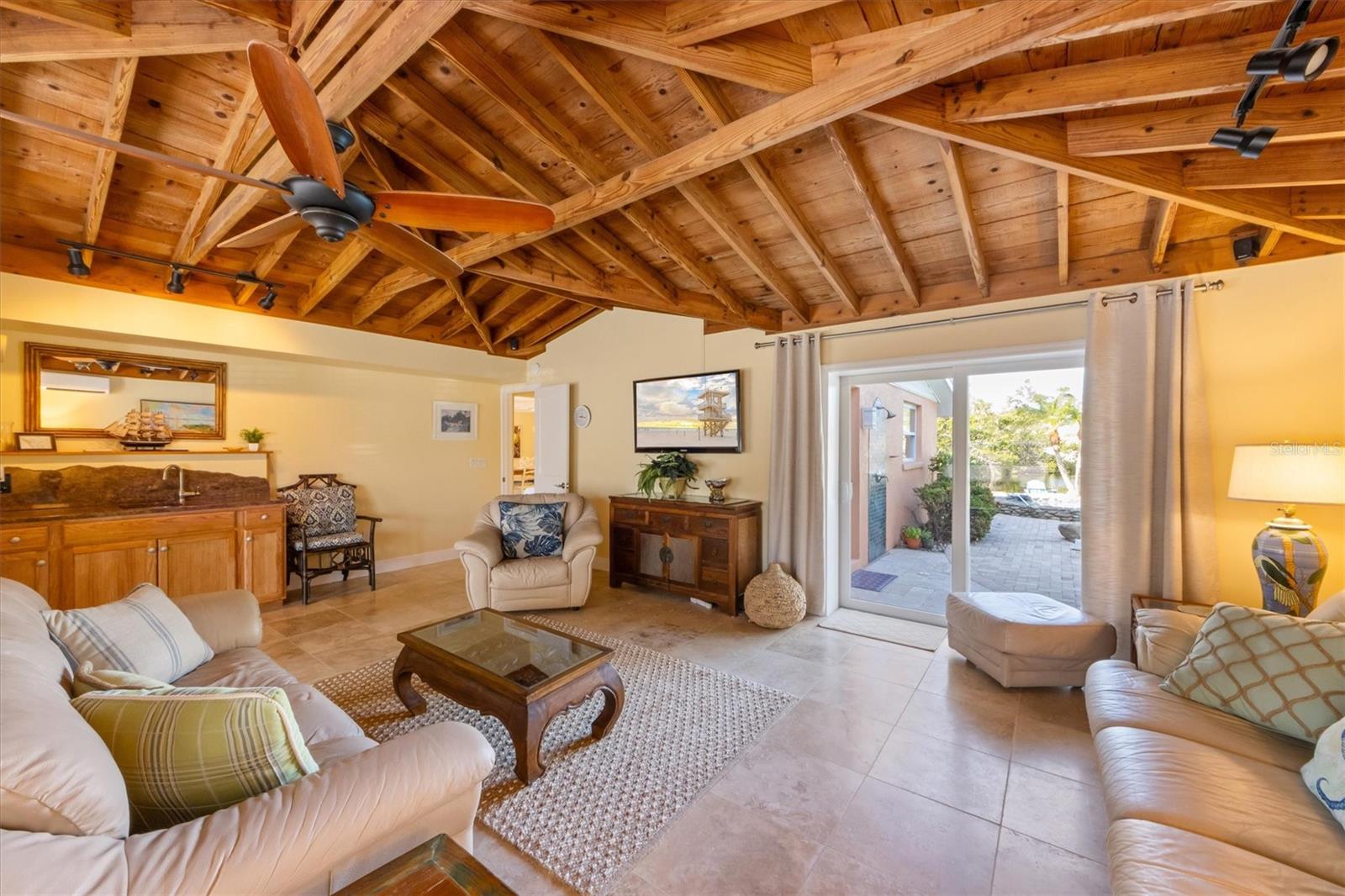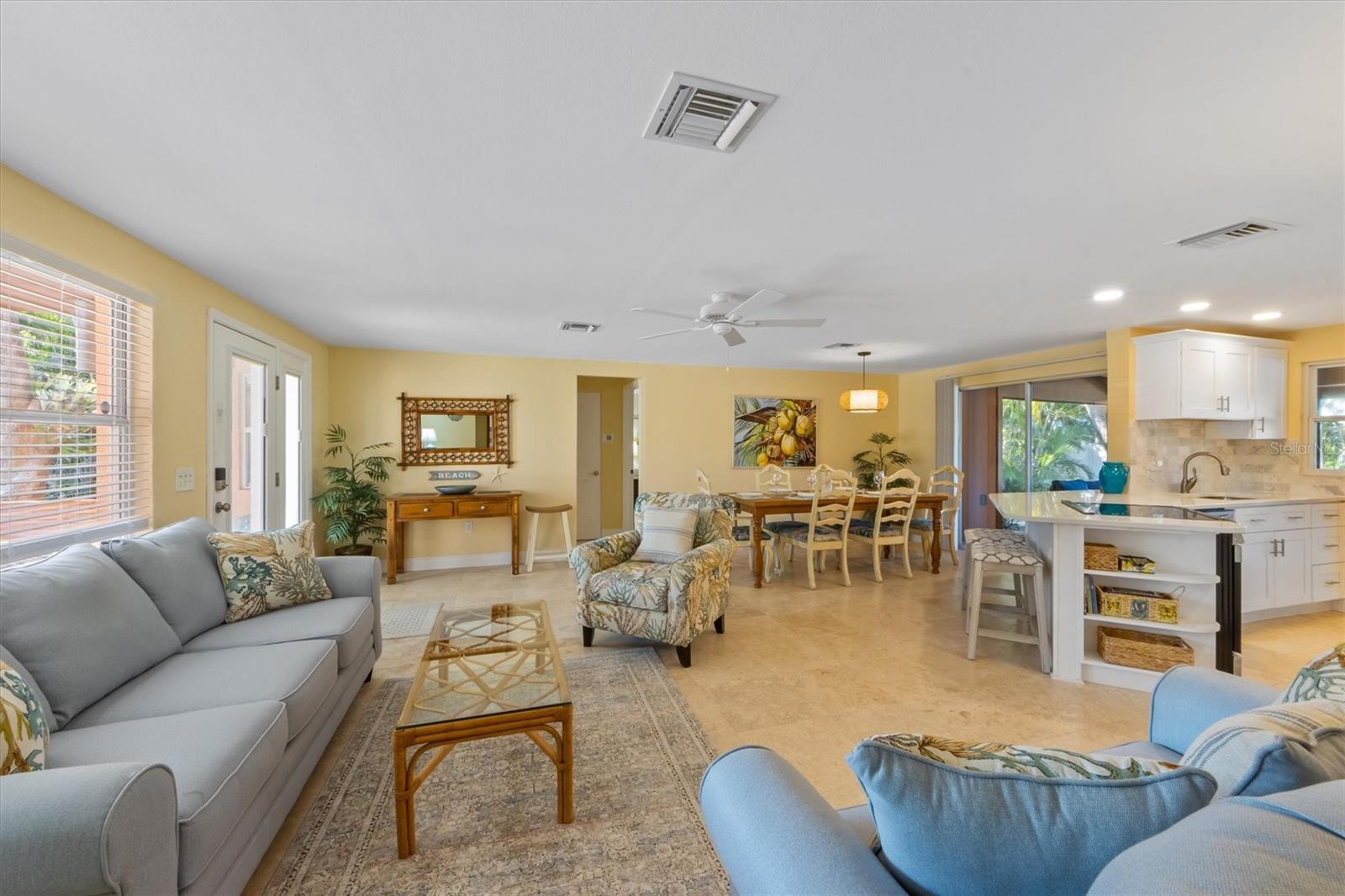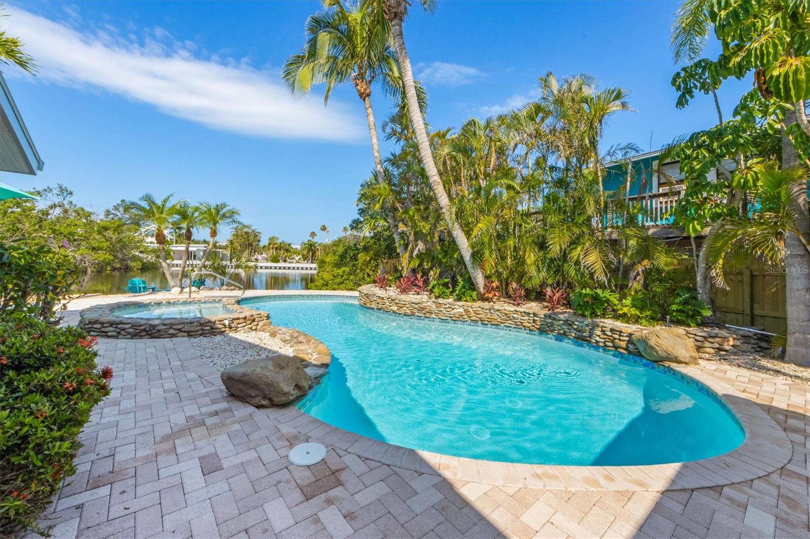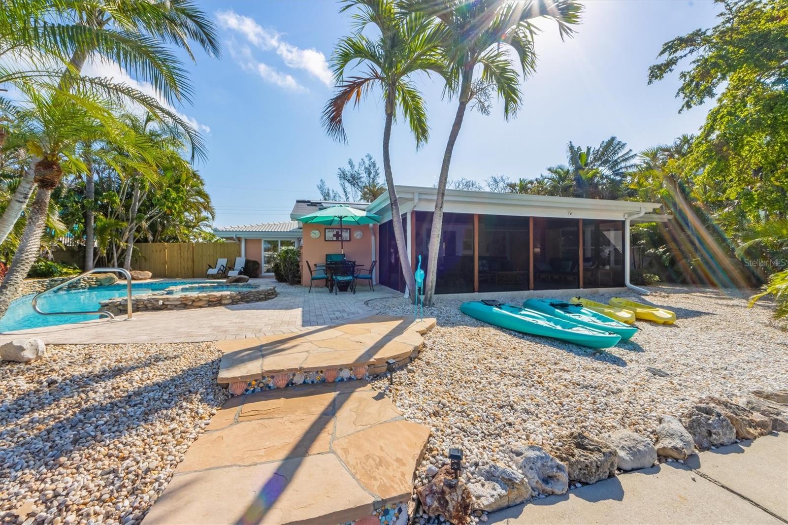Welcome to your dream lakefront retreat! This fully remodeled, solar powered, 2-bedroom, 2-bathroom home offers both comfort and space, featuring stunning travertine tile throughout. Enjoy gorgeous views of Clark Lake with 90 feet of seawall and a composite dock perfect for launching kayaks or simply soaking in breathtaking sunsets and birdwatching. The screened-in porch offers an extension of living space and is a great place to come in and relax after an afternoon spent in the salt water pool with spa. Inside, the updated kitchen boasts stainless steel appliances, blending style and function. The converted garage now serves as a versatile bonus room, perfect as a game room, additional sleeping space, or a cozy retreat—not included in the official square footage. The split design is ideal. The bedrooms are both spacious and practical. Located centrally, you’re just minutes from local shops, beautiful beaches, and convenient trolley stops. Whether you’re entertaining, unwinding, or exploring, this home has it all. This home has been a successful rental for more than 10 years. It sustained damage during Helene and has been fully renovated. Is being sold turn key and but owners have decided not to put home back on rental market.