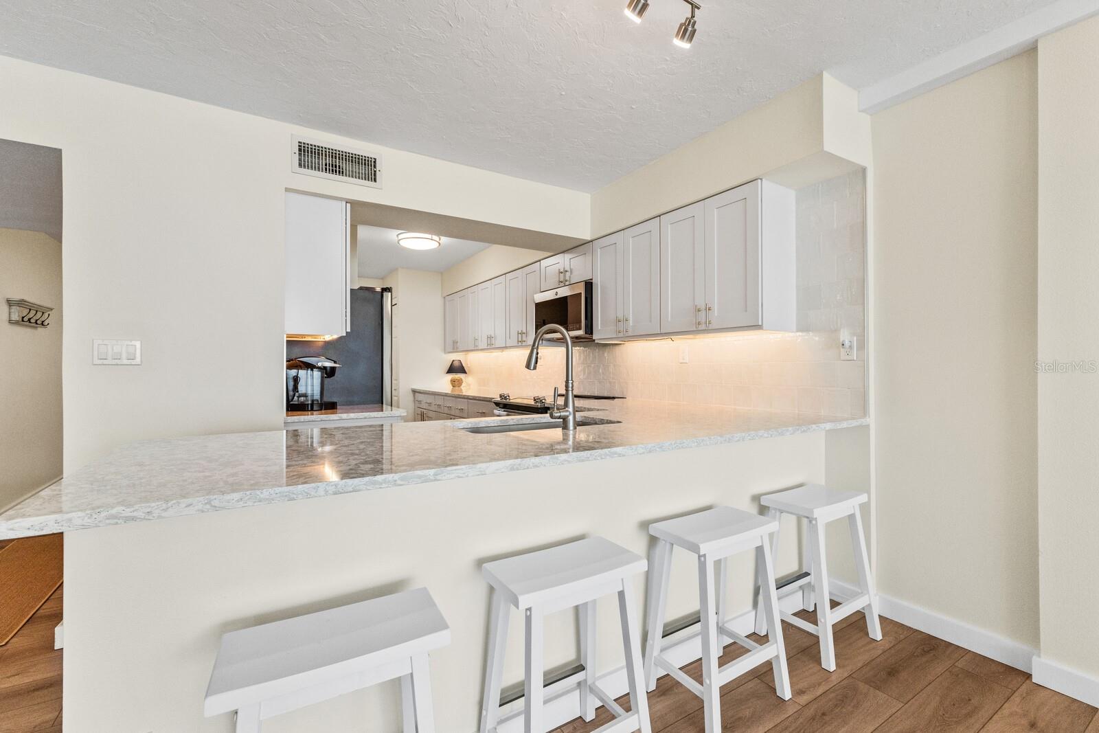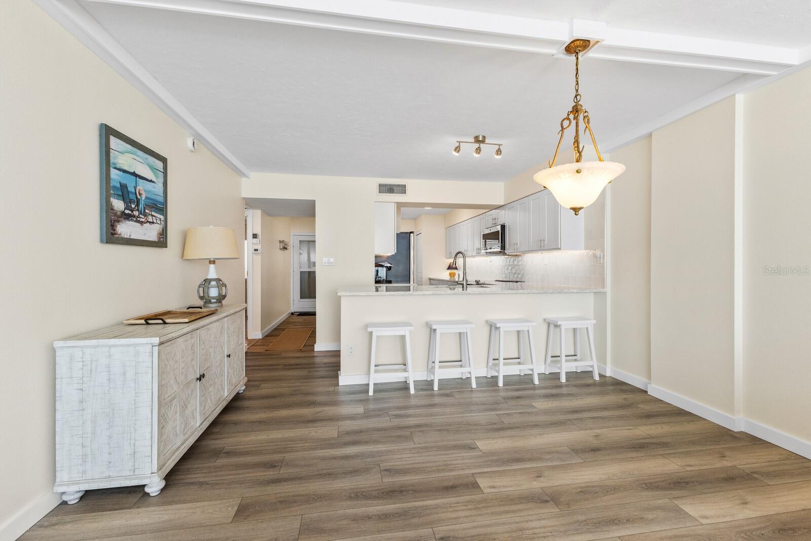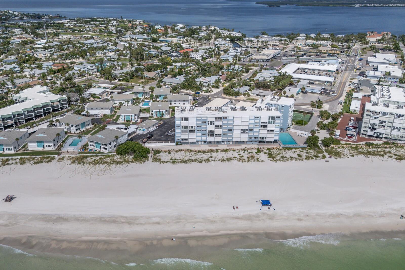 Soaring above the coastline on Anna Maria Island, this rarely available 5th floor condo at the Martinique delivers a front row seat to one of the most spectacular views on the Gulf Coast. Expansive windows in the living area and primary suite frame an endless horizon of blue, casting natural light across the updated interiors. The layout is open and easy, with two spacious bedrooms, two full baths, and a breezy coastal feel throughout. The kitchen features sleek stone counters, shaker cabinetry, and a wide breakfast bar perfect for laid back dining or entertaining. Just outside, you’ll enjoy resort style living with a large heated beachside pool, tennis courts, and private beach access to one of the most gorgeous beaches in Florida. You'll also appreciate the added bonus of your own deeded garage and separate storage unit for all the beach gear, bikes, and extras. Whether you're watching the sunset from your living room, soaking in the sun on the sugar sand beach or strolling to nearby shops and restaurants, this is the kind of place that makes every day feel like a vacation.