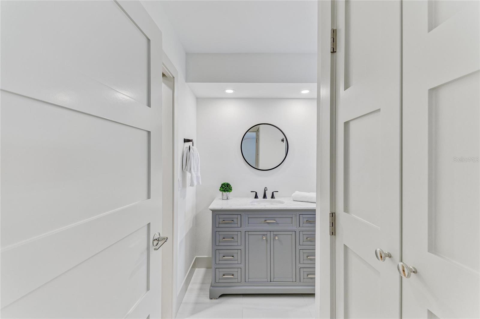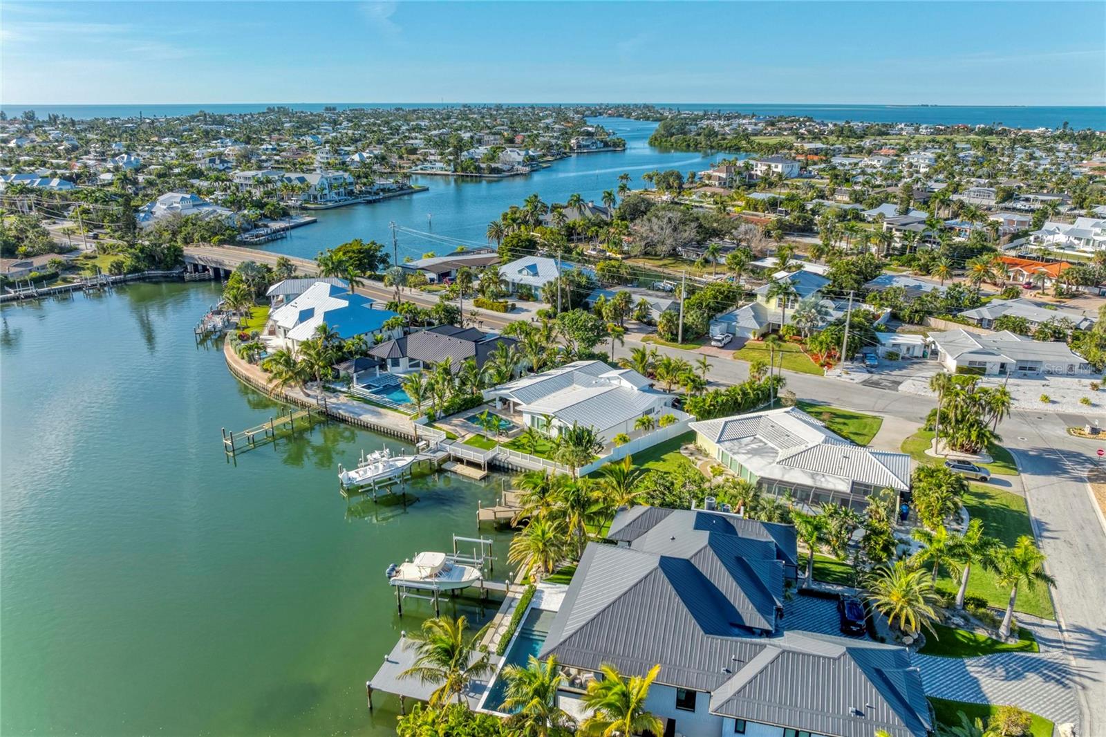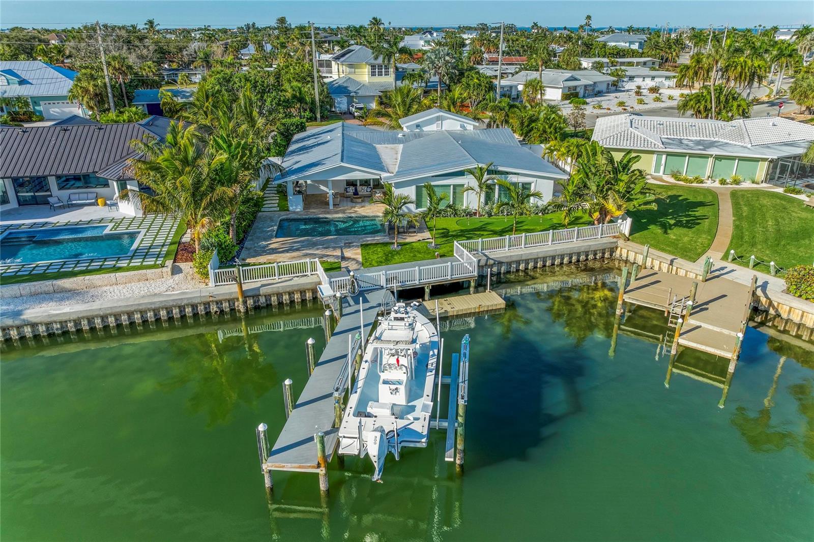 Welcome to coastal luxury living in the highly coveted Key Royale neighborhood of Holmes Beach. This fully remodeled 3-bedroom, 3.5-bath waterfront home is a rare find—offering breathtaking views, modern upgrades throughout, and direct access to Tampa Bay and the Gulf of Mexico. Situated on a tranquil south-facing cove along the Intracoastal Waterway, this property provides both stunning scenery and natural protection. Step inside to an open, airy floor plan featuring all-new wood flooring, new interior and exterior doors, new windows with shutters, and exceptional craftsmanship at every turn. The chef’s kitchen is a true showstopper, showcasing top-of-the-line Thermador appliances, custom cabinetry, and a spacious layout designed for effortless hosting and everyday living. The primary suite is a retreat of its own with dual walk-in closets and a beautifully updated ensuite bath. The second bedroom functions like a second primary, offering a generous bedroom space and its own private ensuite bathroom—ideal for guests or multi-generational living. Outdoors, the home transforms into a private waterfront paradise. Enjoy a saltwater pool and spa, a full outdoor kitchen, and your own putting green—all overlooking sparkling water views where dolphins are frequent visitors. Boaters will appreciate the 16,000-lb boat lift, deep water access, and plenty of side-yard space for additional toys, including a 50-amp RV hookup and room for a boat or trailer. With luxury updates, protected water, and unparalleled views, this is Florida waterfront living at its finest!
