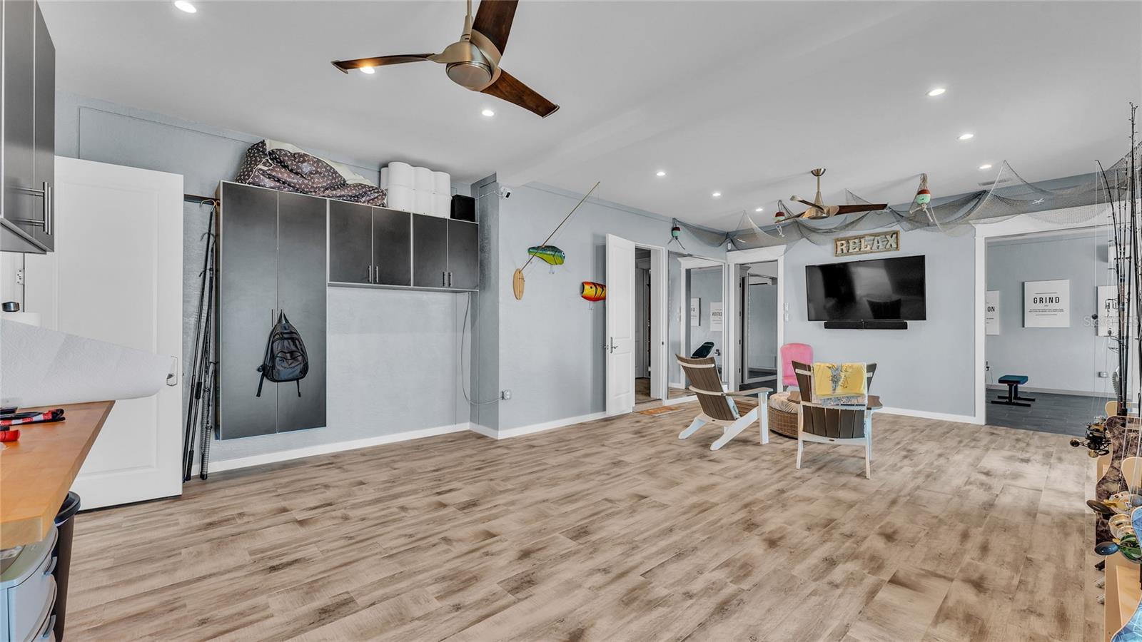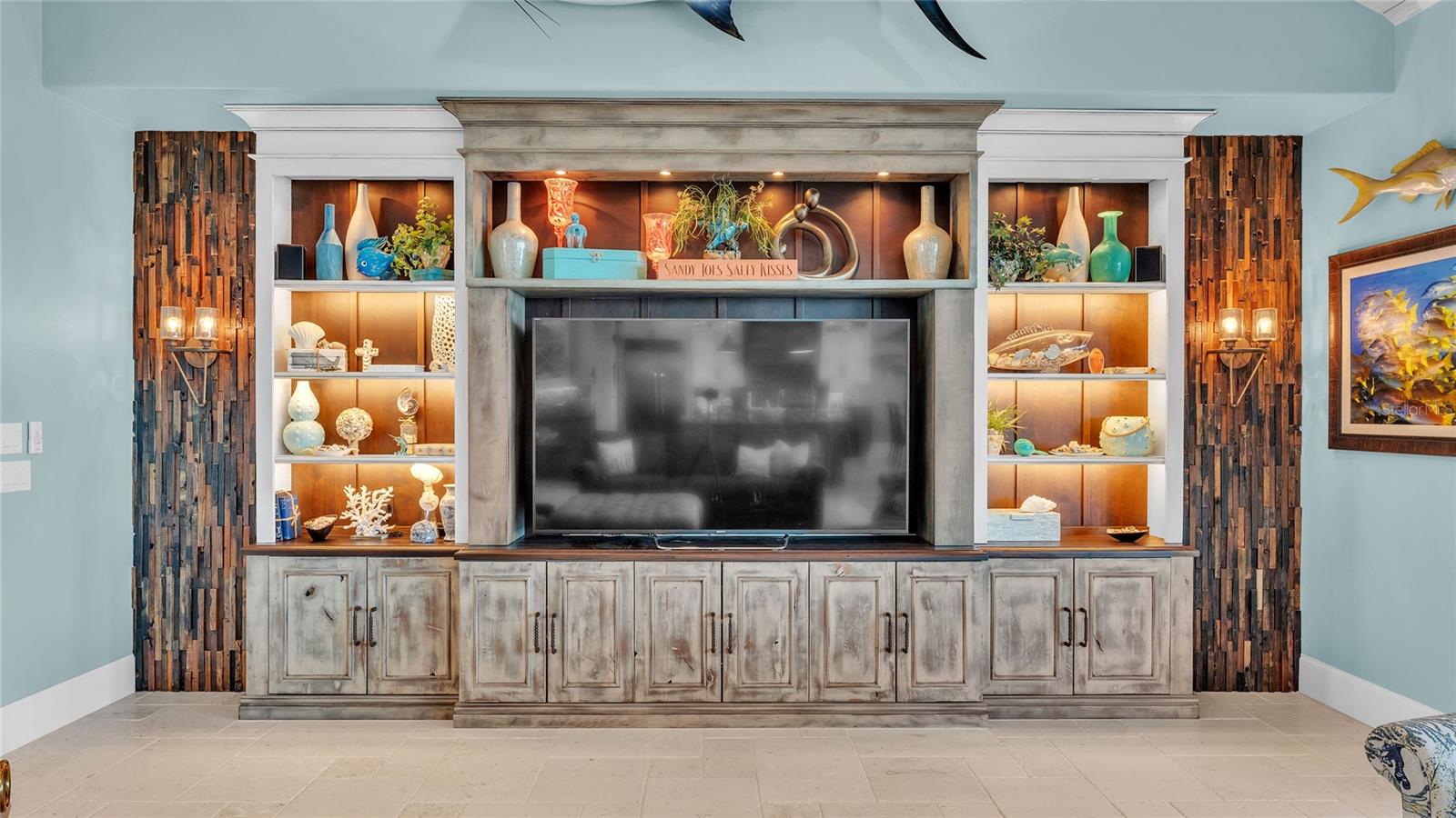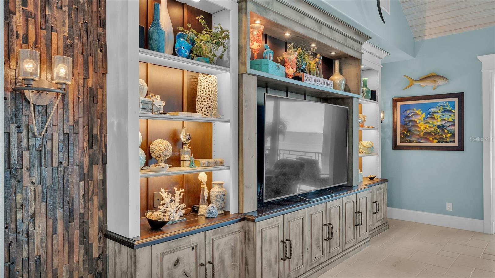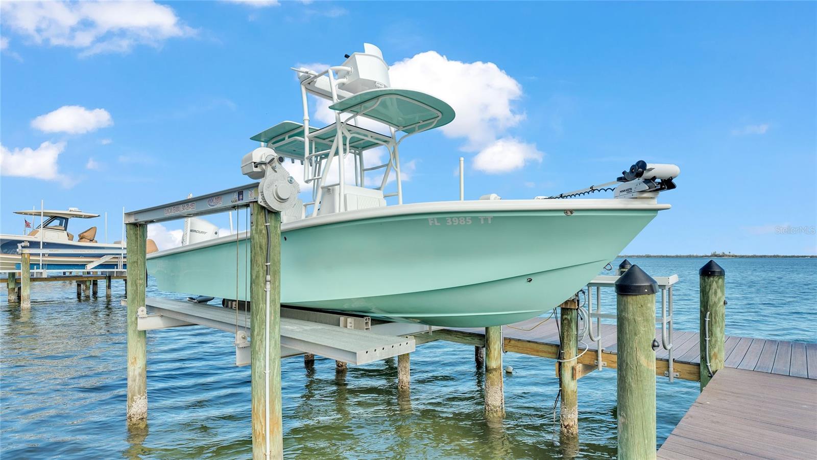 This bayfront Key Royale home is ideally situated on the southern side of Key Royale, offering a more protected setting away from the north wind and enhancing year-round outdoor enjoyment. Truly a World of Its Own—delightful bayfront living with sweeping views of the crystal-clear waters of Anna Maria Sound and Tampa Bay. This elevated, single-level custom-built coastal residence is a tribute to exceptional design, premier location, and impeccable construction, finishes, and taste. Calm coastal hues and shell stone travertine flooring flow throughout the soaring living spaces, highlighted by tongue-and-groove ceilings with solid wood beams. The home showcases custom cabinetry with 100-year-old pine accents, extensive millwork, and a handcrafted TV feature wall. Additional features include a Control4 AV system, upgraded custom lighting and fans, an elevator, 8-foot solid core interior doors, whole-home sound system, plantation shutters, custom motorized window treatments, and central vacuum. The chef’s kitchen is equipped with Thermador commercial-grade appliances, a built-in pantry, and double laminated-edge granite countertops. Expansive bay views are captured from nearly every angle, while sliding glass doors open to an elegant 63-foot balcony complete with an outdoor kitchen and Trex staircase leading to the pool area below. Three of the four bedrooms are ensuite, all featuring rich Ipe wood flooring, custom closet systems, and luxurious bathrooms finished with travertine flooring and Moen body spray shower systems. Built to the highest standards, the exterior boasts a commercial-grade 24-gauge standing seam metal roof, PGT impact windows and doors, second-floor block construction, poured concrete porches, a Cantera entry door, and Icynene attic insulation. The spacious garage includes insulated doors and durable epoxy flooring. Outdoors, the home transforms into a private waterfront retreat with a bayside freeform pool and spa, expansive travertine deck for lounging and dining, and a covered cabana. Boating enthusiasts will appreciate the Trex dock with water and electric, along with 28,000 lb and 10,000 lb boat lifts. This stunning residence is a decorator’s masterpiece and a true feast for the senses. It presents a rare opportunity to embrace an extraordinary coastal lifestyle. Sold turnkey furnished less personal exceptions!