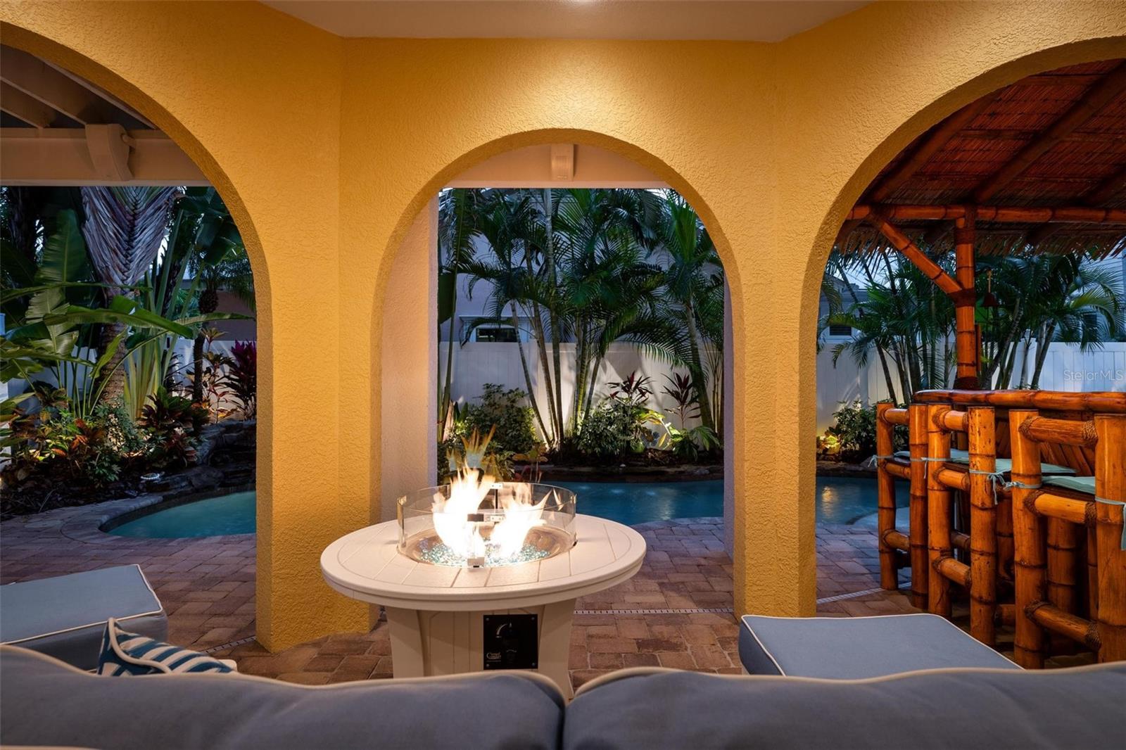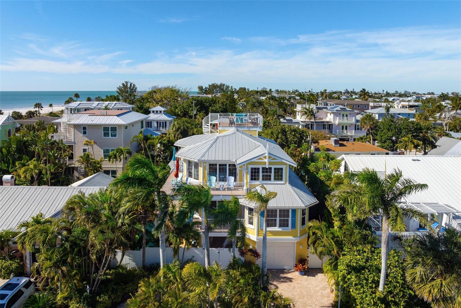 From sunrise to sunset, stunning Gulf views throughout the house. One of the most outstanding features of this property is the expansive rooftop deck—an irreplaceable amenity due to current height restrictions. From this vantage point, take in breathtaking Gulf sunsets, views of the Sunshine Skyway Bridge, and sweeping 360-degree panoramas of the island and surrounding waters. The elevated position of the street further enhances views and peace of mind. The home was thoughtfully designed by award winning architect Emily Anne Smith. The floor plan with four bedrooms, including two luxurious primary suites. Every bedroom features a private en-suite bathroom, complemented by two additional half bathrooms for a total of six bathrooms. A separate washer and dryer add convenience. The layout is designed to maximize natural light and capture views from sunrise to sunset. Both living levels feature wrap around decks with large seating and lounging areas. The second living level hosts a spacious primary suite with heated bathroom floors, a jacuzzi-style soaking tub, large shower, and dual vanities. This level also includes two additional en-suite bedrooms, plus a comfortable living area with a half kitchen featuring a sink, refrigerator, microwave, toaster oven, ample cabinetry, and a 48-bottle wine cooler—perfect for guests and family seeking privacy and independence. The third living level showcases an open-concept design with soaring ceilings, where the main kitchen, dining, and living areas all face the Gulf. Enjoy spectacular sunset and skyline views from nearly every angle. This level also features a second primary suite with a king bed and spa-like en-suite bathroom, a separate half bathroom, office workspace, and direct access to the rooftop deck. Outdoor living is equally impressive, highlighted by a resort-style pool with rock waterfall, jet stream fountain, jacuzzi jets, auto-fill system and mature tropical landscaping. A six-foot privacy fence surrounds the property. Entertain with ease at the covered tiki bar equipped with sink, refrigerator, TV, stereo, plus multiple shaded and sun-soaked seating areas. Additional features include a large garage accommodating 2–3 vehicles with 9-foot ceilings, extensive storage, workbenches, elevator, impact-rated PGT windows and doors, metal roof, low-maintenance stucco and Hardie plank exterior, heated slate kitchen floors, plus slate in entrance and storage room, bamboo flooring throughout the rest of the house, Hunter Douglas blinds, and the home is offered fully furnished and move-in ready. The home also features a monitored security system, smart thermostats and an Artificial Intelligence (AI) Camera System with DVR. Never rented, yet zoned for weekly rentals. No hurricane water intrusion in 2024. A truly rare offering on Anna Maria Island on one of the highest elevation and quietest streets with a deeded beach access.
