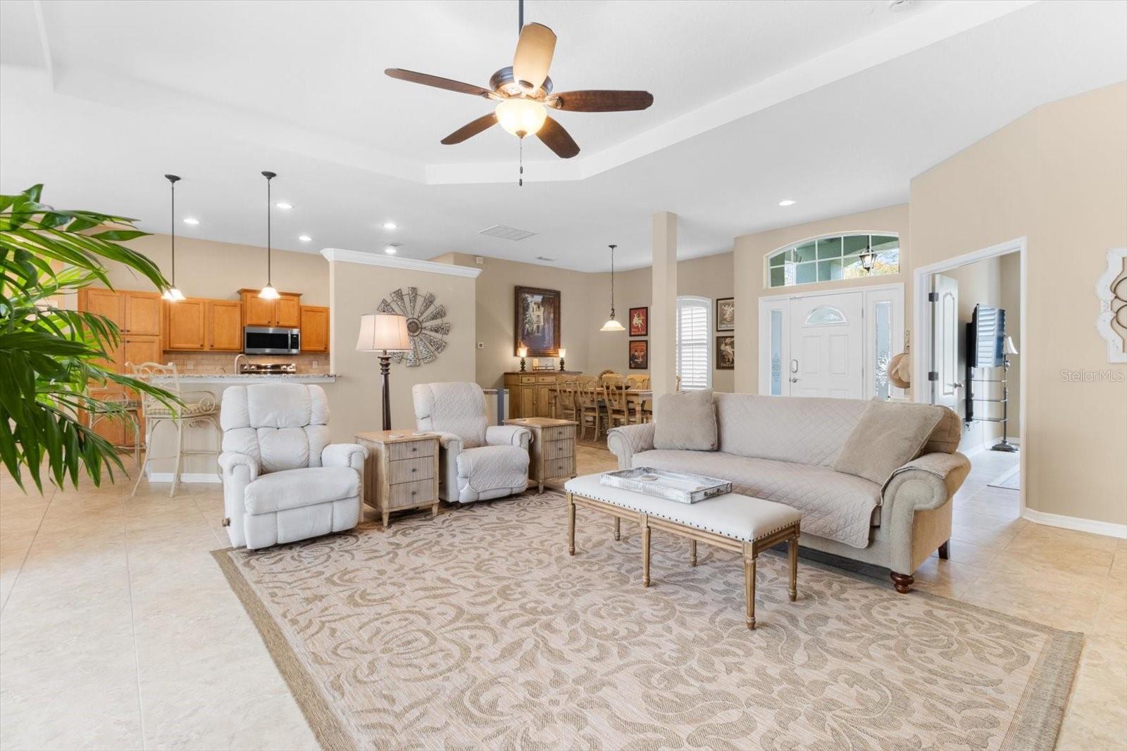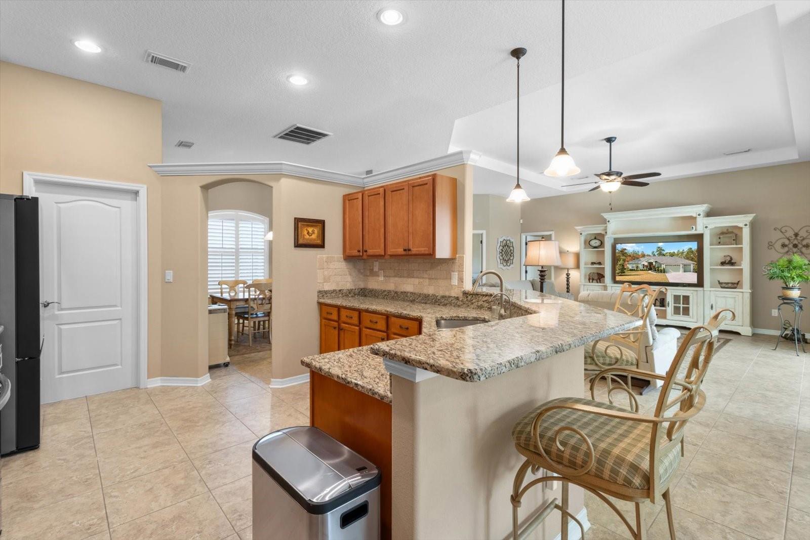 Experience the perfect harmony of luxury, functionality, and style in this stunning dream home, thoughtfully expanded to provide a versatile layout that includes a spacious den. Three well appointed bedrooms with a flex room that works as a fourth bedroom, or den. Nestled on a prime golf course lot, this home exudes elegance and modern convenience. A triple garage offers ample space for all your vehicles and toys, enhanced by overhead storage and soaring ceilings. Inside, clever electrical upgrades, keyless entry, a programmable thermostat, and a security system are just a few of the smart features designed to simplify your life. The chef’s kitchen is a masterpiece, boasting rich wood cabinetry, stone countertops, and an oversized design that includes a breakfast bar, pantry, and a cozy nook overlooking the pool—ideal for both casual meals and entertaining. Retreat to the owner’s suite, where a luxurious soaking tub and abundant storage ensure comfort and serenity. Throughout the home, details like tray ceilings, rounded bull-nose corners, and a built-in central vacuum system speak to the meticulous attention to detail. Step outside to your private oasis: a stunning new saltwater heated pool with a tanning shelf that invites relaxation and sunshine. The expansive patio area is perfect for unwinding and enjoying the tranquil views of the golf course. This home offers a seamless flow of space, designed for hosting gatherings or simply unwinding in style. Every element has been carefully considered to deliver the ultimate golf course lifestyle. Schedule your private tour today and discover a home where every detail has been thoughtfully planned for modern living and timeless elegance.
