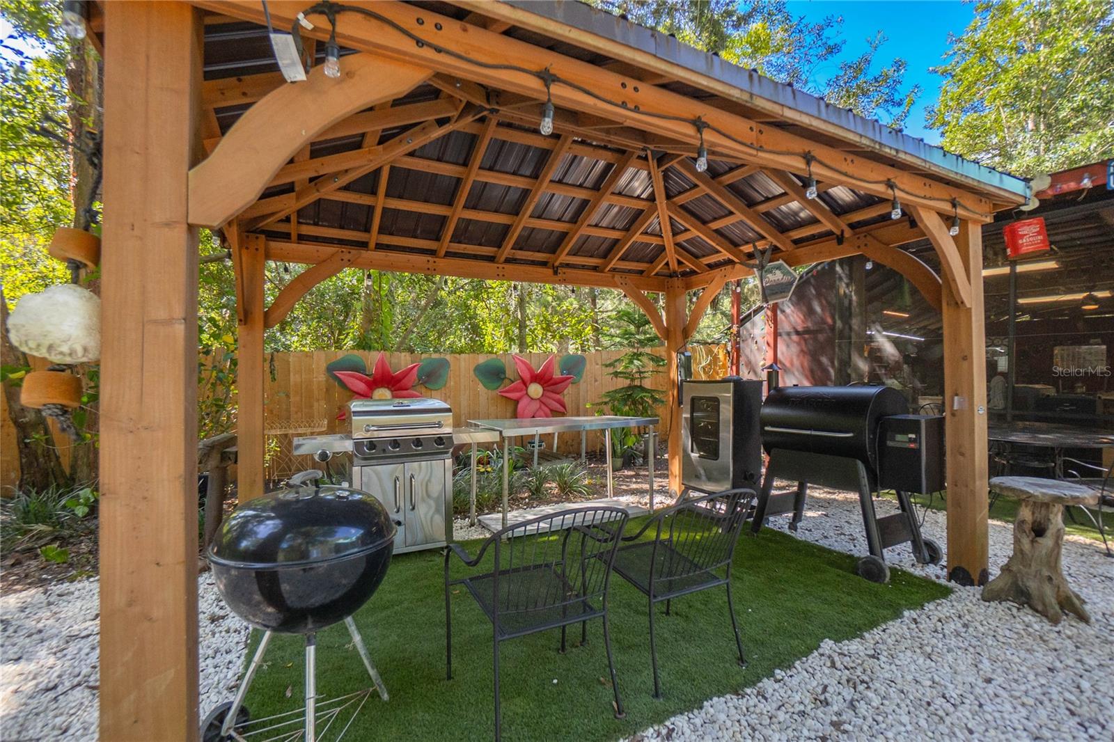Rustic Charm Meets the Florida Nature Coast-where everyday feels like a vacation! This gorgeous Western Red Cedar log cabin sits proudly on 1.16 acres of waterfront, just minutes from the Chassahowitzka boat ramp. Step inside and fall in love with the warmth and craftsmanship—soaring ceilings, exposed beams, and a floor-to-ceiling stone wood-burning fireplace that sets the tone for cozy evenings. Designed by an architect to capture natural light and highlight the beauty of log-home living, this residence features hardwood floors throughout and was thoughtfully built on a cement slab with 40” clearance for easy access to plumbing, electrical, and ductwork. The heart of the home is the brand-new gourmet kitchen—a showstopper with double ovens, gas cooktop, granite countertops, soft-close cabinetry with custom slide-outs, under cabinet lighting, and a spacious center island. The cabinetry continues into the utility room, offering additional storage and direct access to the wraparound porch—perfect for morning coffee, evening sunsets, and year-round enjoyment. Love to entertain? You’ll be the host with the most thanks to firepit seating area and a 22x30 screened outdoor kitchen equipped with a stove, large TV, and refrigerator. Overnight guests? No problem—your RV port fits two units with full hookups, while two 22x24 fully insulated storage buildings provide power, lighting, and ventilation—ideal for workshops, hobbies, or extra storage. With a covered boat dock, you can fish, kayak, or simply relax and soak in the peaceful surroundings. From peaceful mornings by the water to evenings around the fire, this one-of-a-kind retreat blends rustic elegance, modern upgrades, and true Florida outdoor living. Great opportunity for an Airbnb for those looking for something unique. Homes like this are rarely offered—don’t miss your chance to own a piece of paradise!