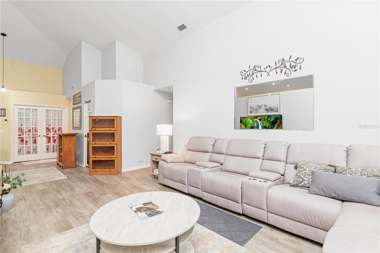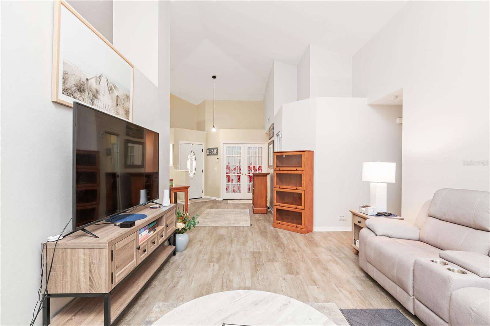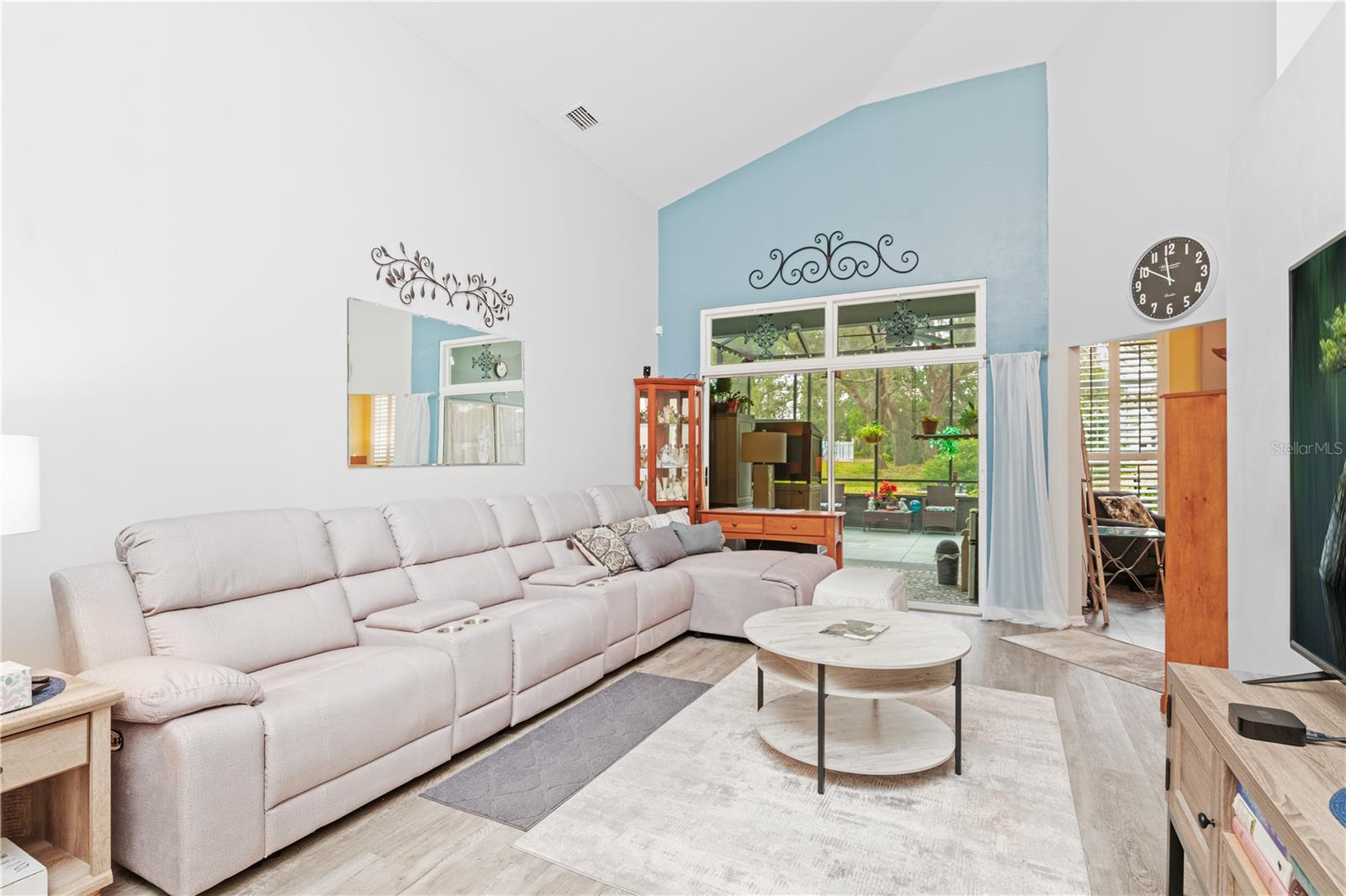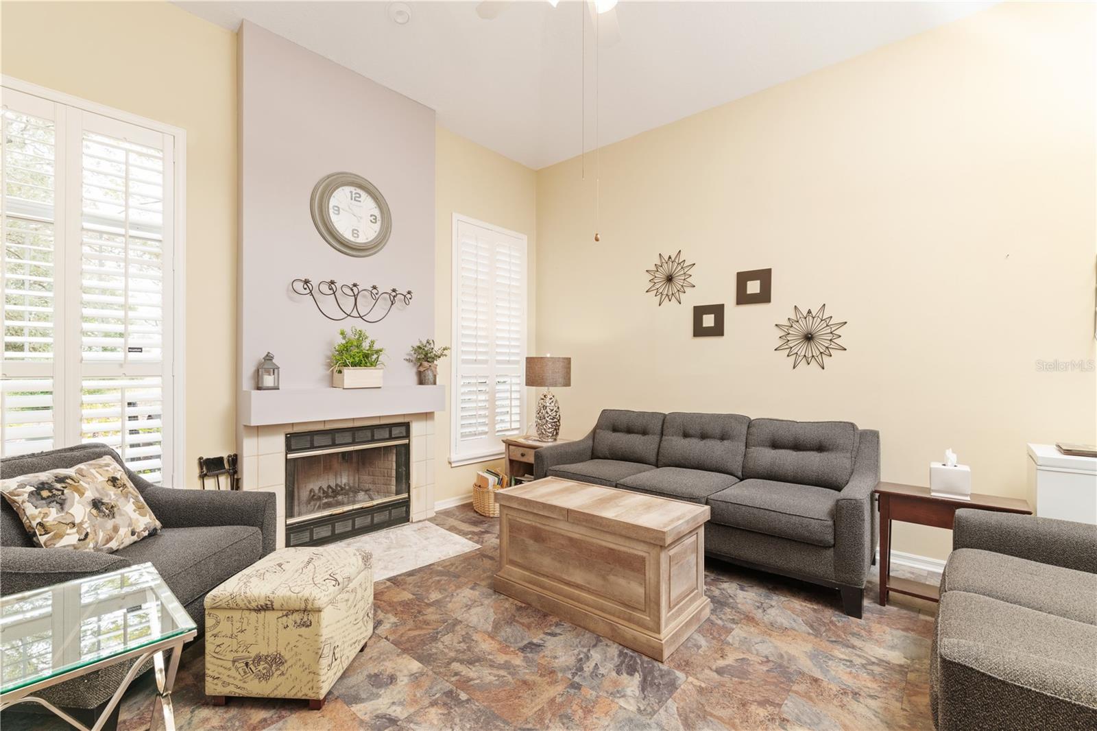 NEW walk in shower, quartz counter tops, plantation shutters and NEW A/C replaced in 02/2024. Welcome to this spacious home boasting 2062 square feet of living space, offering 3 bedrooms and 2 bathrooms. Step inside to discover new luxury vinyl plank flooring throughout. The heart of this home is its expansive living area, adorned with vaulted ceilings and a sliding glass door leading to the fully screened-in oversized lanai. As you enter, to your left is Guest Bedroom 1, featuring French doors that can easily transform it into a den or office space. To the right, the formal dining room awaits just steps away. Continuing through, you'll find Guest Bedroom 2 with a ceiling fan and ample closet space, conveniently located near the guest bathroom, complete with a single sink vanity featuring a top-mount bowl sink and a tub-shower combo. Down the same hallway, discover the indoor laundry room, equipped with a deep sink and wall-mounted cabinets, offering access to the 2-car garage. The kitchen is a highlight, boasting abundant cabinet space, a tiled backsplash, slide-in range, stainless steel appliances, and a center island. Adjacent to the kitchen is a cozy sitting room with a fireplace and sliding doors leading to the lanai. The master bedroom is a retreat of its own, featuring sliding glass doors to the lanai, a large closet, and an ensuite bathroom complete with a jetted tub, dual sink vanity, and a walk-in tiled shower. This home sits proudly on a corner lot, surrounded by beautifully landscaped grounds. Don't miss the opportunity to make this charming residence yours – schedule your showing today and seize this chance to call it home!The HOA fee includes lawn maintenance, irrigation, trash pick up as well as the Spectrum Gold cable TV package (2 HD television connections including one DVR) and WIFI with modem and wireless router.
