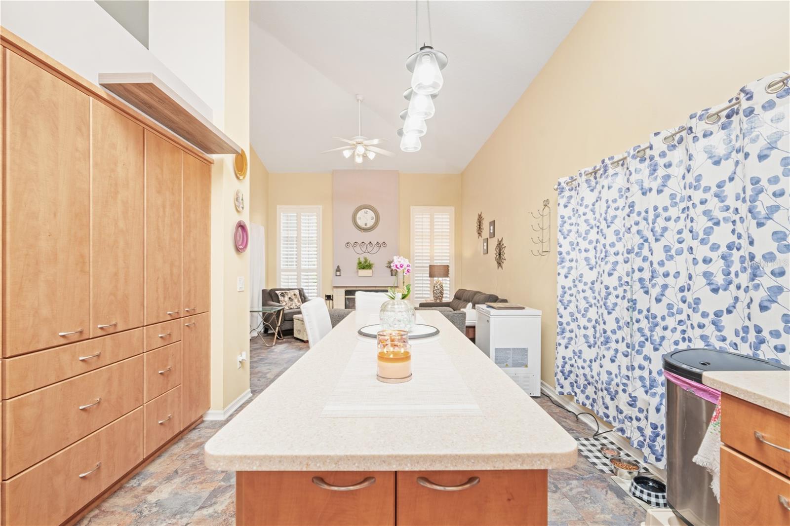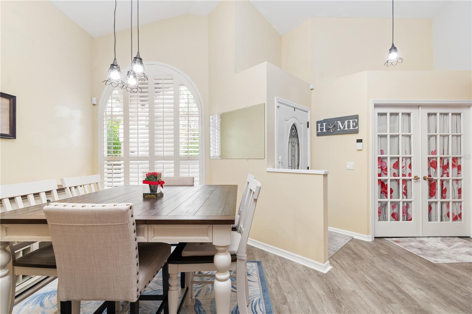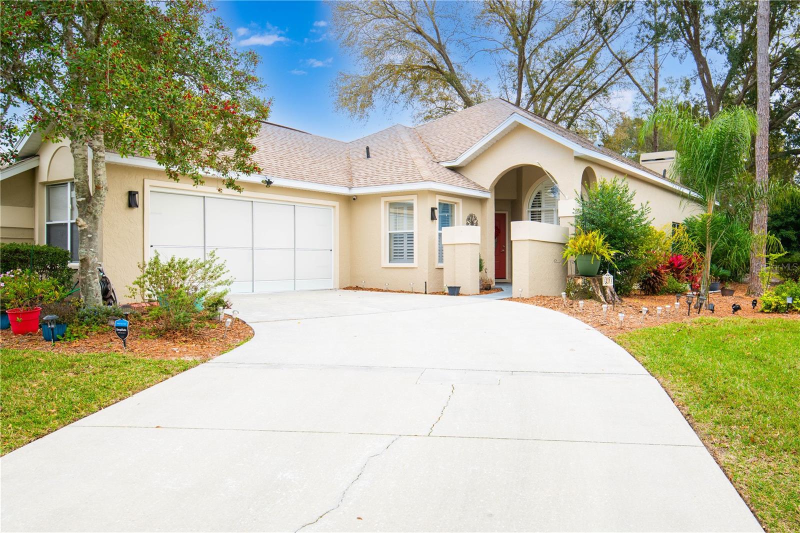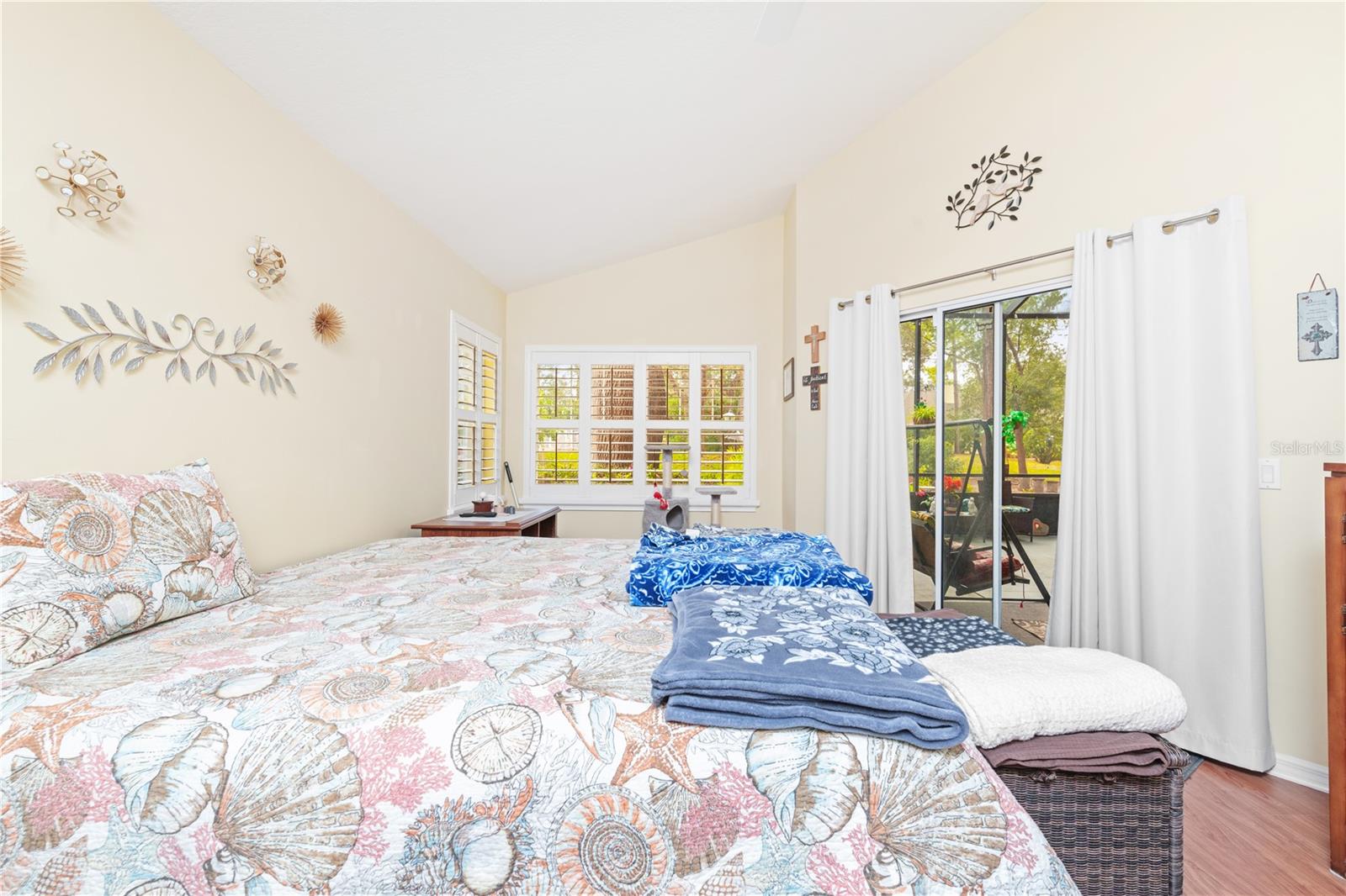 NEW walk in shower, quartz counter tops, plantation shutters and NEW A/C replaced in 02/2024. Welcome to this spacious home boasting 2062 square feet of living space, offering 3 bedrooms and 2 bathrooms. Step inside to discover new luxury vinyl plank flooring throughout. The heart of this home is its expansive living area, adorned with vaulted ceilings and a sliding glass door leading to the fully screened-in oversized lanai. As you enter, to your left is Guest Bedroom 1, featuring French doors that can easily transform it into a den or office space. To the right, the formal dining room awaits just steps away. Continuing through, you'll find Guest Bedroom 2 with a ceiling fan and ample closet space, conveniently located near the guest bathroom, complete with a single sink vanity featuring a top-mount bowl sink and a tub-shower combo. Down the same hallway, discover the indoor laundry room, equipped with a deep sink and wall-mounted cabinets, offering access to the 2-car garage. The kitchen is a highlight, boasting abundant cabinet space, a tiled backsplash, slide-in range, stainless steel appliances, and a center island. Adjacent to the kitchen is a cozy sitting room with a fireplace and sliding doors leading to the lanai. The master bedroom is a retreat of its own, featuring sliding glass doors to the lanai, a large closet, and an ensuite bathroom complete with a jetted tub, dual sink vanity, and a walk-in tiled shower. This home sits proudly on a corner lot, surrounded by beautifully landscaped grounds. Don't miss the opportunity to make this charming residence yours – schedule your showing today and seize this chance to call it home!The HOA fee includes lawn maintenance, irrigation, trash pick up as well as the Spectrum Gold cable TV package (2 HD television connections including one DVR) and WIFI with modem and wireless router.