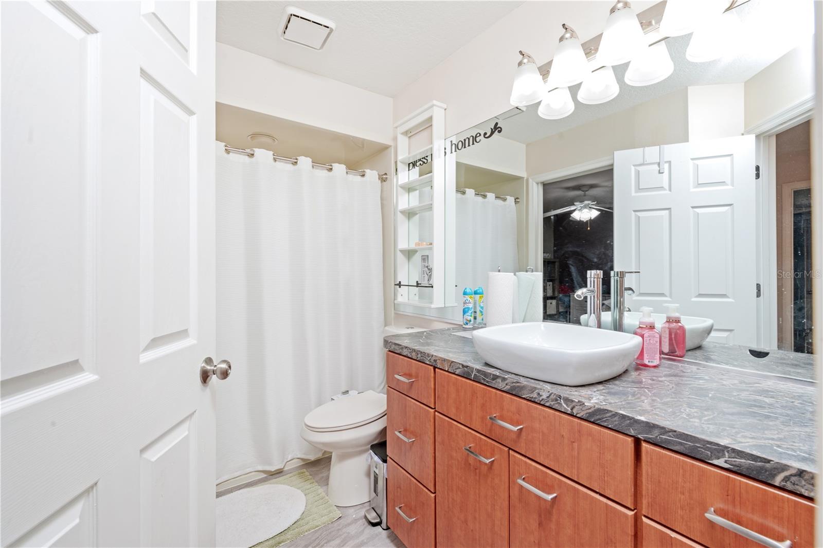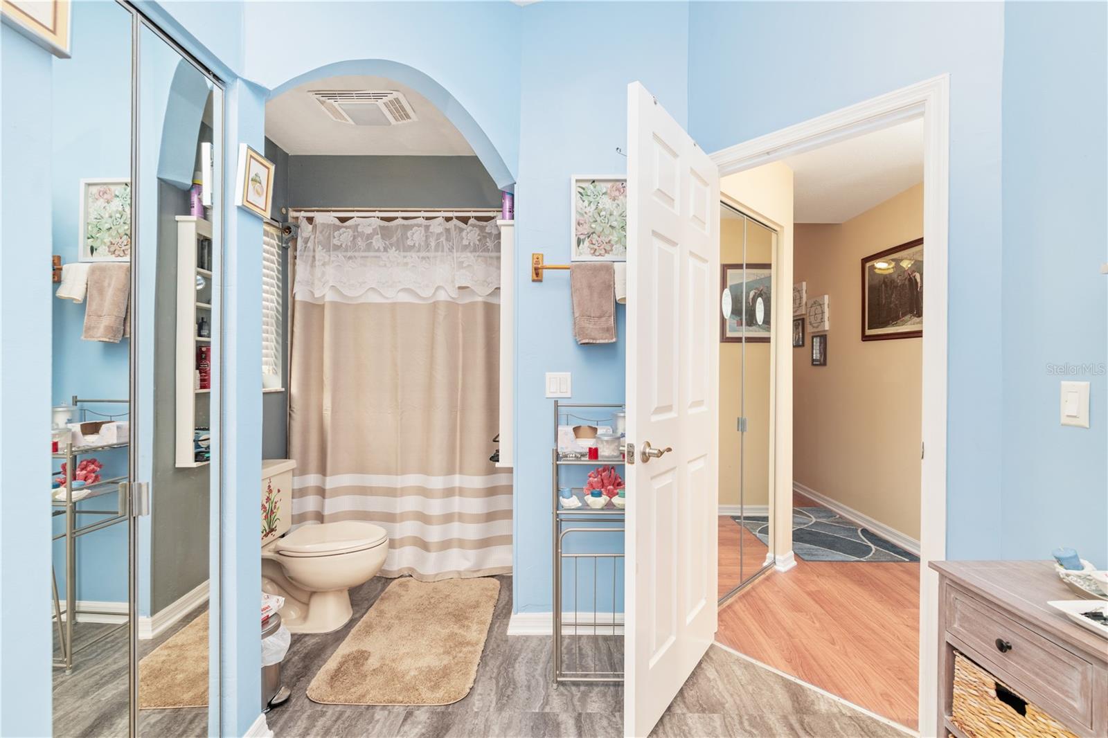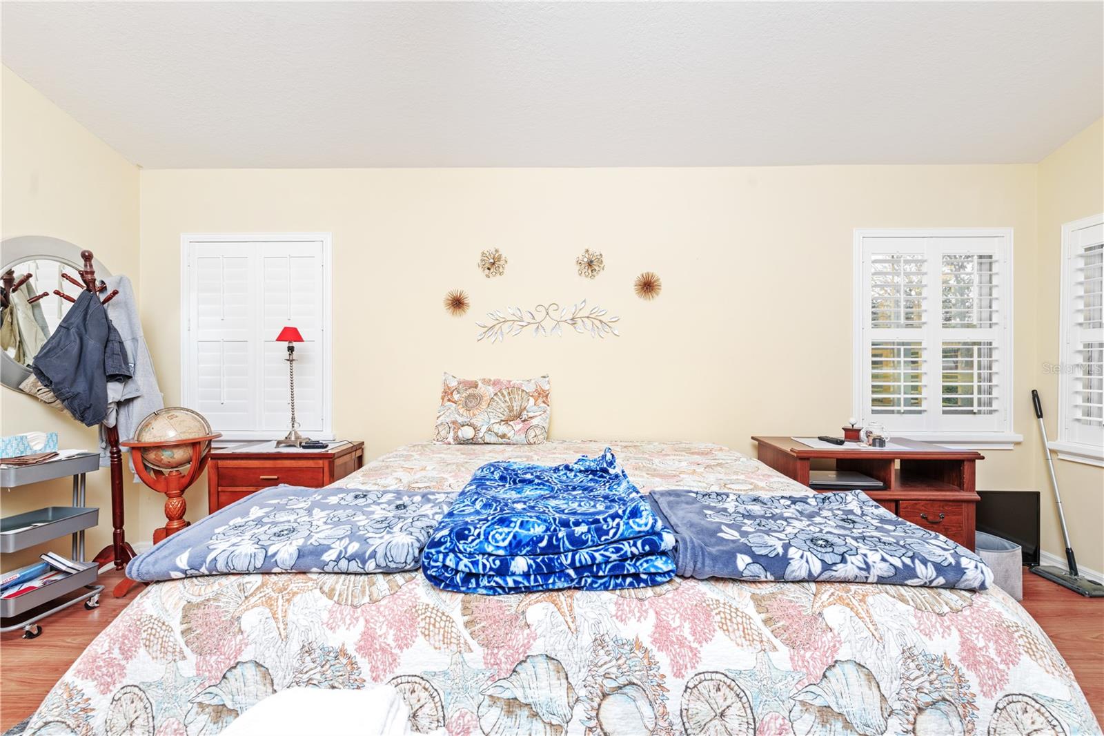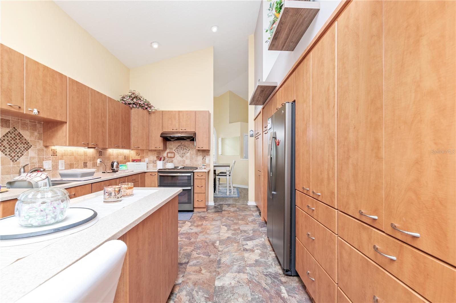 NEW walk in shower, quartz counter tops, plantation shutters and NEW A/C replaced in 02/2024. Welcome to this spacious home boasting 2062 square feet of living space, offering 3 bedrooms and 2 bathrooms. Step inside to discover new luxury vinyl plank flooring throughout. The heart of this home is its expansive living area, adorned with vaulted ceilings and a sliding glass door leading to the fully screened-in oversized lanai. As you enter, to your left is Guest Bedroom 1, featuring French doors that can easily transform it into a den or office space. To the right, the formal dining room awaits just steps away. Continuing through, you'll find Guest Bedroom 2 with a ceiling fan and ample closet space, conveniently located near the guest bathroom, complete with a single sink vanity featuring a top-mount bowl sink and a tub-shower combo. Down the same hallway, discover the indoor laundry room, equipped with a deep sink and wall-mounted cabinets, offering access to the 2-car garage. The kitchen is a highlight, boasting abundant cabinet space, a tiled backsplash, slide-in range, stainless steel appliances, and a center island. Adjacent to the kitchen is a cozy sitting room with a fireplace and sliding doors leading to the lanai. The master bedroom is a retreat of its own, featuring sliding glass doors to the lanai, a large closet, and an ensuite bathroom complete with a jetted tub, dual sink vanity, and a walk-in tiled shower. This home sits proudly on a corner lot, surrounded by beautifully landscaped grounds. Don't miss the opportunity to make this charming residence yours – schedule your showing today and seize this chance to call it home!The HOA fee includes lawn maintenance, irrigation, trash pick up as well as the Spectrum Gold cable TV package (2 HD television connections including one DVR) and WIFI with modem and wireless router.