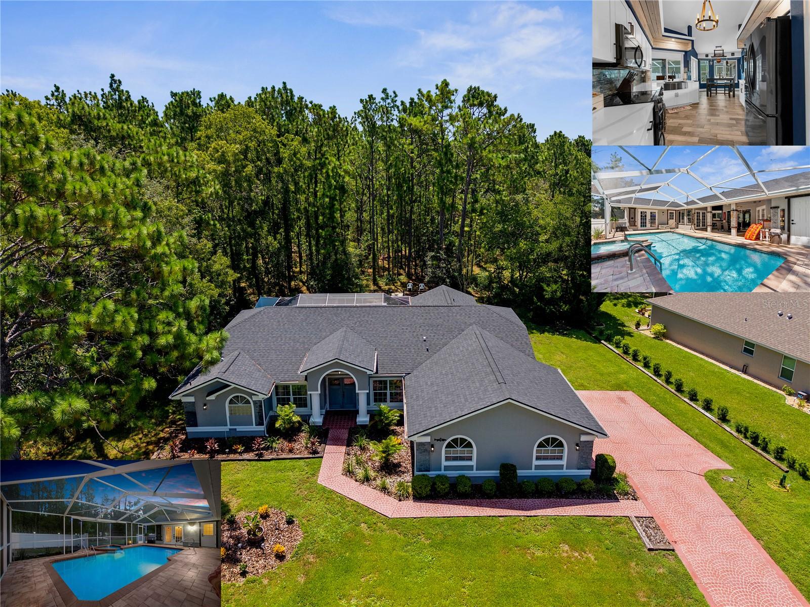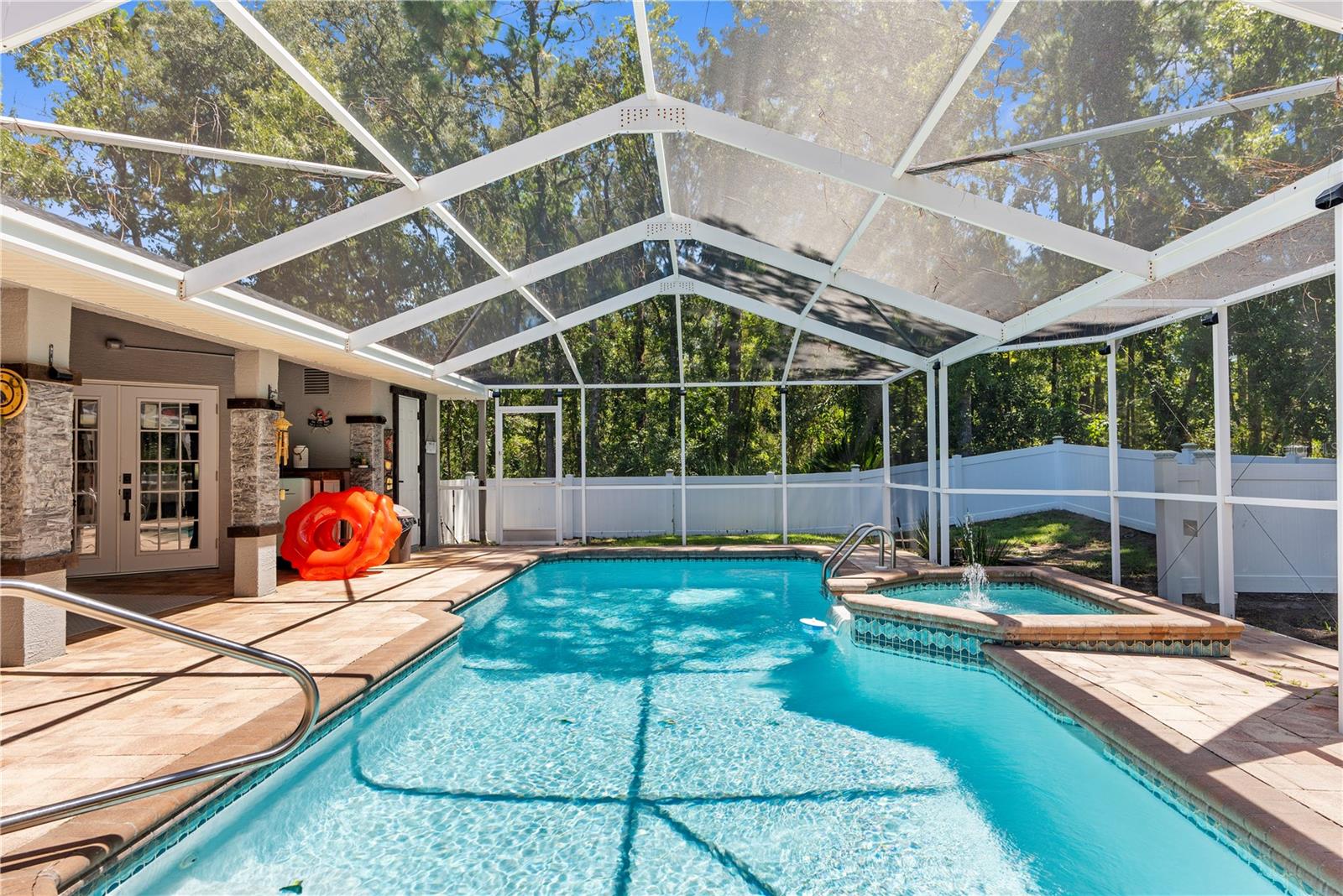 MOVE IN READY! Free one year HOME WARRANTY! 3 bedroom + LARGE bonus room! Tucked away at the end of a peaceful cul-de-sac and backing up to a tranquil wooded preserve, this beautifully updated POOL home offers privacy, style, and seamless indoor-outdoor living. With a newer roof (2021) and thoughtful upgrades throughout, this residence is truly move-in ready. A decorative paver driveway leads to a side-entry two-car garage and double front doors beneath a charming covered entry. When you walk into the home you will discover the main living areas filled with natural light, creating a bright and airy atmosphere. The desirable floor plan includes a spacious family room, formal dining area, and a separate living room/kitchen/breakfast nook combo—perfect for both daily living and entertaining. The chef’s kitchen is a true showstopper, featuring custom white shaker cabinetry, gleaming quartz countertops, stainless steel appliances, a breakfast bar, and stylish wood flooring throughout the main spaces. French doors off the breakfast nook open to a private screened-in lanai with a heated pool and spa, paver decking, and a pass-through window to the kitchen—your personal backyard oasis for year-round entertaining. Enjoy cool evenings by the outdoor fireplace on the covered back porch or take a stroll down the winding path through the backyard, past the fenced dog run, to a serene retreat nestled among the trees. Expansive primary suite, featuring cathedral ceilings, a sliding barn door to a spa-inspired ensuite bath with dual vanities, soaking tub, walk-in shower, and large walk-in closet. Two additional guest bedrooms and a versatile flex space—ideal for a home office, gym, media room, or fourth bedroom—complete the layout. Just a few miles to the Suncoast Parkway for an easy commute to Tampa, and close to some of Florida’s best natural attractions: Crystal River, where you can see manatees, paddle through crystal clear spring fed waters, visit shops and local restaurants downtown. Homosassa Springs Wildlife State Park for enjoying wildlife up close, and Fort Island Gulf Beach, if you’re looking for a peaceful, laid-back, and perfect place to catch a sunset over the Gulf. This is more than a home—it’s a lifestyle of comfort, tranquility, and everyday luxury