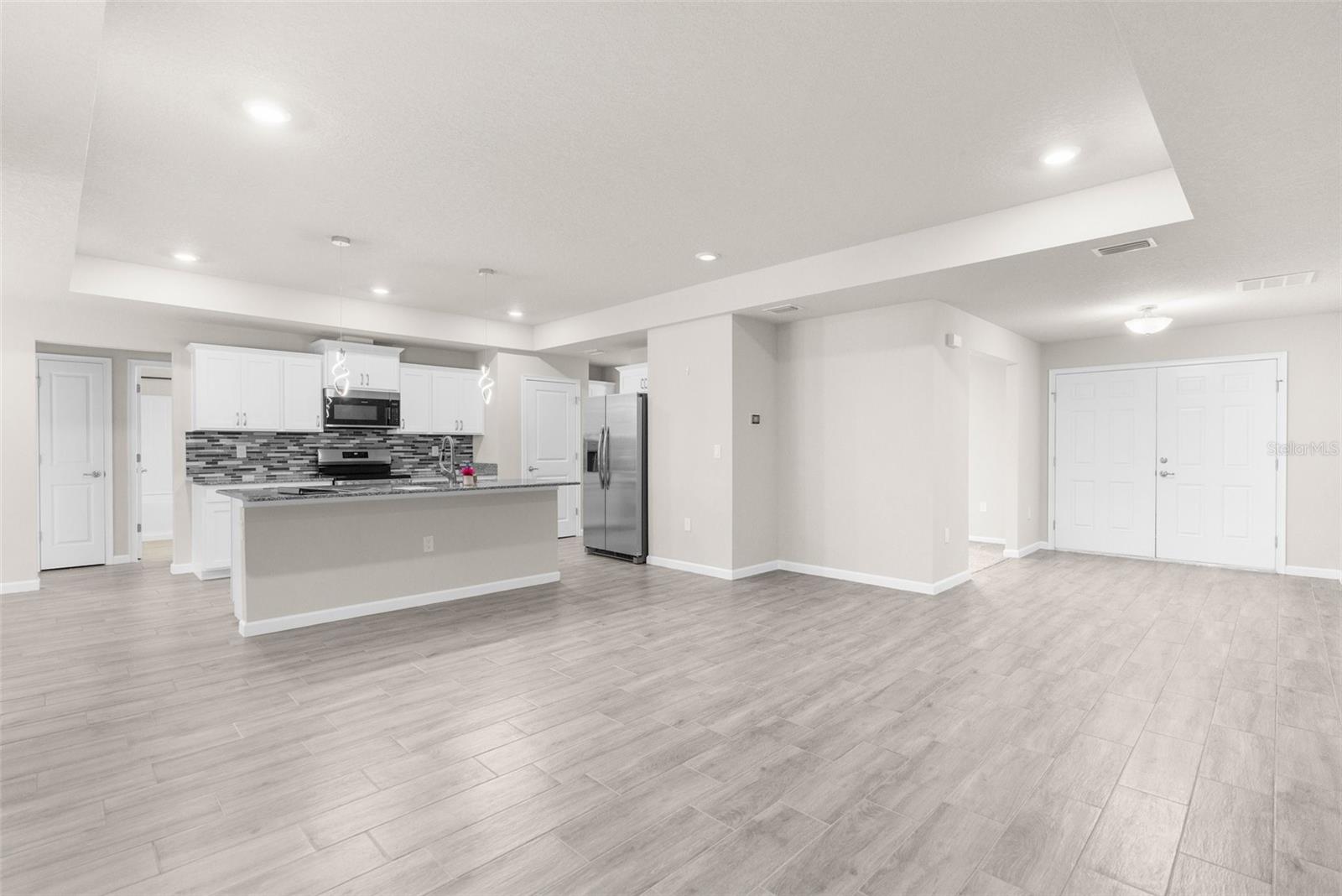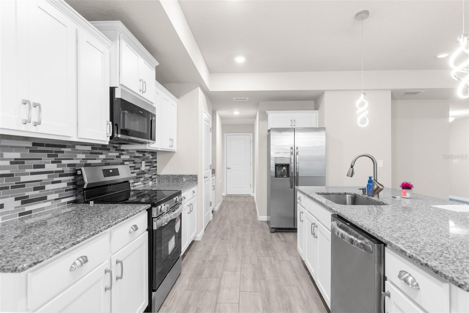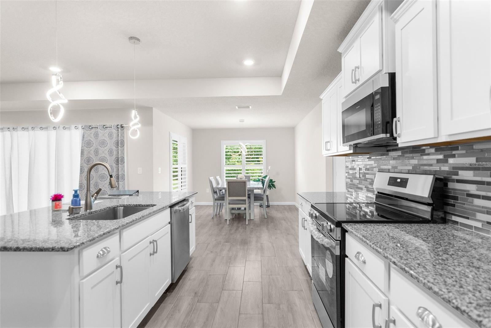 This stunning home built in 2022 on .33 of an acre, 3-bed, 2-bath home with a bonus room for an office or extra bedroom is a masterpiece of luxury living, offering elegance, comfort, and outdoor entertainment. Inside you will find the heart of this home is the open kitchen, featuring granite countertops and backsplash with brand new never used Frigidaire appliances. Kitchen overlooks the living room, dining room and back porch which is perfect for entertaining. Ceramic tile flows seamlessly throughout the main living areas and bathrooms and carpet for the comfort of the bedrooms. The master bedroom has 2 walk-in closets with plenty of space, and the luxurious master bath, featuring a large shower, his and hers sink, and extra storage closet. Three large guest bedrooms and an updated guest bath provide ample space for family and guests. Additional features include beautiful high end Norman brand plantation shutters, and an oversized 2-car garage, an extended drive for extra parking space, and landscaping irrigation system. Enjoy the convenience of an indoor laundry room. Conveniently located just minutes from shopping, the Suncoast Parkway, golf courses, this home offers the perfect blend of luxury and convenience. Don't miss your chance to own this exquisite home.