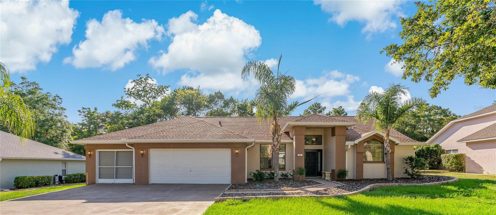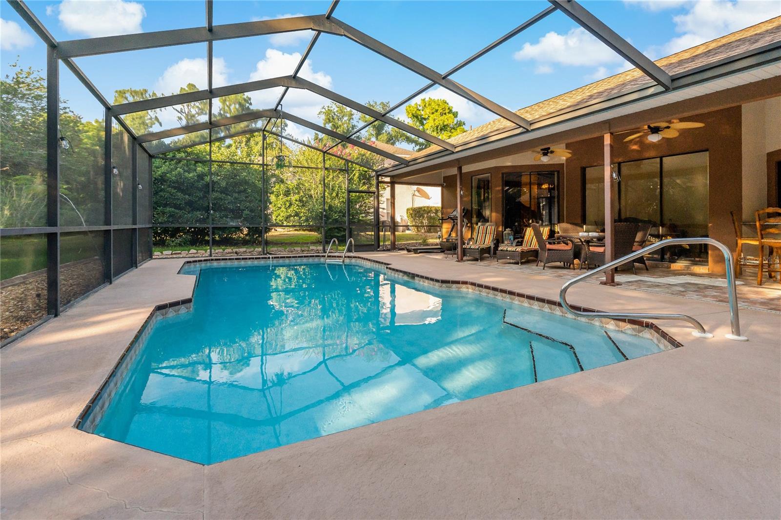 This Gorgeous POOL Home located in the Golf Community of Sugar Mill Woods is ready and waiting for YOU! Situated in the desirable Cypress Village, this well-designed home offers over 2,000 square feet of living space, including 3 bedrooms, 2 full bathrooms, a large eat-in kitchen, and an open floor plan concept. The property boasts a huge private backyard on conservation land, complete with gardens featuring concrete border edging. Inside, you'll find granite countertops throughout that complement the custom cabinetry in the kitchen and bathrooms. Majestic High Spanish Lace Ceilings add a special touch of elegance. Multiple sliding glass doors lead out to the Heated Salt Water Pool and Lanai, where you'll find plenty of covered space for tables and chaise lounges, complete with overhead fans to keep you cool. A pass-through sliding window from the kitchen to the pool bar adds convenience for serving food and beverages, with additional seating available. The massive 3-car garage features all new electric door openers and a service door to the backyard for easy access to lawn equipment. An ECO Smart Tankless Water Heater is mounted on the wall, providing hot water on demand and saving space compared to traditional large holding tanks. Several improvements have been made to the home in 2023, including a New 50-Year Shingle Roof, Gulf Stream Pool Heater, Salt Water Pool System, Updated Irrigation System, New Bosch Dishwasher and Range, and an Entire Interior Paint Job. This home is truly MOVE-IN READY! The community offers a tranquil lifestyle with many nearby amenities, including shops, grocery stores, restaurants, Fort Island Beach, and Crystal River Boating. If this home sounds like a good fit for you, please schedule your showing today as properties like this tend to sell quickly!