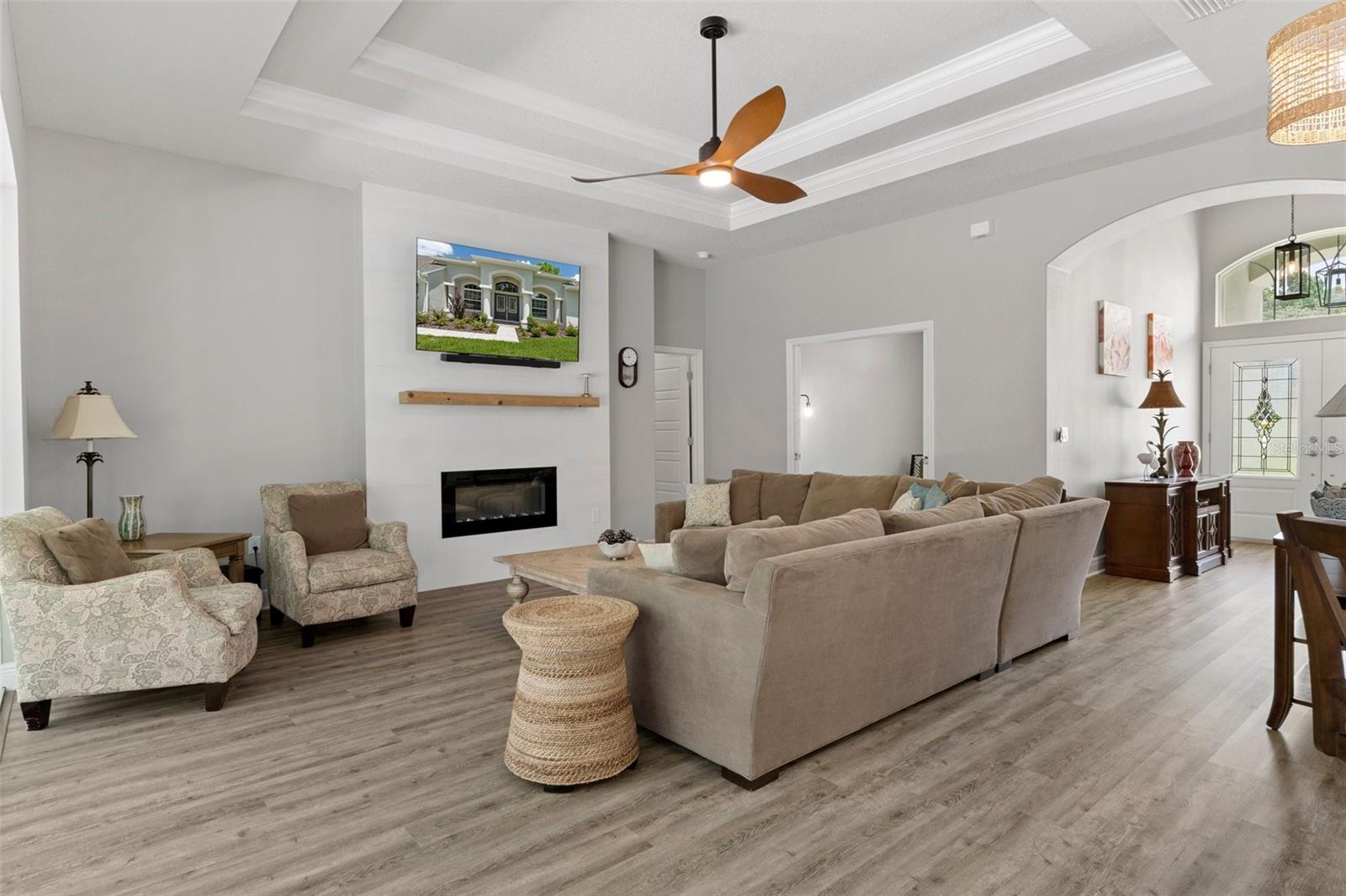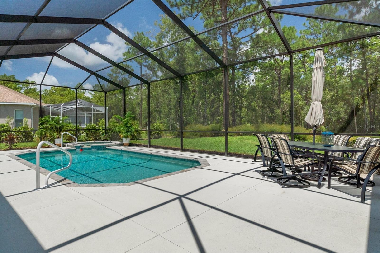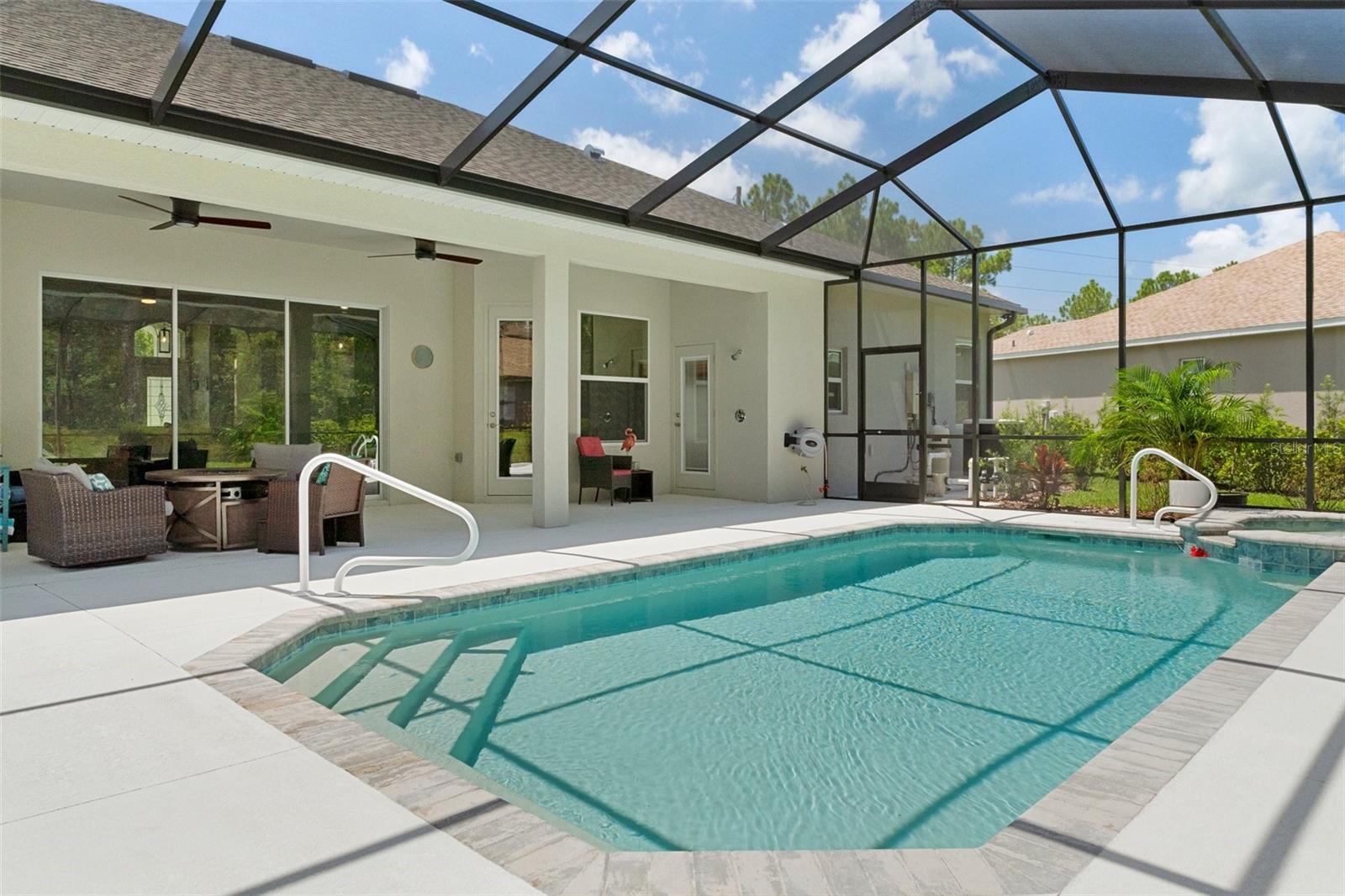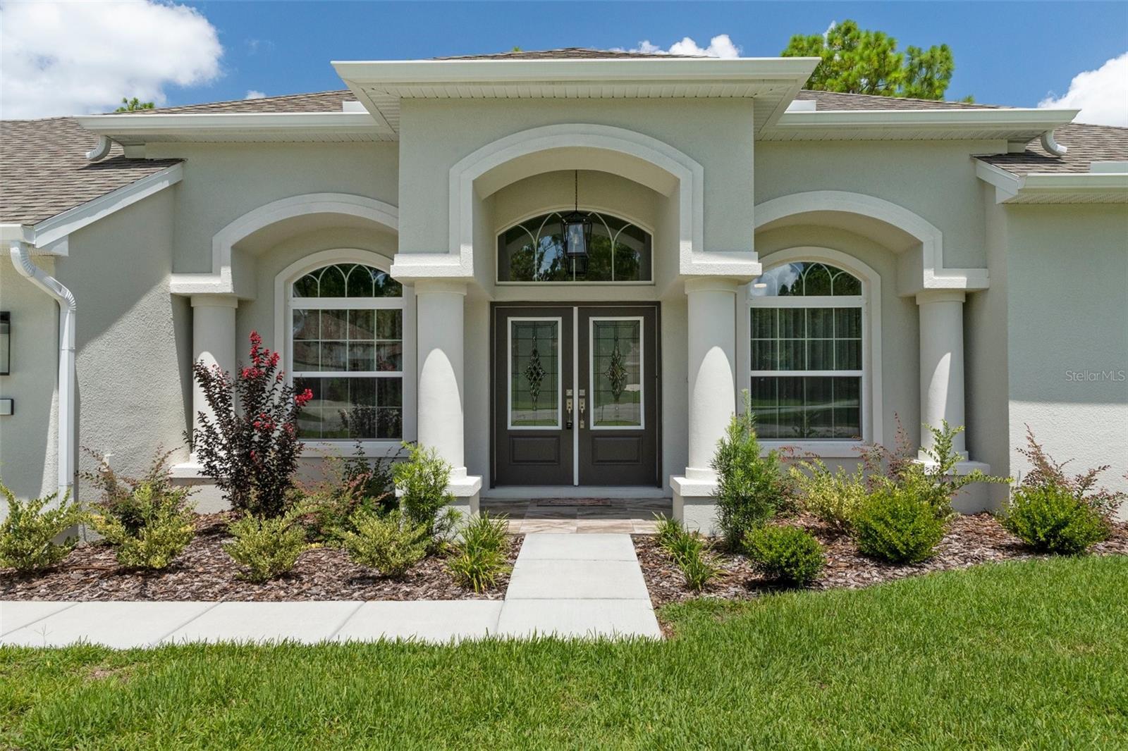 Welcome to 54 Daisy Street, a 2024-built and extended Chesterfield model by Royal Coachman. It's ideally situated on a .38-acre corner lot in the Oak Village of Sugarmill Woods, just minutes from the Veterans Expressway and Highway 19. Step into the foyer of this beautiful home and be swept away with the luxury that surrounds you. An open concept with architectural variety, this home offers a large dining room and a great room that provides a full view of the sparkling (and HEATED) pool and hot-tub through triple sliding-glass doors. It boasts high tray ceilings, crown molding, a fireplace, luxury vinyl floors, extra-wide baseboards, a breakfast nook with a coffee bar and large windows and a door to the back lanai and pool areas. And let's talk KITCHEN. This beauty has 42-inch wood cabinets topped with granite, deep drawers for easy access to pots and pans, pullout shelving, upgraded stainless steel appliances, a walk-in pantry, and much, much more. The primary bedroom, with its extended square footage, has room for reading chairs or exercise equipment and offers double walk-in closets. That's not all. The primary bath feels like a spa with its free-standing tub, HUGE shower, and separate vanities. Can there be more, you ask? Absolutely, there can be more! We haven't even talked closets, and this home is designed with storage in mind. You won't be disappointed when you unpack your things, and the oversized three-car garage has epoxy floors and an extra workspace / storage area. The attic access is complete with a pull-down ladder, and the attic itself is finished to provide lots of room for those seasonal items. The front exterior entryway has travertine tile under foot and double doors for an easy move-in day, and the massive 30'4" x 10' back lanai is complete with a barbecue area and exterior shower. The yard is landscaped and has a sprinkler system, and there are gutters on both the front and back of the home. FURNITURE IS NEGOTIABLE (excluding sectional and coffee table). This lovely property is a must see. Make your appointment today!
