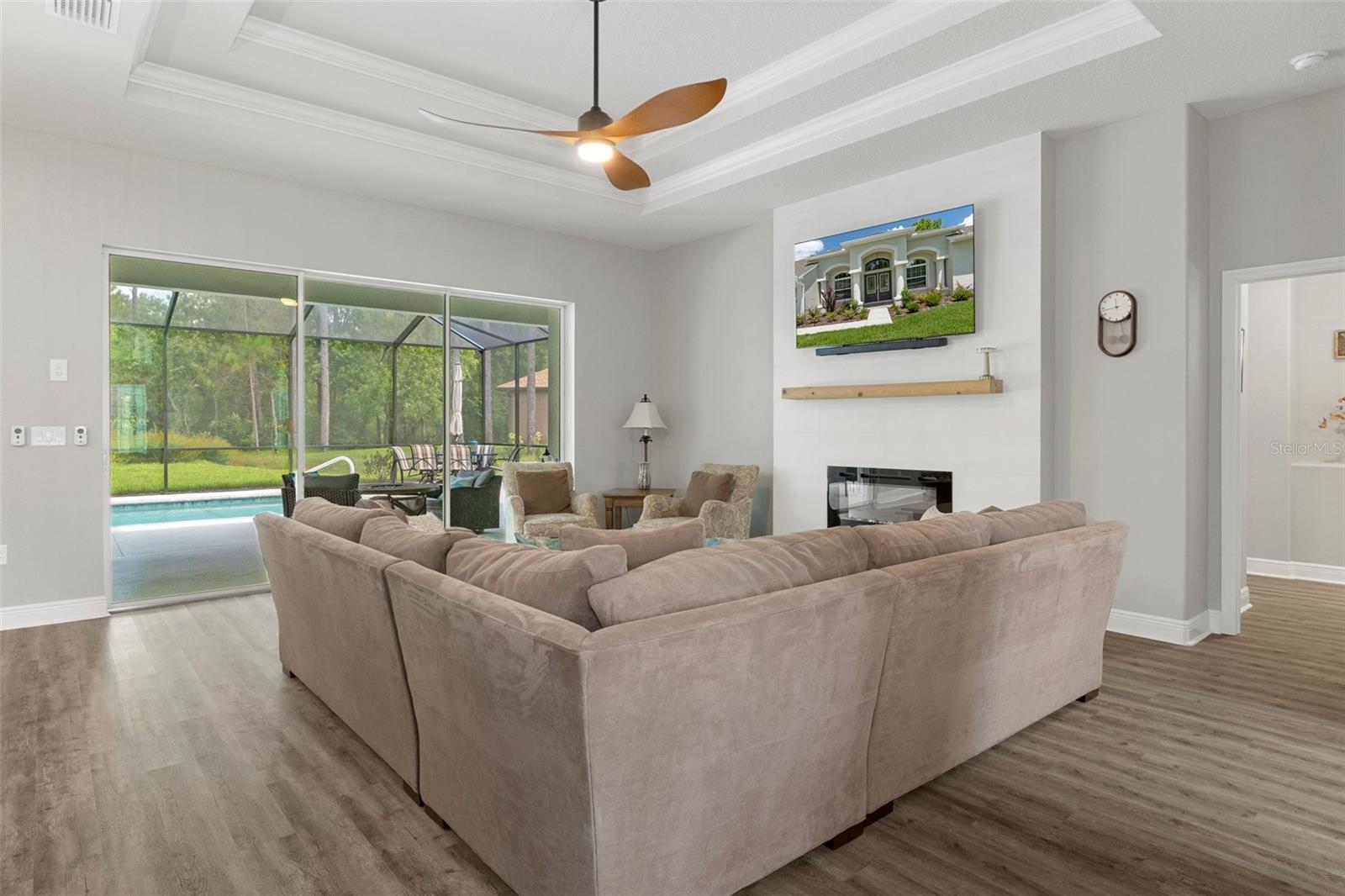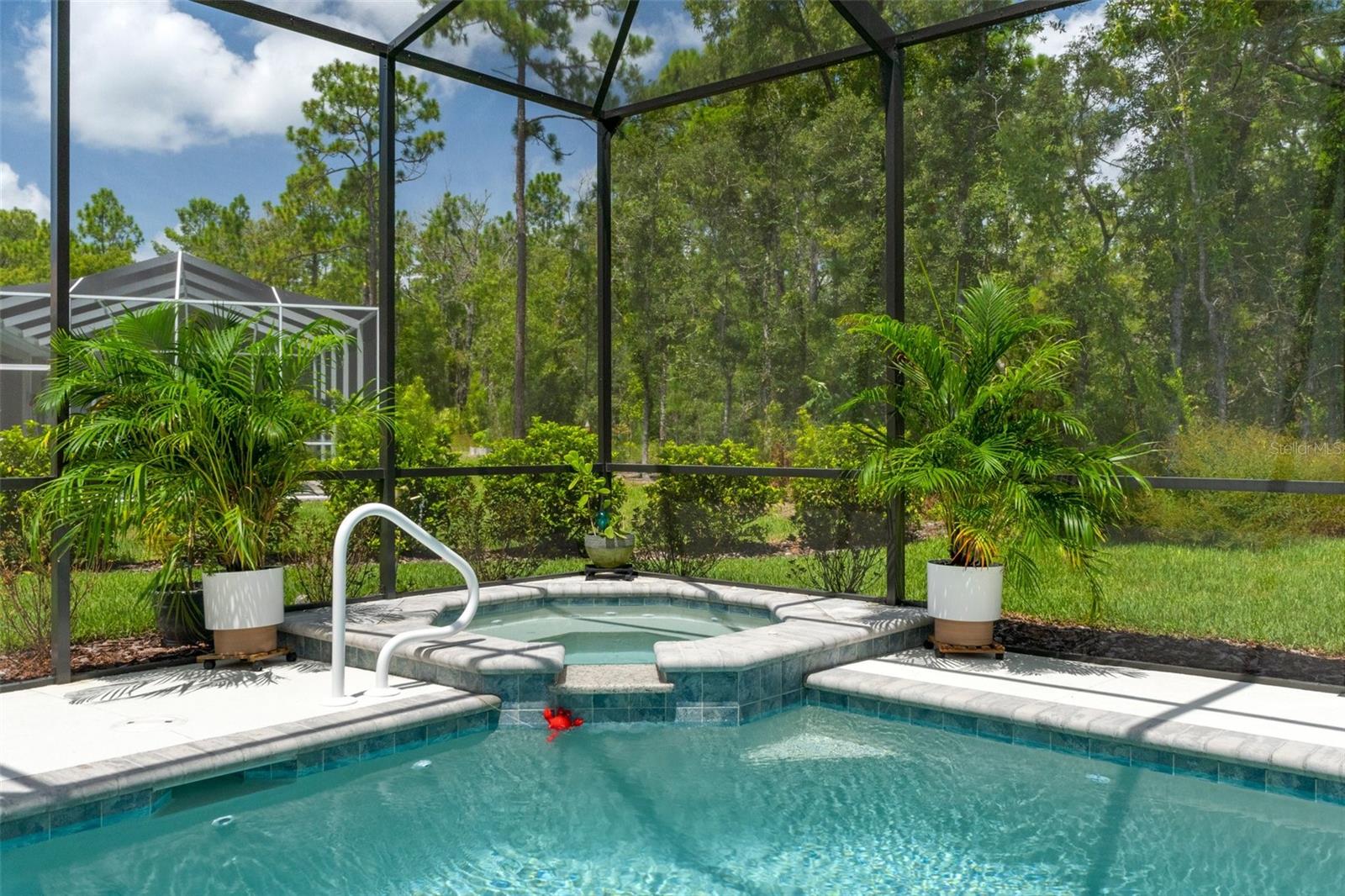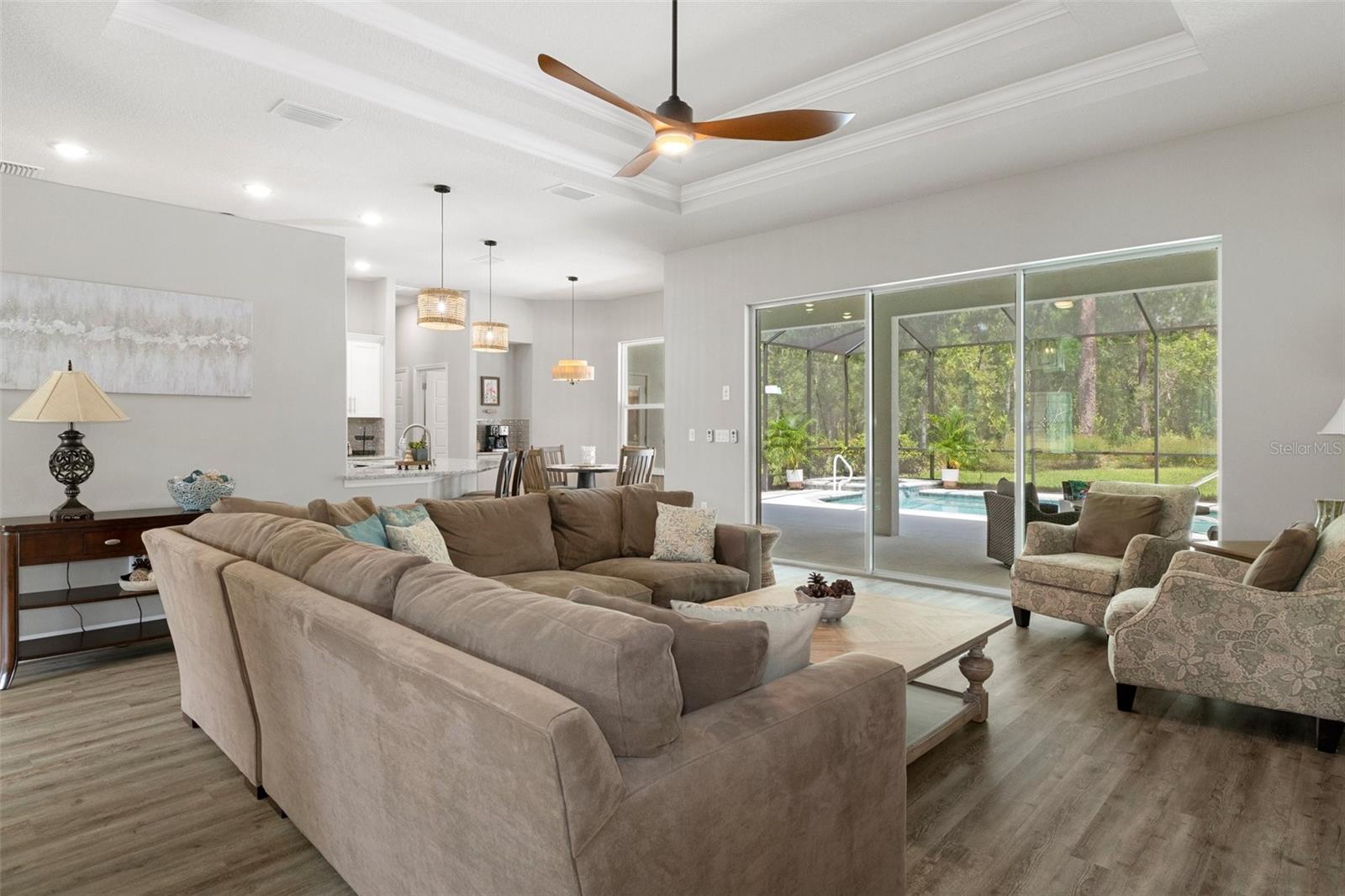 Welcome to 54 Daisy Street, a 2024-built and extended Chesterfield model by Royal Coachman. It's ideally situated on a .38-acre corner lot in the Oak Village of Sugarmill Woods, just minutes from the Veterans Expressway and Highway 19. Step into the foyer of this beautiful home and be swept away with the luxury that surrounds you. An open concept with architectural variety, this home offers a large dining room and a great room that provides a full view of the sparkling (and HEATED) pool and hot-tub through triple sliding-glass doors. It boasts high tray ceilings, crown molding, a fireplace, luxury vinyl floors, extra-wide baseboards, a breakfast nook with a coffee bar and large windows and a door to the back lanai and pool areas. And let's talk KITCHEN. This beauty has 42-inch wood cabinets topped with granite, deep drawers for easy access to pots and pans, pullout shelving, upgraded stainless steel appliances, a walk-in pantry, and much, much more. The primary bedroom, with its extended square footage, has room for reading chairs or exercise equipment and offers double walk-in closets. That's not all. The primary bath feels like a spa with its free-standing tub, HUGE shower, and separate vanities. Can there be more, you ask? Absolutely, there can be more! We haven't even talked closets, and this home is designed with storage in mind. You won't be disappointed when you unpack your things, and the oversized three-car garage has epoxy floors and an extra workspace / storage area. The attic access is complete with a pull-down ladder, and the attic itself is finished to provide lots of room for those seasonal items. The front exterior entryway has travertine tile under foot and double doors for an easy move-in day, and the massive 30'4" x 10' back lanai is complete with a barbecue area and exterior shower. The yard is landscaped and has a sprinkler system, and there are gutters on both the front and back of the home. FURNITURE IS NEGOTIABLE (excluding sectional and coffee table). This lovely property is a must see. Make your appointment today!