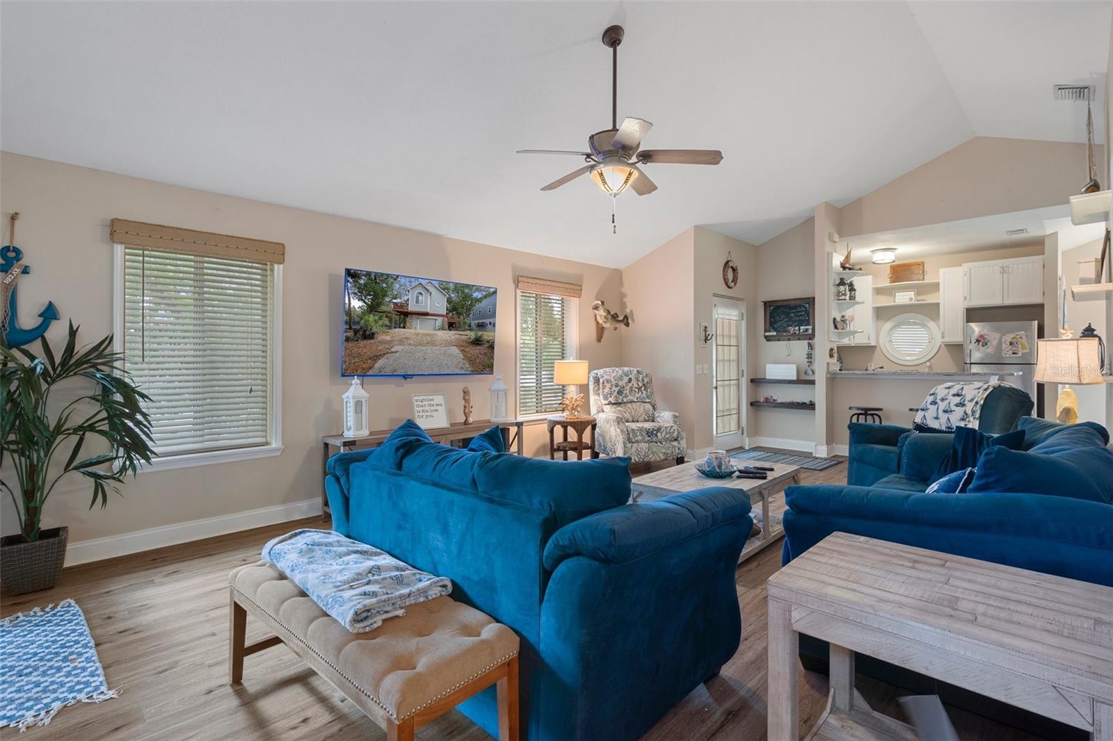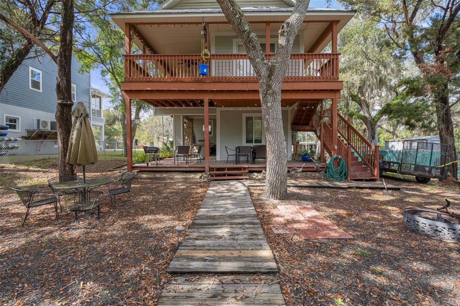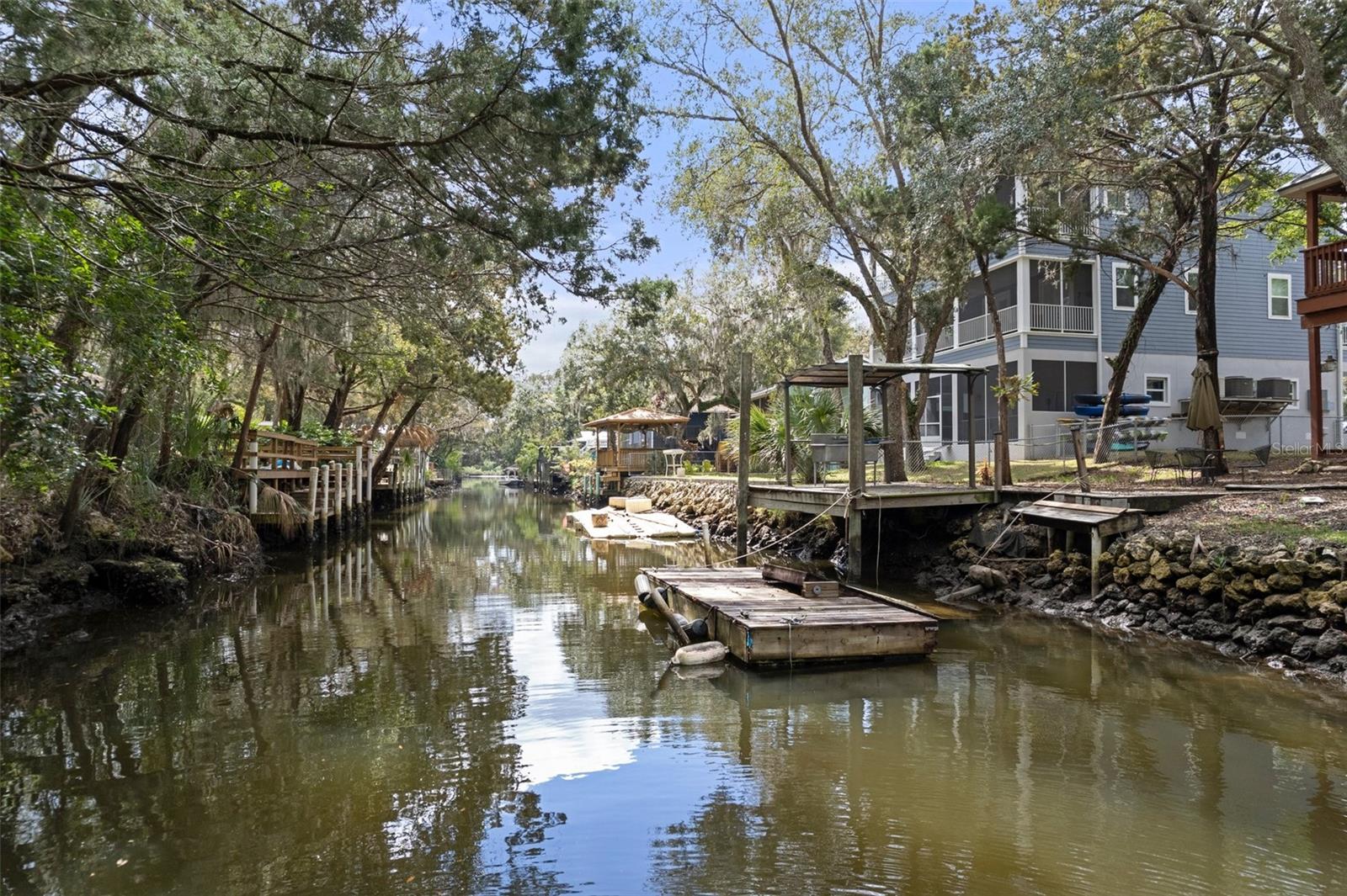 Discover your dream waterfront oasis with this stunning 3-bedroom, 2-bathroom home, located just 700 feet from direct Gulf access. As you step through the raised front entry, you’re welcomed into a bright and spacious living room featuring cathedral ceilings, stylish plant shelving, an updated ceiling fan, and an abundance of natural light. The beautifully designed kitchen makes entertaining effortless, showcasing sleek stone countertops, modern cabinetry, stainless steel appliances, and a convenient eat-in breakfast bar. Adjacent to the kitchen, the 15x9 dining room offers a seamless transition to the first of two balconies—an ideal spot for morning coffee while soaking in the serene views of Florida’s native wildlife. Escape to the tranquil master suite located on the second main living floor, complete with cathedral ceilings, generous closet space, and private access to the second balcony overlooking the backyard and picturesque canal. Just outside the master bedroom, the main bathroom boasts a tub/shower combination and a spacious single vanity. Guests will appreciate the thoughtful layout, offering privacy and comfort. The first guest bedroom, situated on the second level, features direct access to the first balcony. Meanwhile, the second guest bedroom on the ground level provides added seclusion, easy access, ample storage, and an en-suite bathroom with a tiled shower and modern vanity. Experience true Florida living on the expansive 26x19 open rear porch, which leads to an inviting wooden dock complete with a fish cleaning station. Additional highlights of this exceptional property include a durable metal roof, raised HVAC system, low-maintenance vinyl plank flooring throughout, extra boat parking, and so much more. Don’t miss out on this rare waterfront gem! Who do you know that’s ready to make this paradise their new home? Call us today to schedule a private showing!