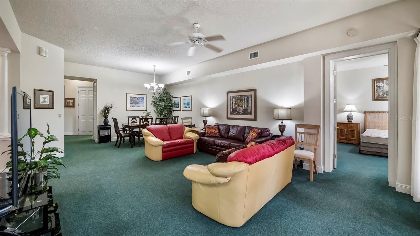 TURNKEY. This Mission Resort Condominium is completely furnished and ready for you to enjoy. Beautiful views of the fifth fairway and ponds of the Famous El Campeon golf course at Mission Resort and Club. Enjoy beautiful sunsets and mature landscaping as nearly all rooms look out to the golf course. Spacious 2 bedroom, 2-bathroom unit with a combo living- dining room area. Breakfast can be enjoyed from the sit down bar area of the kitchen or breakfast room. The primary bedroom has two walk in closets. The primary bath has dual sinks, separate shower and a garden tub. This condo is located close to the 20x32 foot community heated pool. Mission Inn has multiple restaurants located on property with both indoor and outdoor dining. The two golf courses take advantage of rolling hills and elevations in its central Florida location. Memberships are available should you like to play pickle ball, tennis, spend time in a fitness room or take part in skeet and trap, or exercise in the fitness room. Enjoy life in beautiful Howey in the Hills. Easy access to Lake Harris on the Chain of Lakes - offering wonderful boating & fishing. Only a short distance to the Library, restaurants, spas and salons. You are steps from the nature preserve, lake front park, playground, fishing pier or launch your boat from the public boat ramp (small fee). This property is the perfect combination of small town living with big city access. You'll be surprised by how close you are to major grocery stores, home improvement/hardware stores, a world class golf course, and the charming shops/restaurants of neighboring communities. You're just minutes from the Turnpike for an easy commute to Orlando, Orlando Airport, Walt Disney World, Sea World & Universal attractions-all within 40 minute drive.