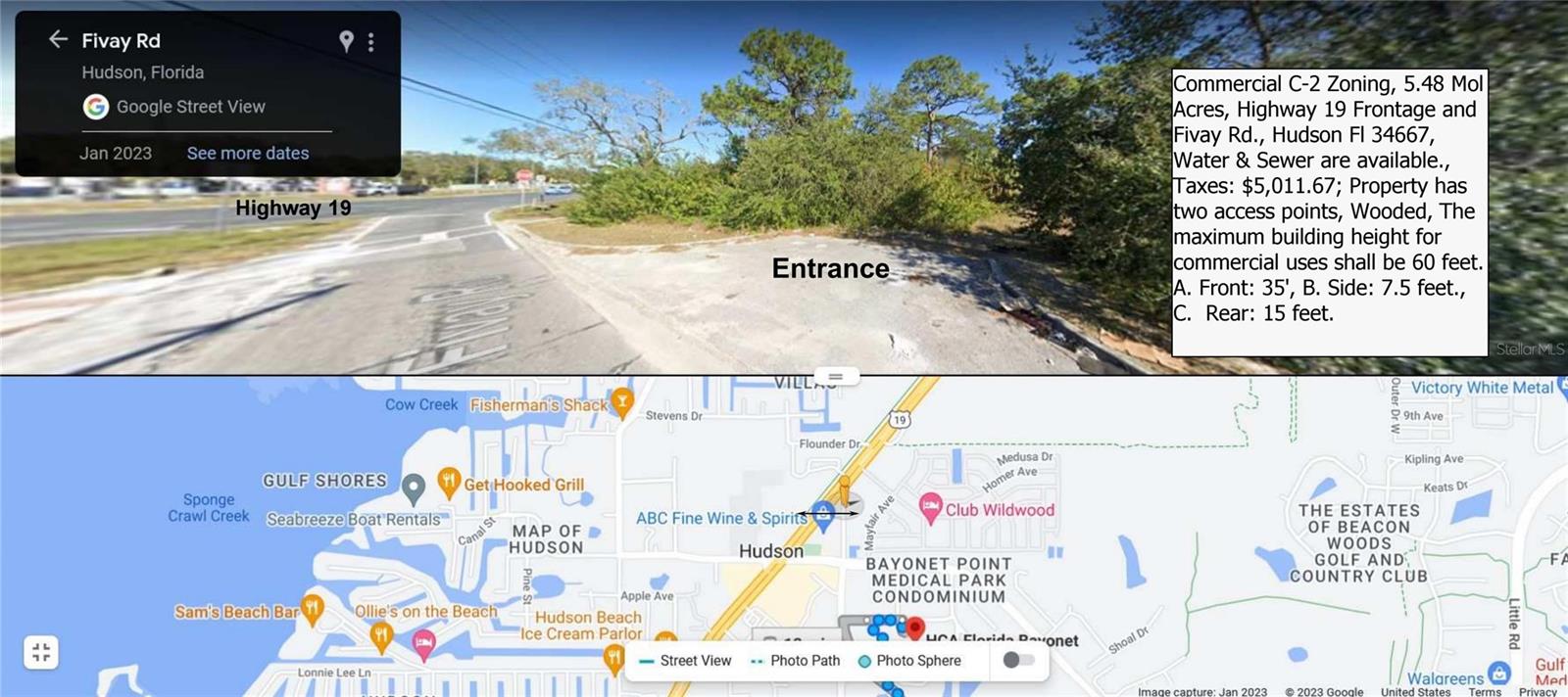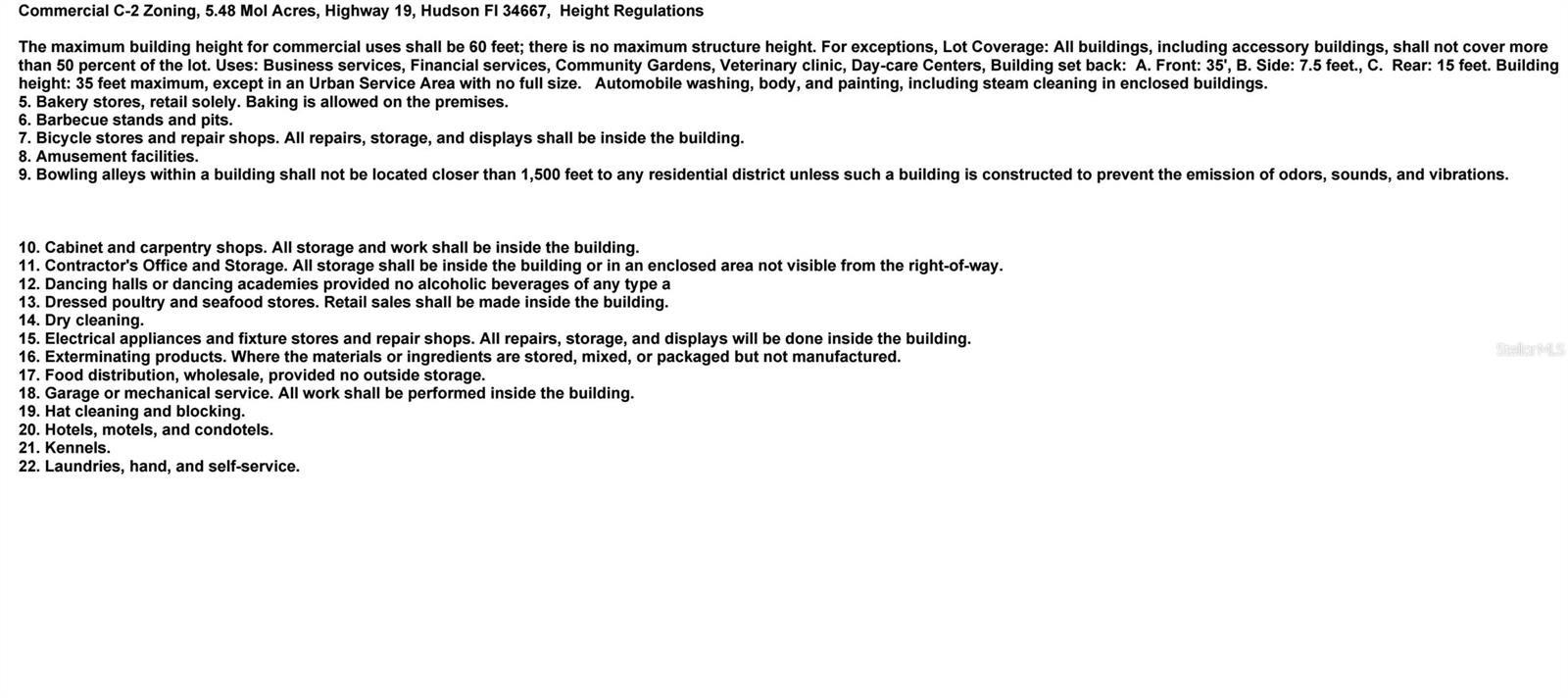 COMMERCIAL: DON'T HESITATE ON THIS FUTURE INVESTMENT!! PERFECT FOR STORAGE AND MUCH MORE!! Based on the information provided, the maximum building height for commercial uses in the specified C-2 zoning area is 60 feet, where there is no maximum building height for the Condotel. No Condos are allowed in C-2 General Commercial. However, you would need to refer to the Code, Chapter 500, Supplemental Regulations for specific exceptions. The lot coverage for all buildings, including accessory buildings, should not exceed 50 percent of the lot. The building setback requirements are as follows on this tract: This is a triple frontage lot so it would have 3 front setbacks of 25 feet which is the minimum front setback for C-2 General Commercial District. The South setback is 30 feet as it is adjacent to R-4 High Density Residential District. A. Front: 35 feet B. Side: 7.5 feet C. Rear: 15 feet LOCATED JUST ONE BLOCK FROM BAYONET POINT HOSP. IN A RAPIDLY GROWING AREA OF PASCO. THIS TRACK HAS HUGE POTENTIAL AND CAN FINANCIALLY SUPPORT A LARGE VARIETY OF BUSINESS OPPORTUNITIES FROM MULTI-HOME DWELLINGS, MEDICAL SUPPLIES, MEDICAL OFFICES, SPECIALTY PHYSICIANS, EMERGENCY MEDICAL TRANSPORT, AND FOR SERIOUS INVESTORS, THE ZONING ALLOWS FOR MEDICAL MARIJUANA (GROWING AND OR DISTRIBUTION)
