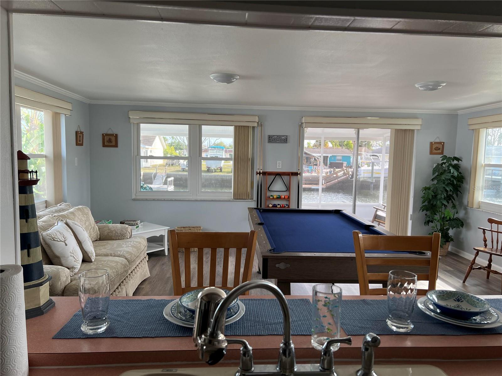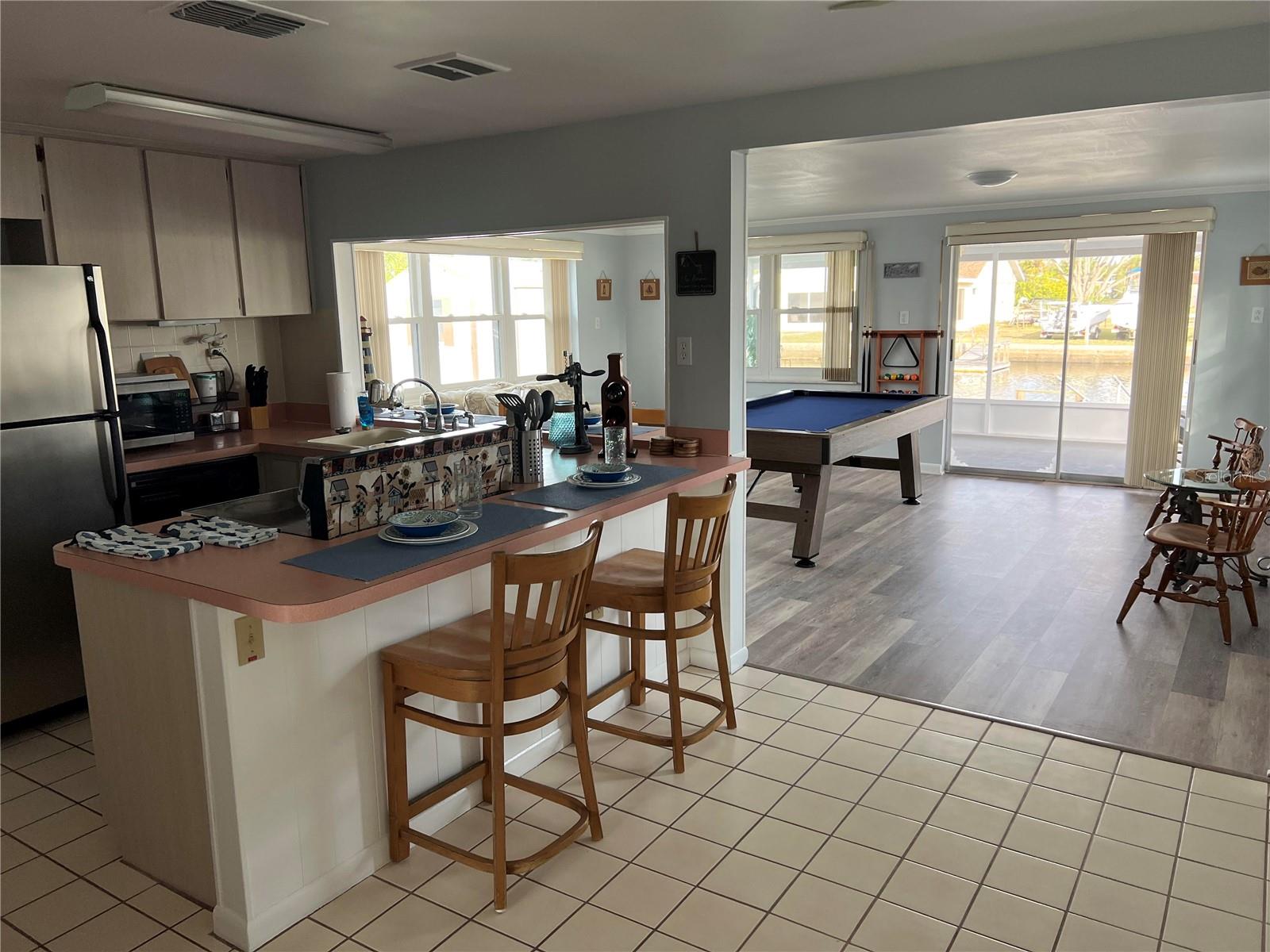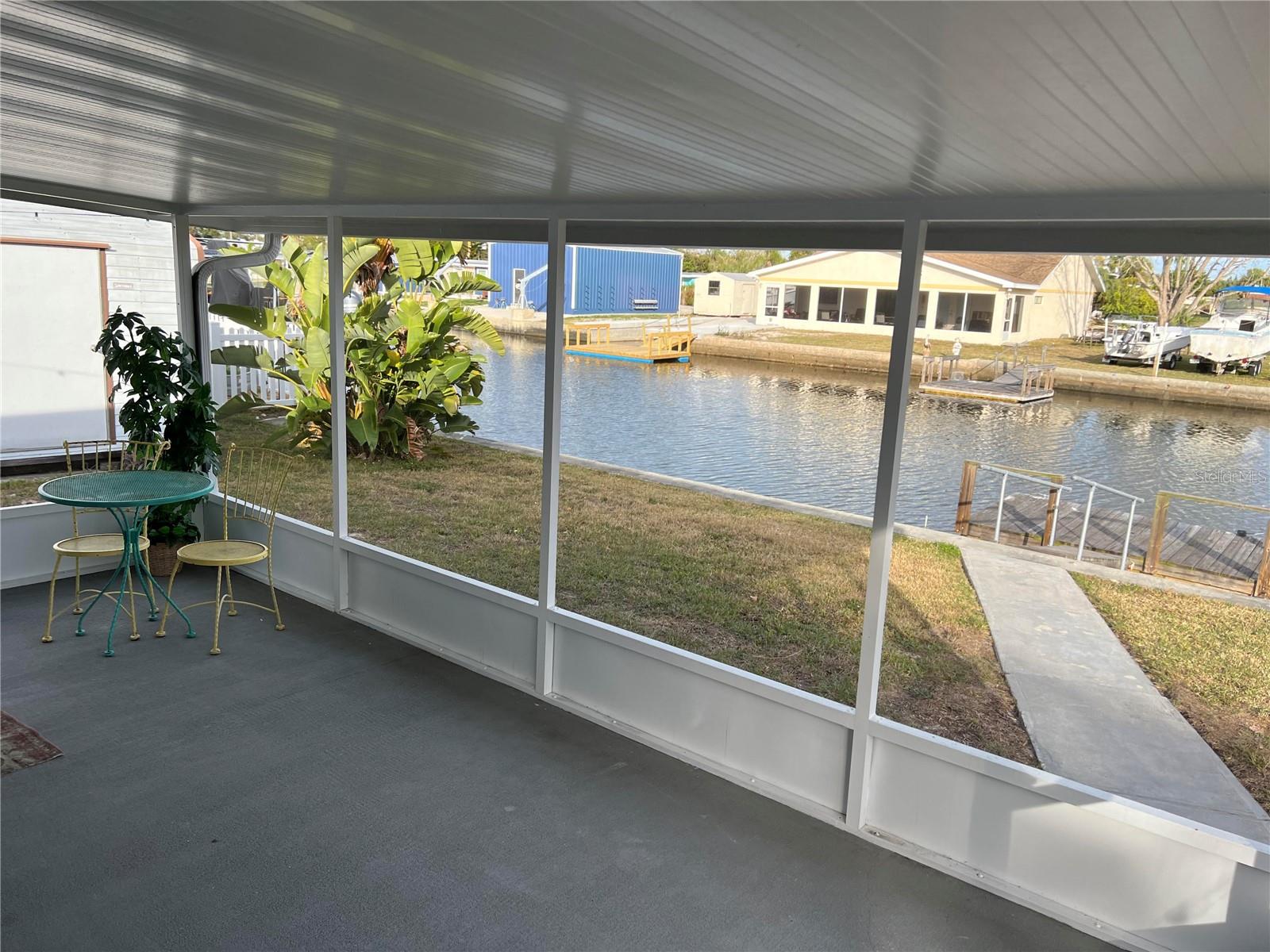 This 2 bedroom 1 1/2 bathroom waterfront house is located on a deep water canal with no tide or bridge restriction. Offering the cozy feeling a house needs and much more: a one car garage boasts plenty of storage cabinets, a wall rack to hold all your fishing poles, floating dock, Fullscreen back porch, great room/ bonus room, peaceful environment, amazing views of the water, morning sunrises and beautiful sunsets. A wonderful place to relax, experience water contact kayaking, looking at the manatees and dolphins and fishing at your own private dock. Updated with new laminate flooring in both bedrooms and living room and great room, new interior paint, new windows.