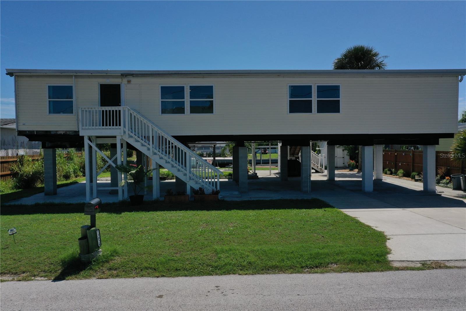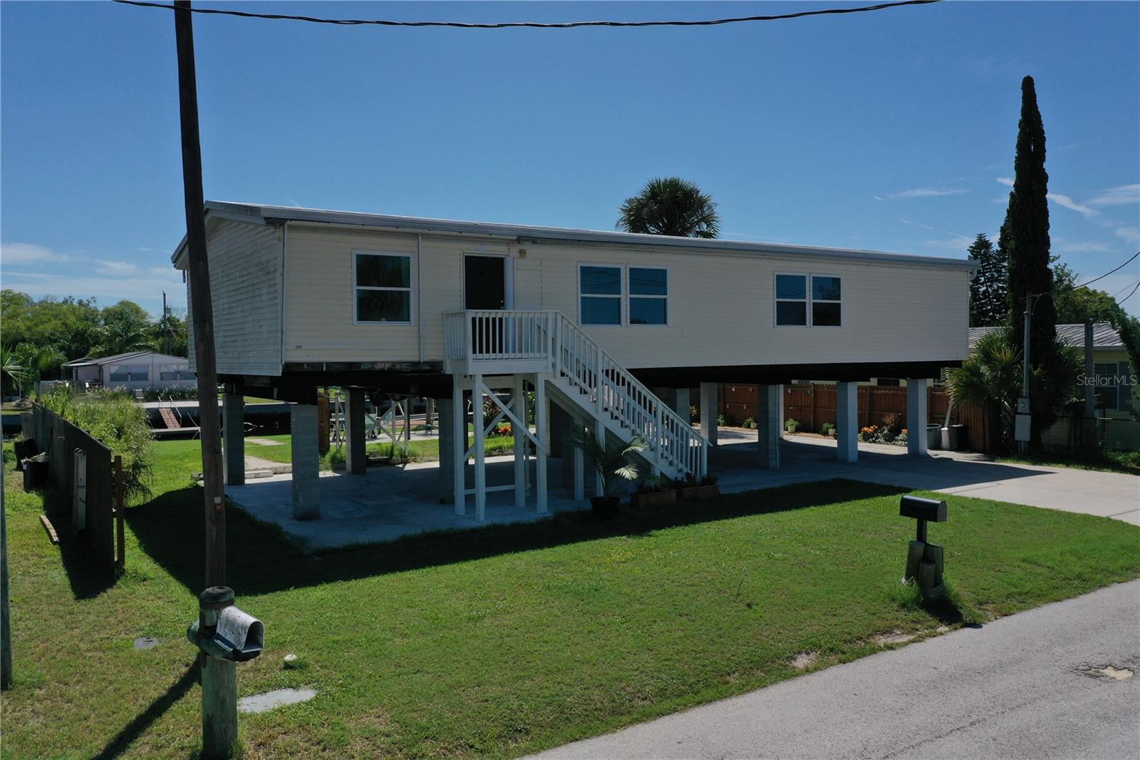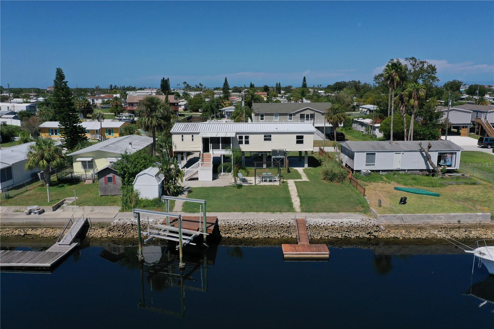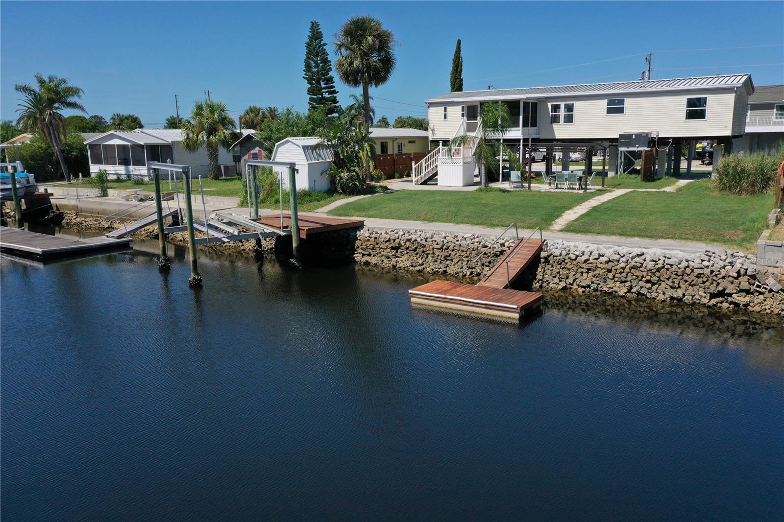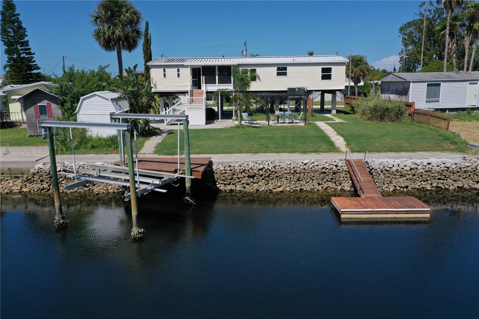 Updated, upgraded & a recent price decrease! This waterfront home, in Signal Cove of Hudson is what you have been looking for with 80 feet of seawall! This 1994 Palm Harbor Stilt Home is unrecognizable from what it was a couple of years ago while available and waiting for it's new owners! Driving into the neighborhood, you get the very sense that the water is nearby. Approaching the property, you'll notice the home is levels above the rest as a spot for relaxing & enjoying that Florida lifestyle. The backyard is spacious & provides a large, covered area for a break from the sun, a sun shaded seating area, large shed & not only a dock with boatlift & a floating dock but 80 glorious feet of seawall!! From the backyard, you can enter the home, via its composite built staircase into the front covered porch. Upon entrance of the home there is an open, airy feeling to the home that greets you inside, with its open floor plan offering a very large living room & dining area combination & the kitchen & breakfast are combination with a desk for convenience. The owner's suite is separate from the spare bedrooms while providing ample space for get togethers. The entire home has wood plank style tiling that runs through the entire floor plan providing consistency for your eye & as well as your sanity. The large owner's suite has a large closet, large window for lighting, a ceiling fan & a private en-suite that is sure to please with its separate shower stall, upgraded wooden vanity, fixtures & hardware while featuring a gorgeous stand-alone tub! Back out to the living room there is a large window, ceiling fan & enough space for the largest of sectionals or couch sets with a full ensemble. There is an open dining area near both the living room & kitchen while the kitchen boasts a breakfast area, a nook with desk & storage, quartz countertops, upgraded stainless steel appliances, solid wood cabinetry, updated fixtures & hardware. Just past the kitchen & delving deeper into the home is where you will find the 3 spare bedrooms, laundry room with exterior exit that can also be used to enter the home & a full updated & upgraded bathroom. The first spare bedroom provides a ceiling fan & a large window while being closest to the kitchen. The second spare bedroom is nearer the full bath & offers a view of the water, through it's window, while having a standard closet & ceiling fan. The third spare bedroom is nearest to the laundry room & linen closet & has a window & no closet. The full spare bathroom has an upgraded glass enclosure shower, wood vanity, framed mirror & upgraded hardware & fixtures. Being only 27 miles from Clearwater beach & 69 miles to Disney World this property should be your next home tour. If you have been looking for something with water frontage and easy access to the Gulf of Mexico, well hear you have it!