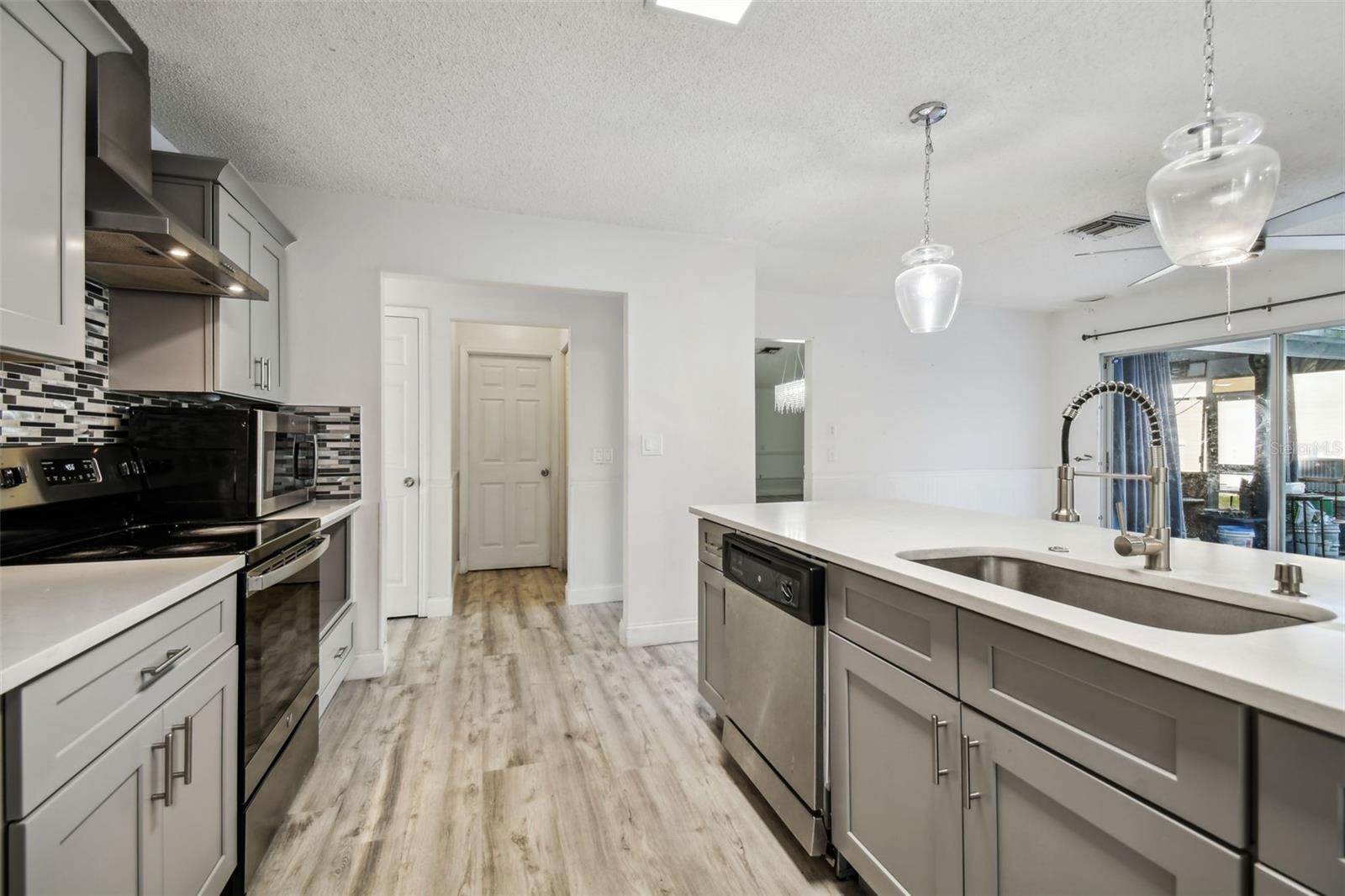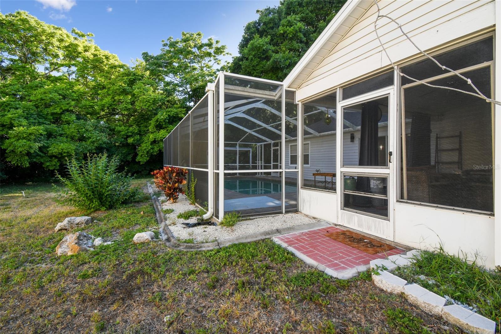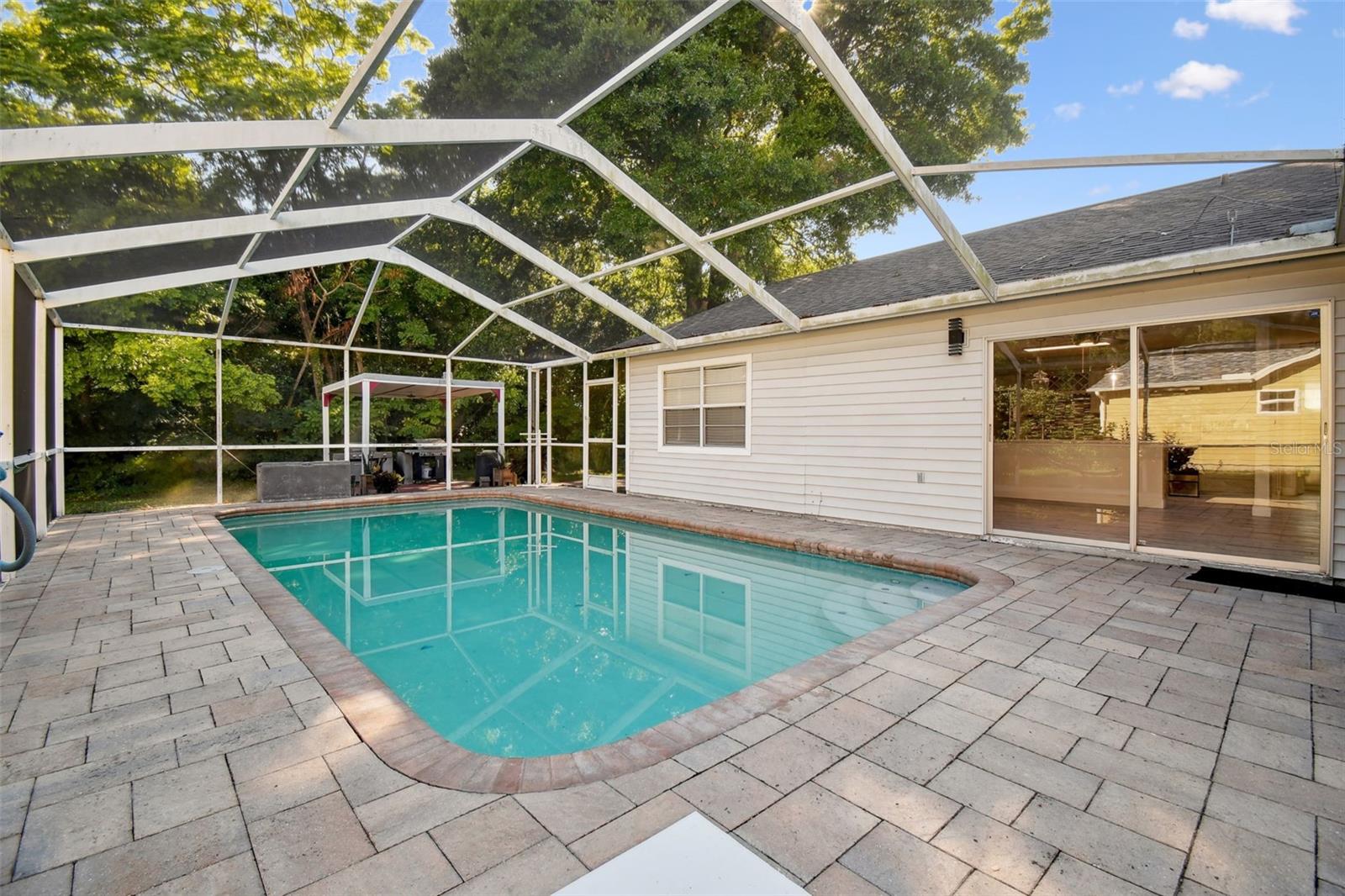 Seller is giving $4,000 towards closing cost credit. Welcome home to your pool home in Beacon Woods East! Home has new roof 2024. Four bedrooms, two bathrooms. This home feels light and airy with vaulted ceilings throughout the living areas and master bedroom. Enjoy your screened in pool and pavered patio - perfect for entertaining or relaxing on hot summer days. The Master Suite is large with a private entry to the pool and patio. The ensuite master bathroom features a dual sink, large walk-in closet and step-in shower. Two separate living areas - both warm and inviting. The large kitchen boasts lots of counter space and an open concept overlooking the family room. Custom-made sliding barn doors in the second bedroom are the perfect modern farmhouse feel. The sprinkler system runs on its own separate well so your lawn will always be lush and green without breaking the bank on your water bill. Fully insurable. Flood Insurance NOT REQUIRED. Schedule your tour today!