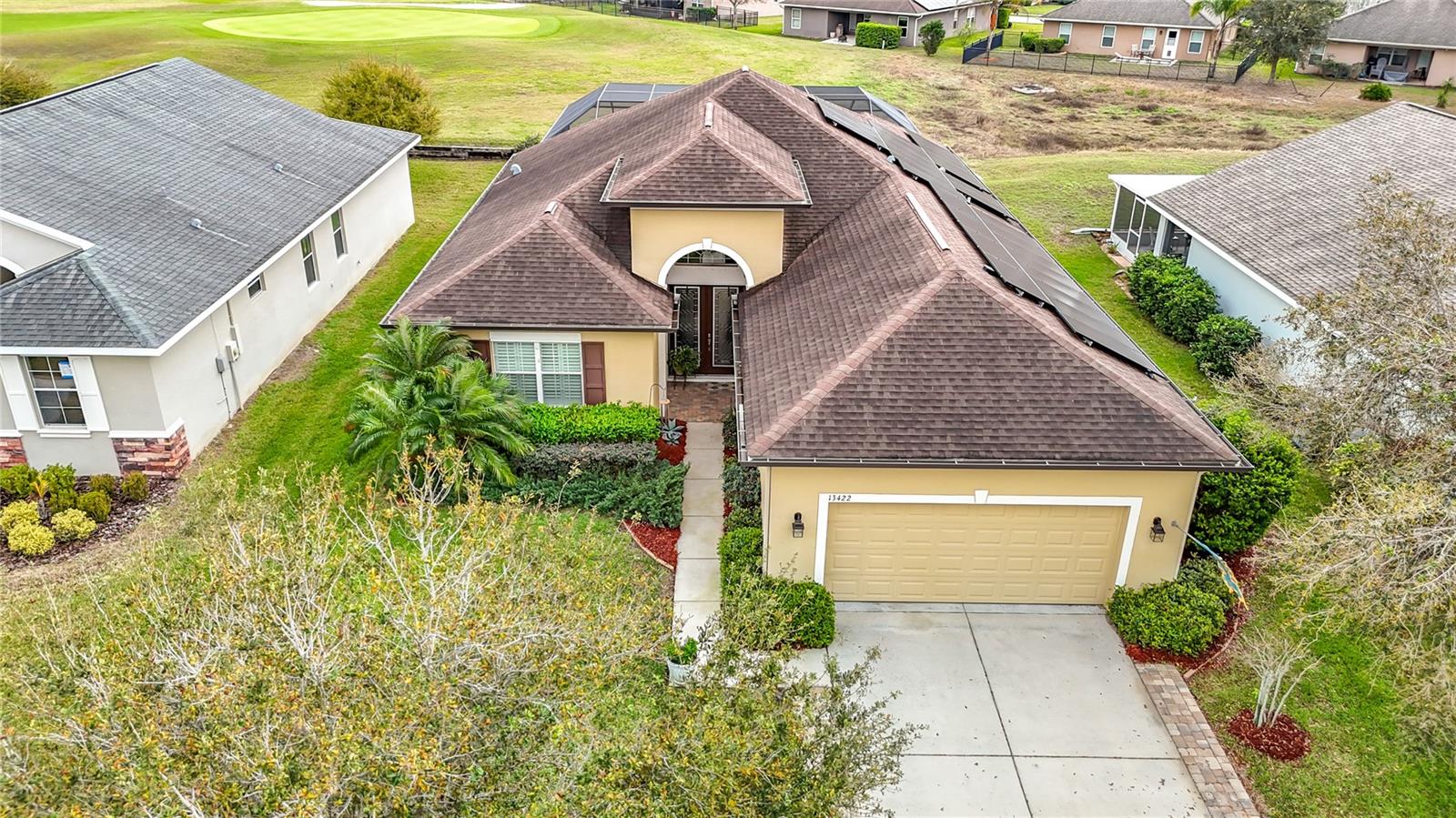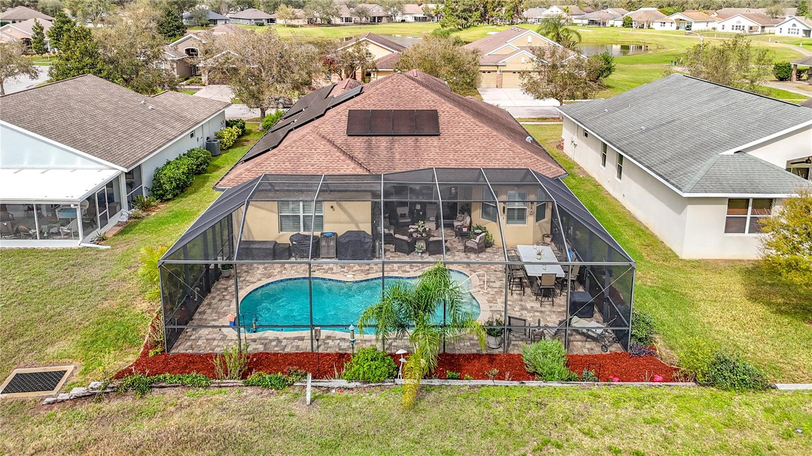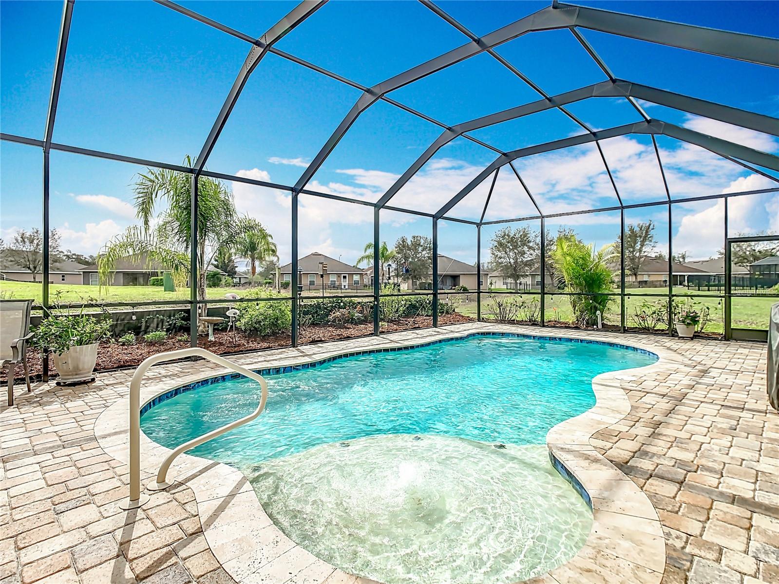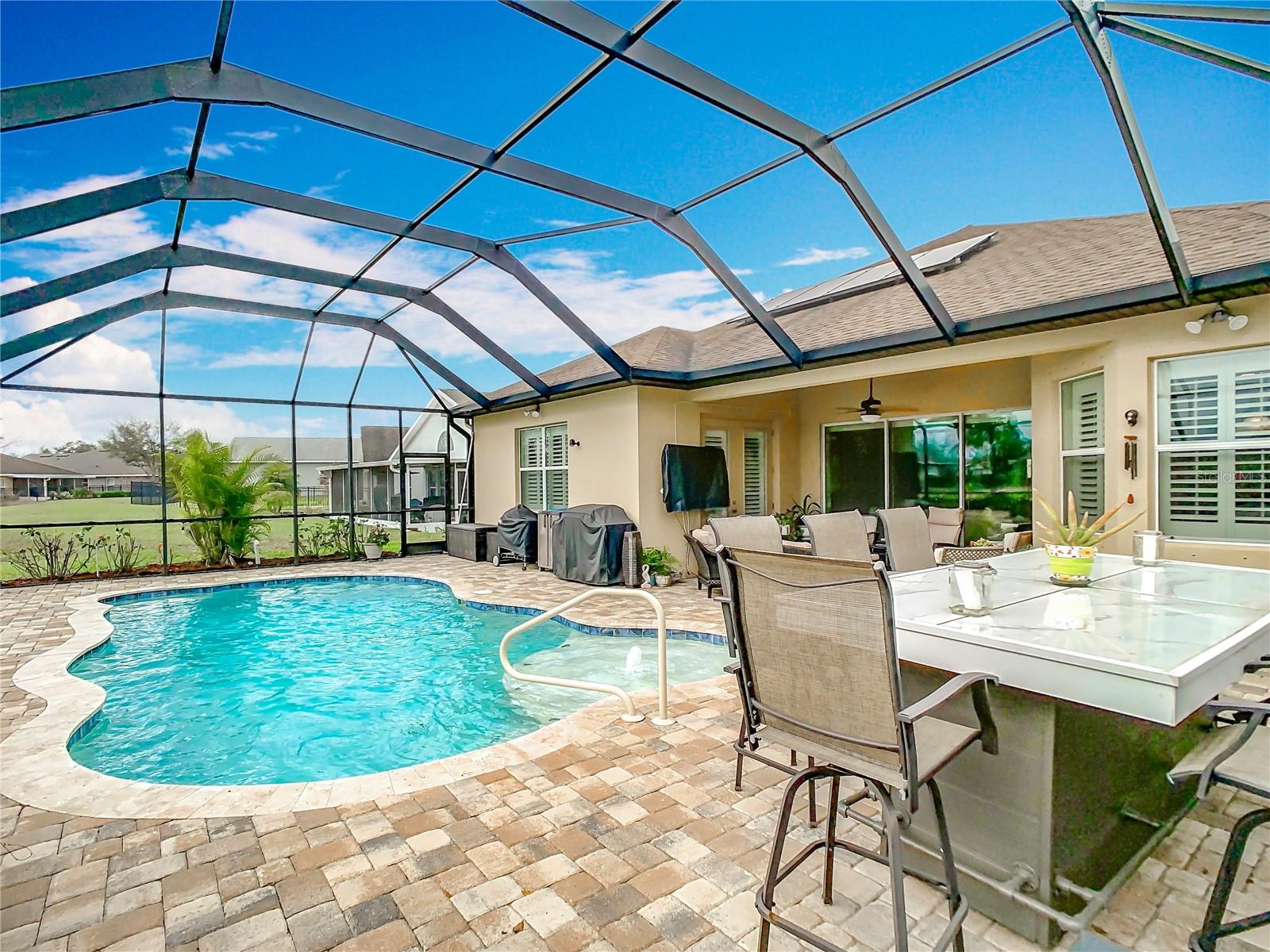 Huge price drop 9/13/25. Stop by in person to see this spectacular home.This is a 2016 Deeb built home and backs onto the 14th green of Meadow Oaks golf course. Home is 2,171 sq. ft., 3 bedroom, 2 bath, 2 car garage pool home. OPEN FLOOR PLAN with split bedrooms for that added privacy. UPGRADES are plentiful in this dream home. Since 2018 the SALT WATER POOL PACKAGE, WHOLE HOUSE WATER PURIFICATION SYSTEM, ADDITIONAL ZONES TO THE IRRIGATION SYSTEM, NEW FRIGIDAIRE A/C INSTALLED IN 2025, and a MINI-SPLIT A/C in the primary bedroom are a few of the upgrades added. Please refer to the enclosures with the listing for further information on other upgrades. The home has ENGINEERED HARDWOOD FLOORING in the foyer, living / dining room, kitchen, family room and primary bedroom. There are ceiling fans in all bedrooms, family room and lanai which were professionally installed. The kitchen has WHIRLPOOL STAINLESS STEEL APPLIANCES, recessed lighting, 42' wood cabinets, SOFT CLOSE DRAWERS and TILE BACKSPLASH. GRANITE COUNTERS and ISLAND give you ample space for meal preparation. There are also TRAY CELINGS in the foyer, dining room, family room, and primary bedroom. The windows are DOUBLE PANED and have CUSTOM MADE PLANTATION SHUTTERS throughout. There are also HURRICANE SHUTTERS for those unfortunate tropical storms which can be easily installed. The front entry area has beautiful DOUBLE LEADED GLASS DOORS with a CRESCENT WINDOW above it. Inside there are 2 STATELY COLUMNS. VOULUME CEILINGS, 8' DOORS, PLANT SHELVES, and DEEP BASEBOARDS which enhance the beauty of this home. The utility room has a sink and HIGH END LG WASHER / DRYER on PEDESTALS. The pool area is caged and screened, The entire area including the covered lanai have pavers for that rich quality look. This is truly a backyard Oasis for you, your family and friends to enjoy year round. The big item of this home are the SOLAR PANELS. They provide electricity to the entire home. NO MONTHLY ELECTRIC BILLS. The solar panels are totally assumable and have TAX CREDITS AVAILABLE YEARLY. This community has NO CDD FEES, is located in a NO FLOOD ZONE, and has reasonable property taxes and HOA fees. There is so much more that can be said about this stunning property. Review the pictures and captions. Once you have you'll be sure to want to see this one in person. DON'T DELAY, THIS HOME WON'T LAST.