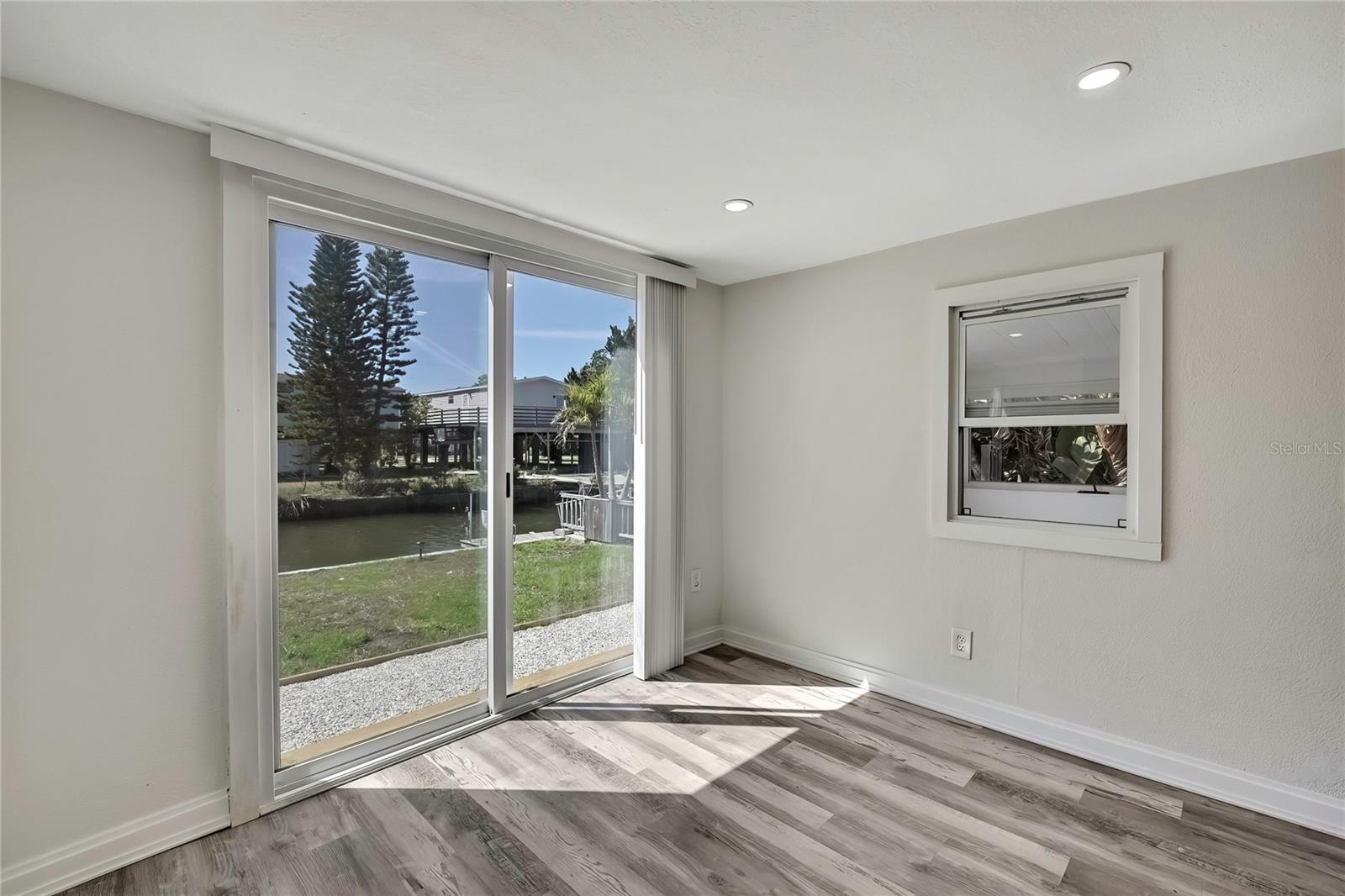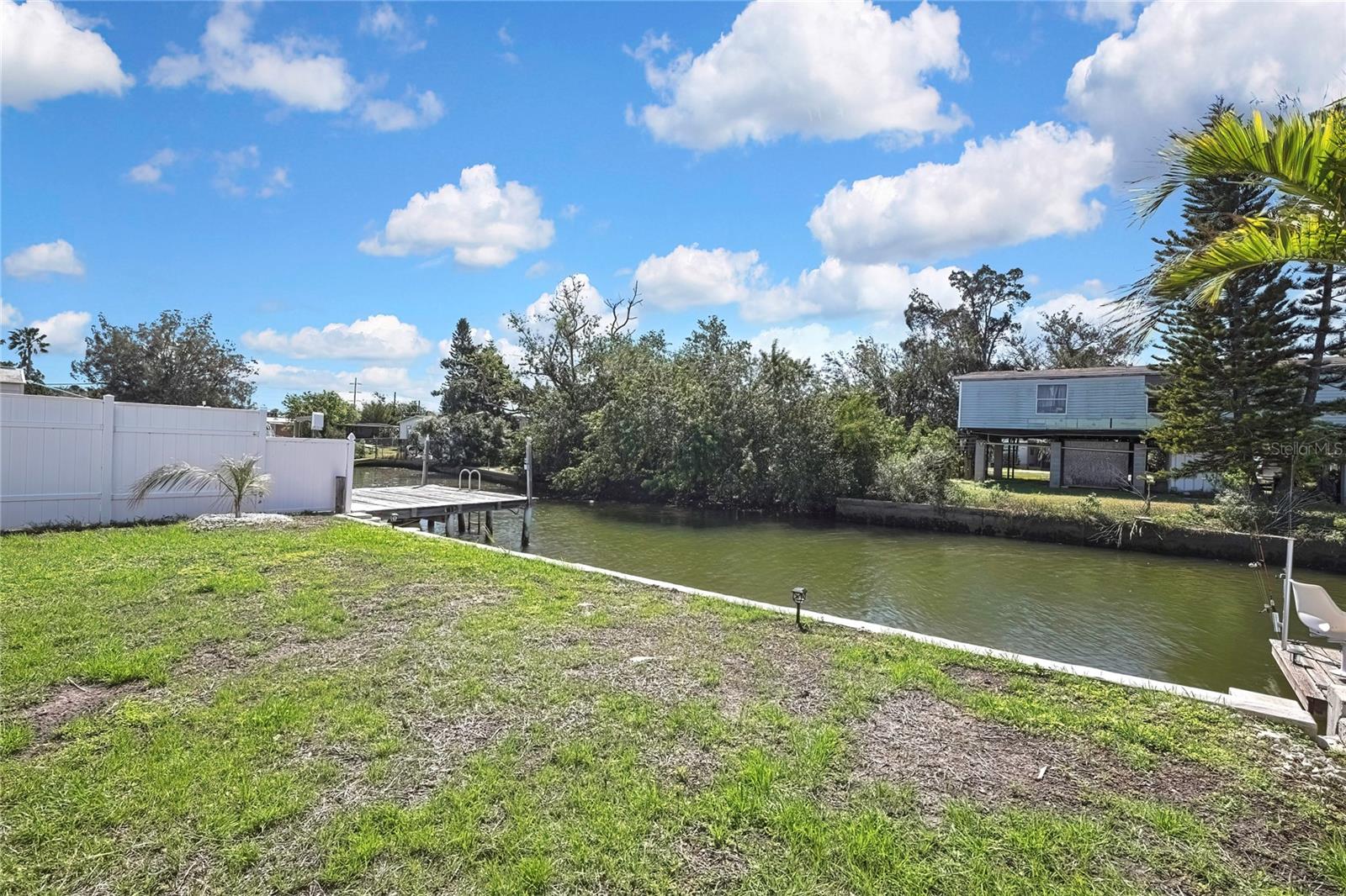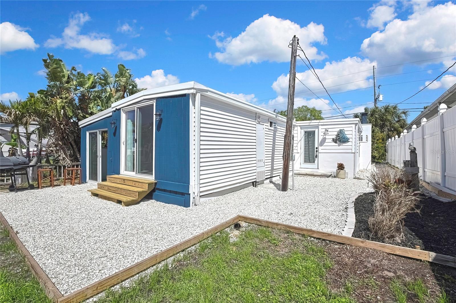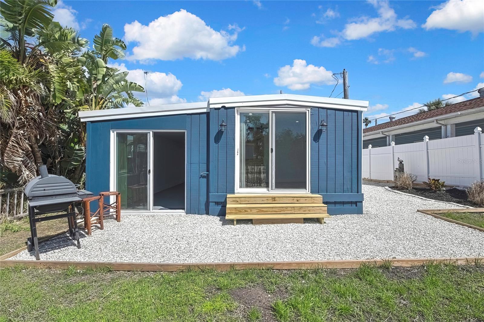Welcome to this newly renovated 2-bed / 1-bath canal front Sea Ranch, located just a few short minutes to the Gulf of America. This property is perfect for living a low-maintenance lifestyle and shows exceptional attention to detail. The private lot has mature landscape and a shell walkway that leads to the custom tile entryway. The open floor concept with tons of natural light connects both the interior and exterior spaces, which allows multiple water views. The updates are done in modern colors and recessed lighting throughout. The tiled kitchen backsplash, new waterproof vinyl flooring, combined with ergo-friendly butcher block counters and wood cabinets, creates an ocean vibe. The home even has a built-in electric fireplace for those chilly mornings. The master bedroom overlooks the canal and has separate sliding doors. The new bathroom was designed to house a stackable washer/dryer unit. The additional 600 sq ft finished flex space with sliding door leads to the backyard oasis and the 40-foot seawall. The outdoor space is perfect for entertaining. New roof and gutters installed in 2022, with a 12-year warranty that can be transferred to the new owners for $500. Come and live your waterfront lifestyle dream in this golf cart community!