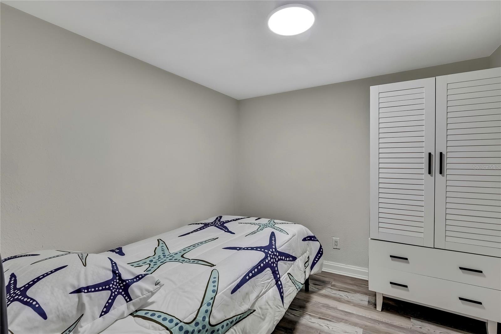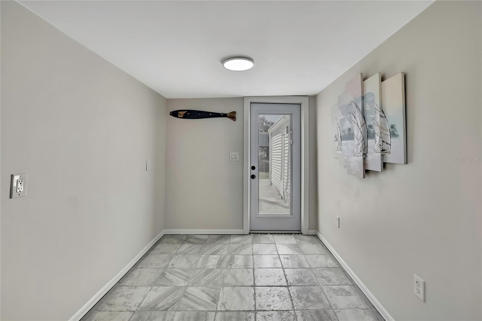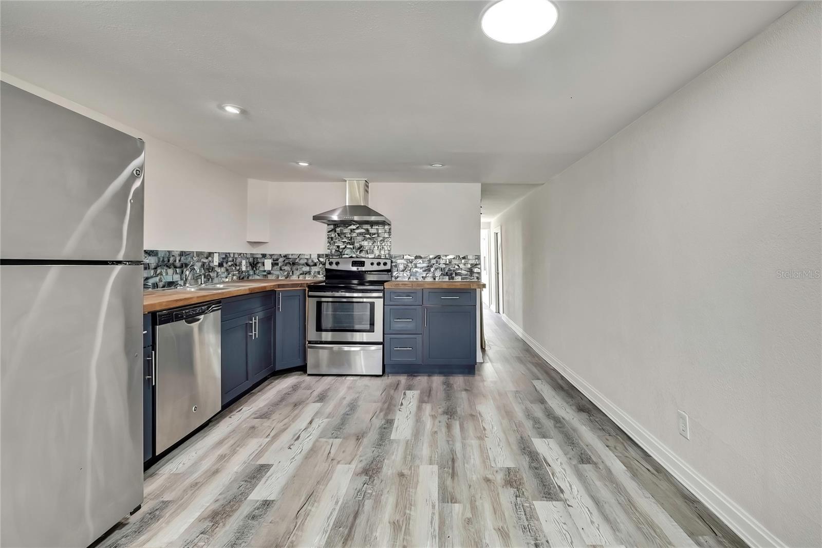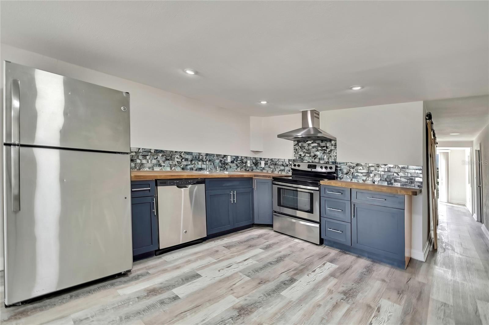 Welcome to this newly renovated 2-bed / 1-bath canal front Sea Ranch, located just a few short minutes to the Gulf of America. This property is perfect for living a low-maintenance lifestyle and shows exceptional attention to detail. The private lot has mature landscape and a shell walkway that leads to the custom tile entryway. The open floor concept with tons of natural light connects both the interior and exterior spaces, which allows multiple water views. The updates are done in modern colors and recessed lighting throughout. The tiled kitchen backsplash, new waterproof vinyl flooring, combined with ergo-friendly butcher block counters and wood cabinets, creates an ocean vibe. The home even has a built-in electric fireplace for those chilly mornings. The master bedroom overlooks the canal and has separate sliding doors. The new bathroom was designed to house a stackable washer/dryer unit. The additional 600 sq ft finished flex space with sliding door leads to the backyard oasis and the 40-foot seawall. The outdoor space is perfect for entertaining. New roof and gutters installed in 2022, with a 12-year warranty that can be transferred to the new owners for $500. Come and live your waterfront lifestyle dream in this golf cart community!