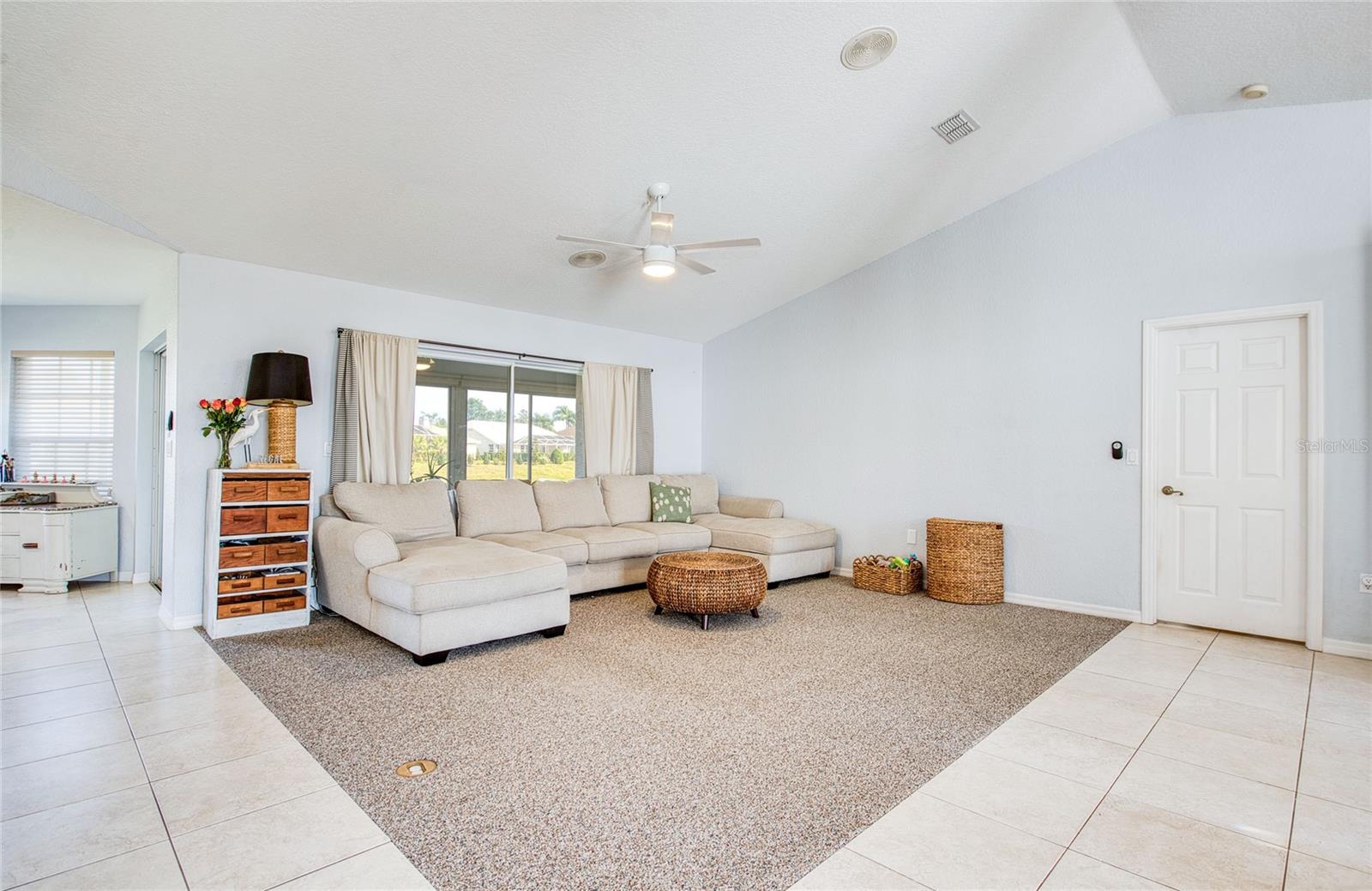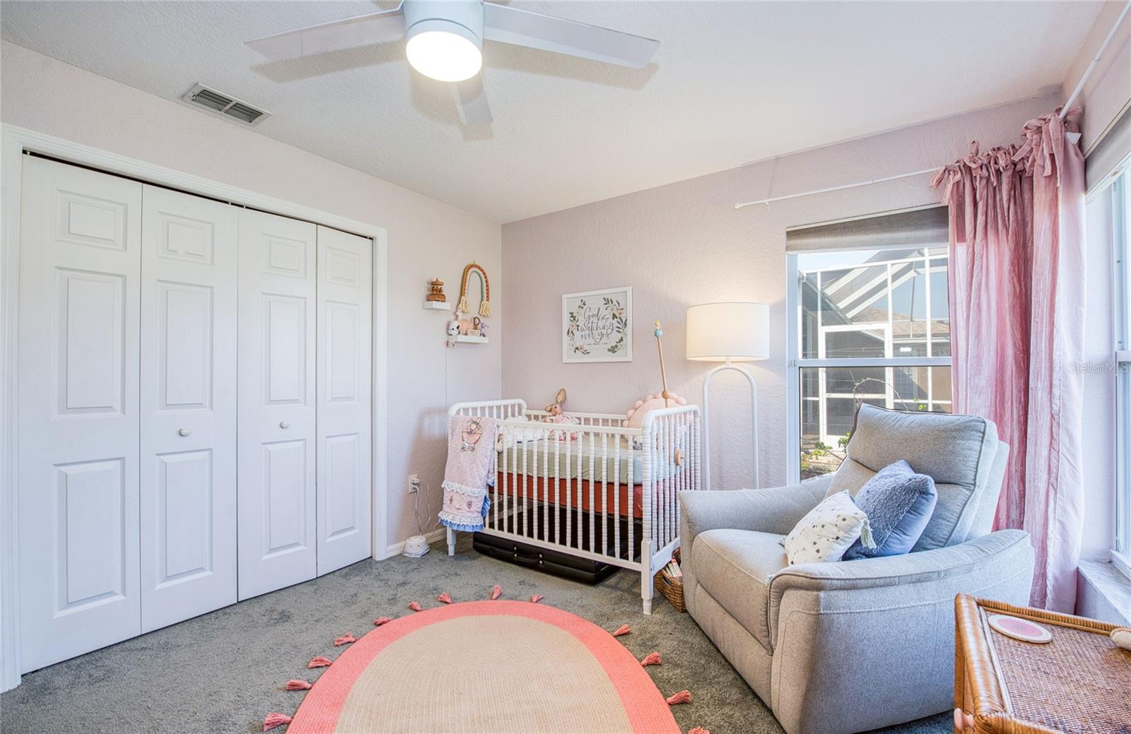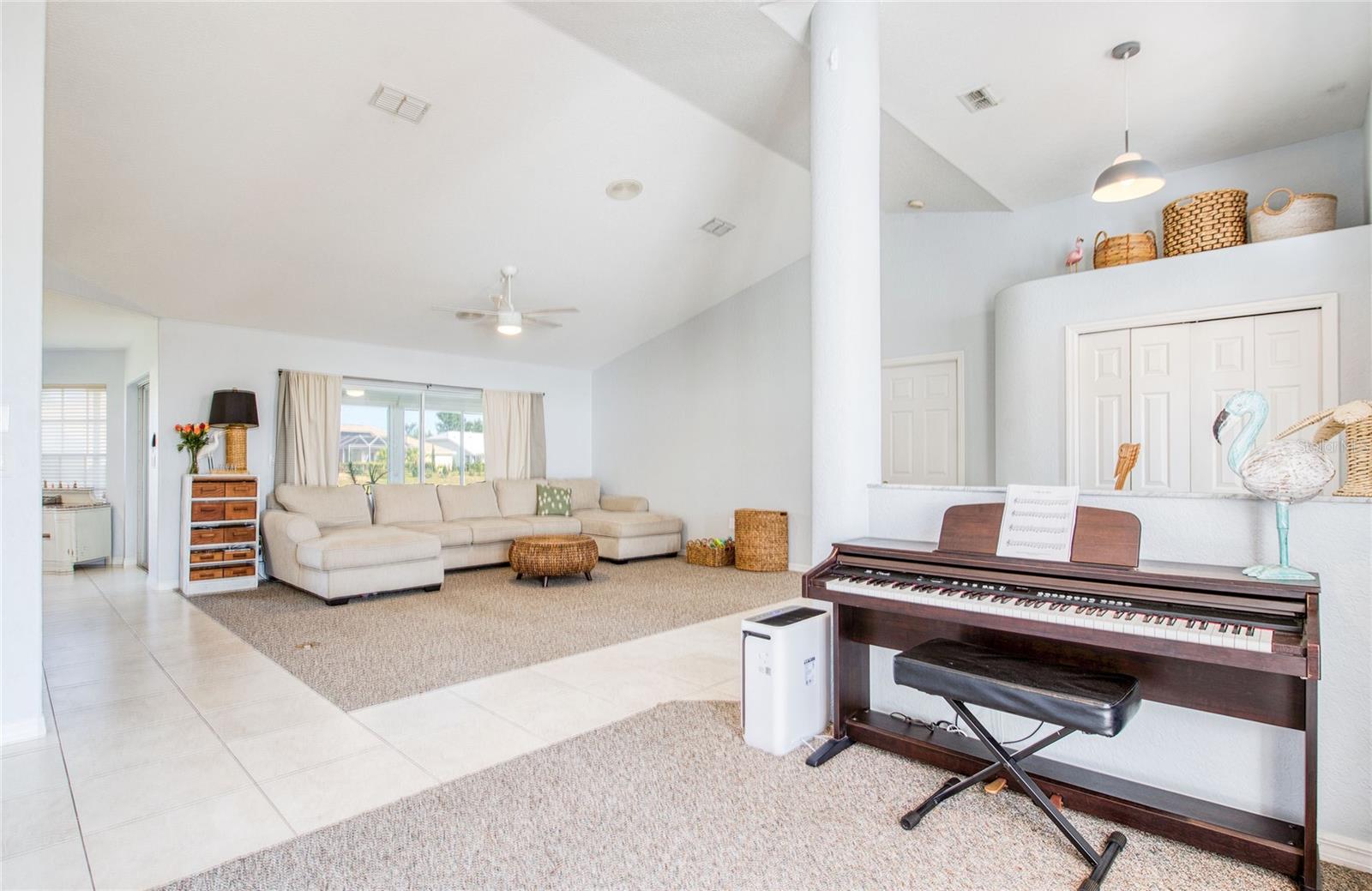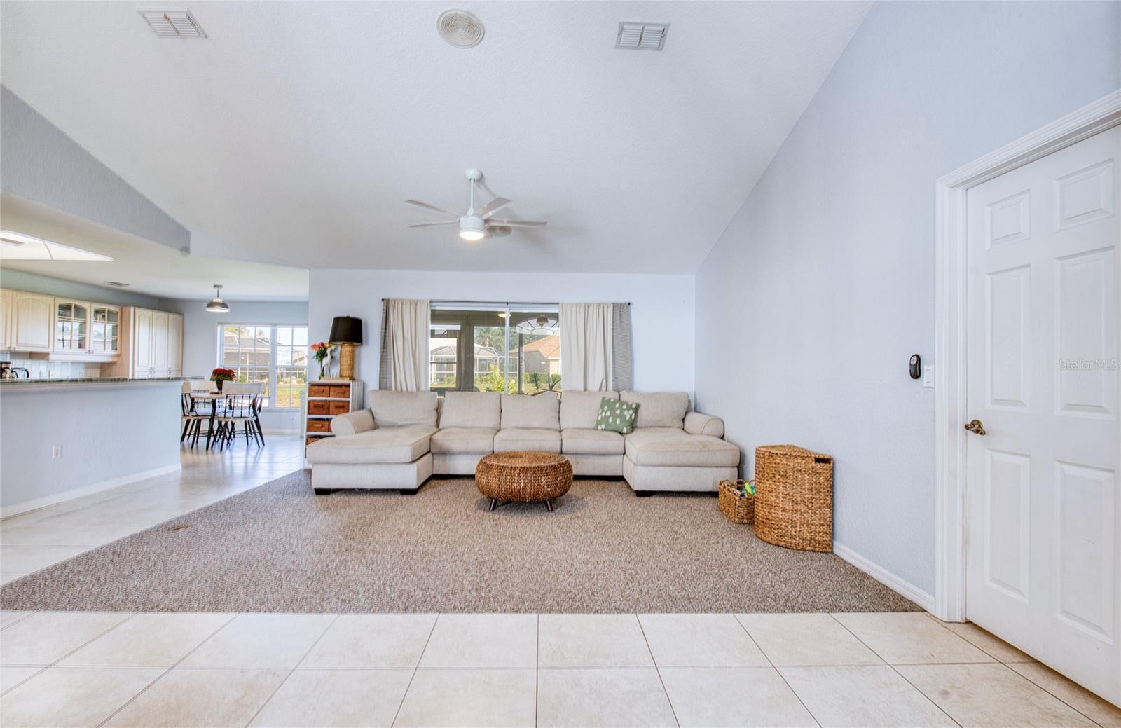 Welcome to this beautifully maintained 3-bedroom, 2-bathroom home in the highly desirable The Estates neighborhood, known for its great curb appeal and peaceful surroundings. This home offers peace of mind with recent updates. A/C (2021), new window screens (2021), Roof replaced in 2021 — invoice available upon request and new stainless steel kitchen appliances (2024). As you approach, a solid wood front door with brass-accented sidelights welcomes you, allowing natural light to flow into the entryway. Inside, you'll find a spacious double-door coat closet and ceramic tile flooring throughout the entry, kitchen, hallways, and bathrooms. The dining and living areas, along with the bedrooms, feature matching carpet for a warm and cohesive look. The open living and kitchen areas boast high ceilings and sliding glass doors that lead to a screened-in lanai and a serene backyard overlooking a retention pond—offering privacy with no rear neighbors and wide green views. The kitchen is both functional and charming, with whitewashed cabinets, granite countertops, a built-in desk area, stainless-steel sink, and ample cabinet storage. The adjacent laundry room, located just off the garage entry, also offers additional cabinetry and a utility sink. The spacious master suite features high ceilings, recessed lighting, and a flexible bonus room perfect for an office, nursery, yoga studio, or reading nook, with its own access to the lanai. Two walk-in closets lead to the master bathroom, which is outfitted with a double-sink vanity, makeup counter, large ceramic tile shower with glass doors, and a relaxing Jacuzzi tub set beneath a large window that lets in abundant natural light. The additional two bedrooms are generously sized, each with large closets and ceiling fans. They share a full hallway bathroom with ceramic tile flooring, a tiled shower with sliding glass doors, a single-sink vanity with storage and a privacy glass window. Additional features include ceiling fans throughout, vertical blinds, window treatments, and marble window sills. HOA dues include cable, high-speed internet, lawn maintenance, and pest/weed control. Enjoy a beautiful and full of fun Community's Club Housewith a pool, tennis and pickleball courts. Also, the well known Veterans Memorial Park is just 7 minutes away and offers a wide range of amenities, including a playground, splash pad, basketball, volleyball, pickleball courts, gym, Pilates classes, a swimming pool, and numerous sports programs, summer camps, and community events. Many of their activities are held indoors, making it a year-round destination for all ages. Don't miss the opportunity to live on Regal Lane in the Estates of Beacon Woods. Schedule your private showing today!