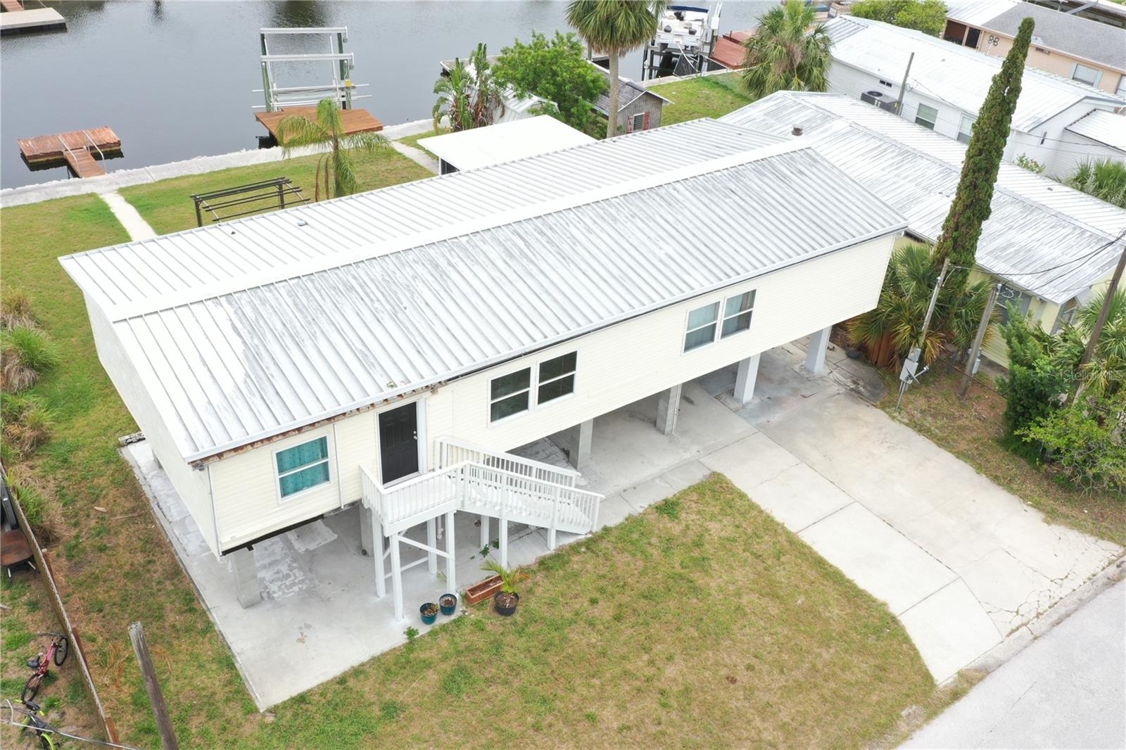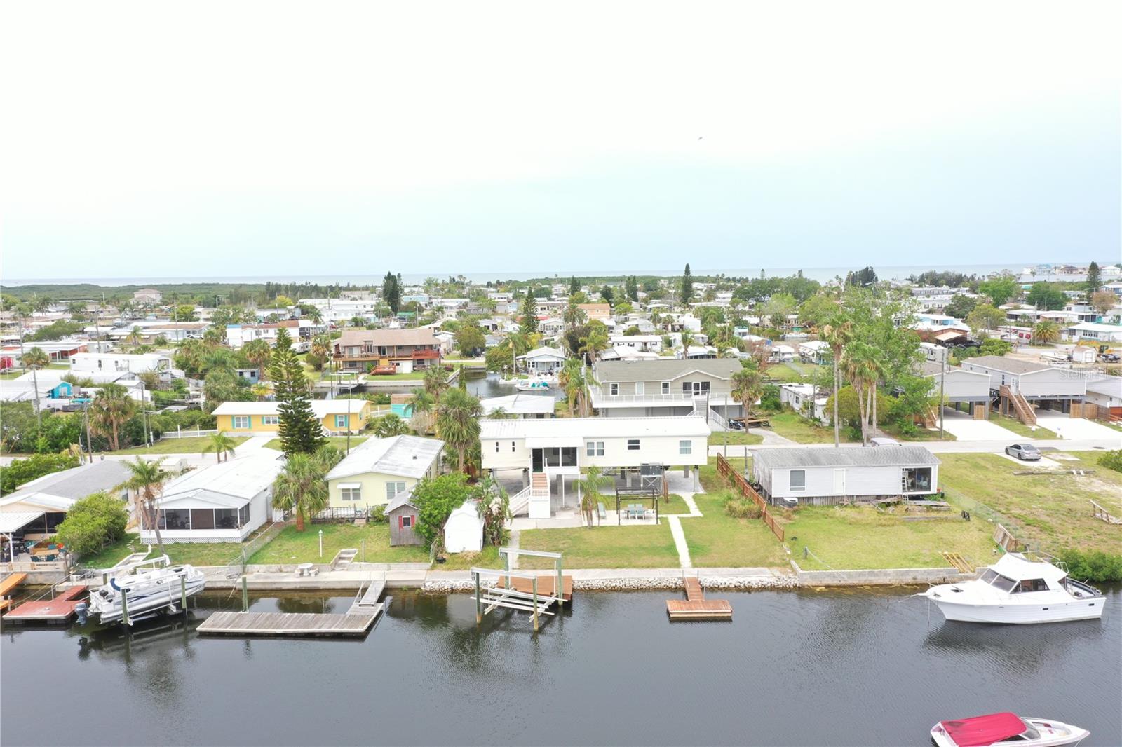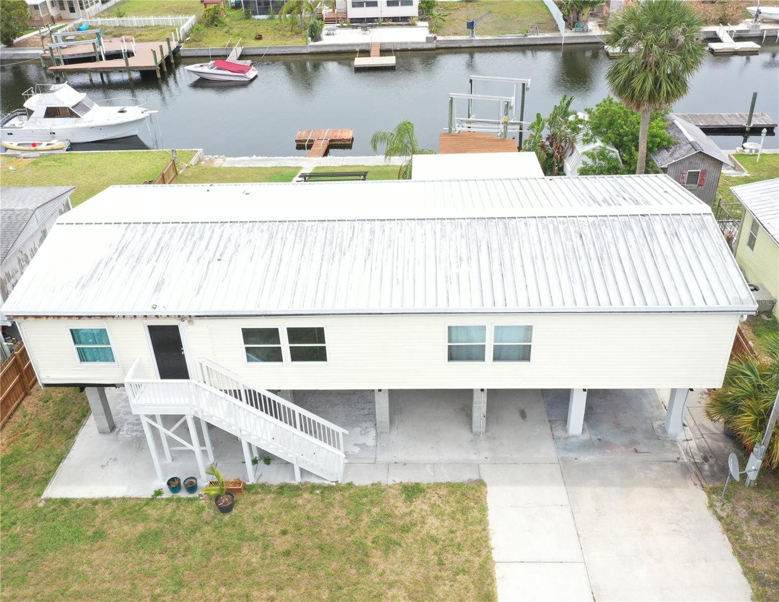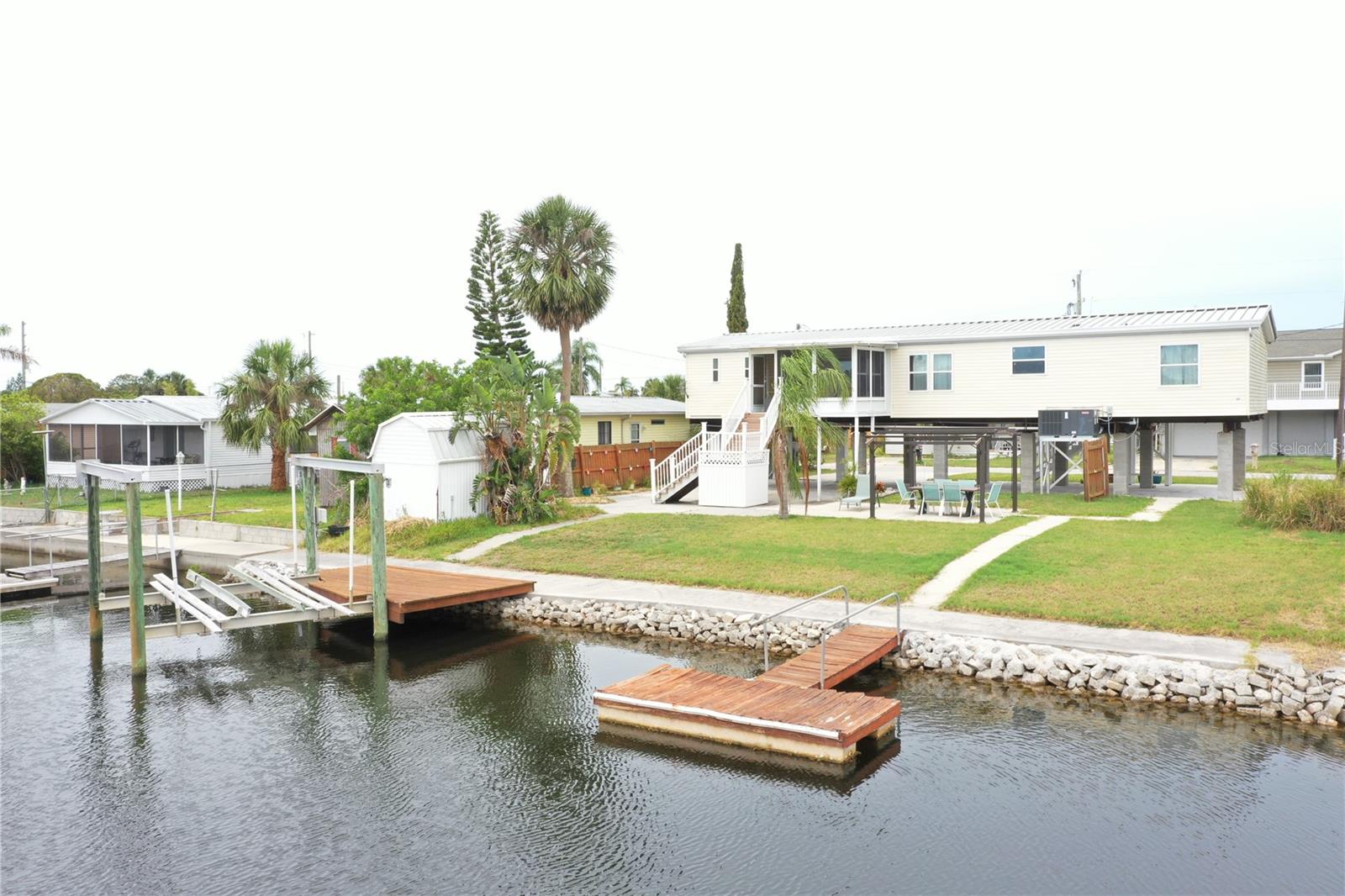 Updated, upgraded & a recent price decrease! This waterfront home, in Signal Cove of Hudson is what you have been looking for with 80 feet of seawall! This 1994 Palm Harbor Stilt Home is unrecognizable from what it was a couple of years ago while available and waiting for it's new owners! Driving into the neighborhood, you get the very sense that the water is nearby. Approaching the property, you'll notice the home is levels above the rest as a spot for relaxing & enjoying that Florida lifestyle. The backyard is spacious & provides a large, covered area for a break from the sun, a sun shaded seating area, large shed & not only a dock with boatlift & a floating dock but 80 glorious feet of seawall!! From the backyard, you can enter the home, via its composite built staircase into the front covered porch. Upon entrance of the home there is an open, airy feeling to the home that greets you inside, with its open floor plan offering a very large living room & dining area combination & the kitchen & breakfast are combination with a desk for convenience. The owner's suite is separate from the spare bedrooms while providing ample space for get togethers. The entire home has wood plank style tiling that runs through the entire floor plan providing consistency for your eye & as well as your sanity. The large owner's suite has a large closet, large window for lighting, a ceiling fan & a private en-suite that is sure to please with its separate shower stall, upgraded wooden vanity, fixtures & hardware while featuring a gorgeous stand-alone tub! Back out to the living room there is a large window, ceiling fan & enough space for the largest of sectionals or couch sets with a full ensemble. There is an open dining area near both the living room & kitchen while the kitchen boasts a breakfast area, a nook with desk & storage, quartz countertops, upgraded stainless steel appliances, solid wood cabinetry, updated fixtures & hardware. Just past the kitchen & delving deeper into the home is where you will find the 3 spare bedrooms, laundry room with exterior exit that can also be used to enter the home & a full updated & upgraded bathroom. The first spare bedroom provides a ceiling fan & a large window while being closest to the kitchen. The second spare bedroom is nearer the full bath & offers a view of the water, through it's window, while having a standard closet & ceiling fan. The third spare bedroom is nearest to the laundry room & linen closet & has a window & no closet. The full spare bathroom has an upgraded glass enclosure shower, wood vanity, framed mirror & upgraded hardware & fixtures. Being only 27 miles from Clearwater beach & 69 miles to Disney World this property should be your next home tour. If you have been looking for something with water frontage and easy access to the Gulf of Mexico, well hear you have it!