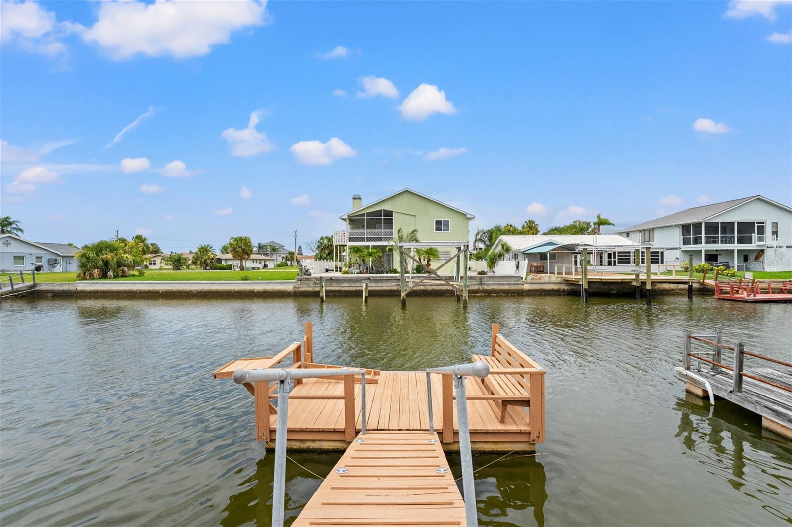 Discover the perfect combination of modern updates and functional design in this 2-bedroom, 2-bath home, highlighted by its private dock offering direct access to the water. A new roof was installed in August 2023, and the elevated AC unit was upgraded in 2025—ensuring reliable comfort all year long. Inside, natural light fills the space thanks to hurricane impact windows that help keep the heat out and provide added peace of mind. The layout flows seamlessly, making it ideal for both everyday living and entertaining. The kitchen features all new cabinets and countertops, along with brand new stainless steel appliances, a breakfast bar, and a spacious dining area—perfect for hosting or enjoying casual meals. The master bedroom and bath have both been recently updated, and the home also includes all new electrical, offering safety and modern convenience. Tile flooring runs throughout the home, giving it a clean, cohesive look. A versatile flex space currently set up as an office provides the perfect work-from-home solution or extra room to suit your needs. An expansive Florida room with impact windows offers peaceful views of the saltwater canal, where you can often spot manatees and dolphins swimming by. The fully fenced backyard features ample patio space—ideal for relaxing, setting up a hot tub, or enjoying your own private oasis. A floating dock offers convenient water access, and a concrete pad provides additional parking for a boat or trailer. The home also includes a hurricane impact garage door, enhancing security and storm protection. Boating enthusiasts will appreciate the newer 10,000-lb boat lift, offering quick, bridge-free access to the open Gulf of Mexico. Whether you’re fishing, island-hopping, or simply cruising the coastline, this home makes it easy to enjoy life on the water. Located in the desirable Sea Pines community, residents enjoy access to a private clubhouse, park, community dock, and boat ramp—with no mandatory HOA. Just minutes from Sunwest Park, this home delivers the very best of Florida’s coastal lifestyle.