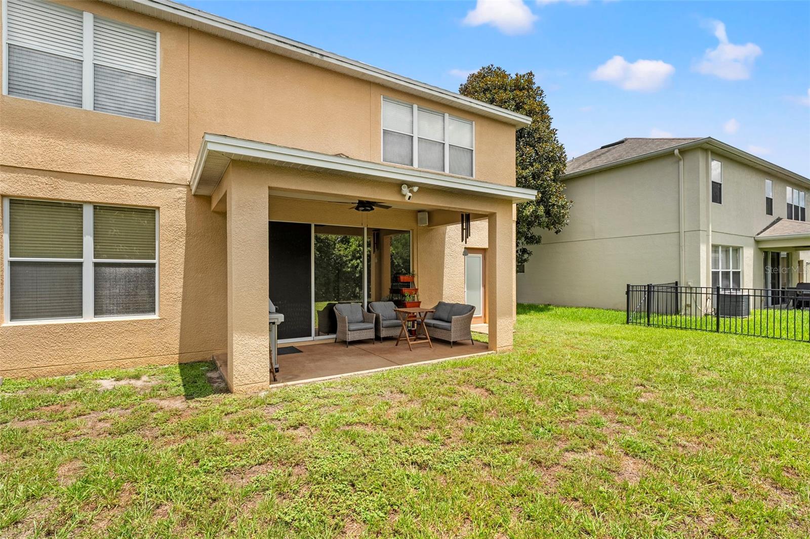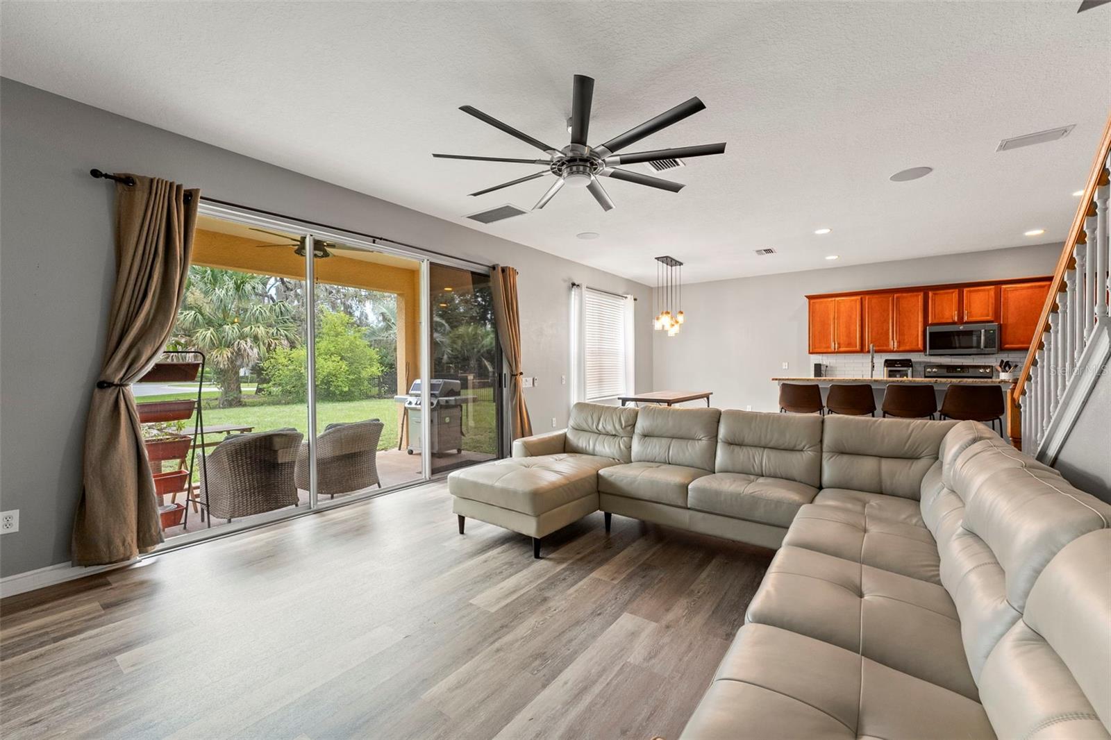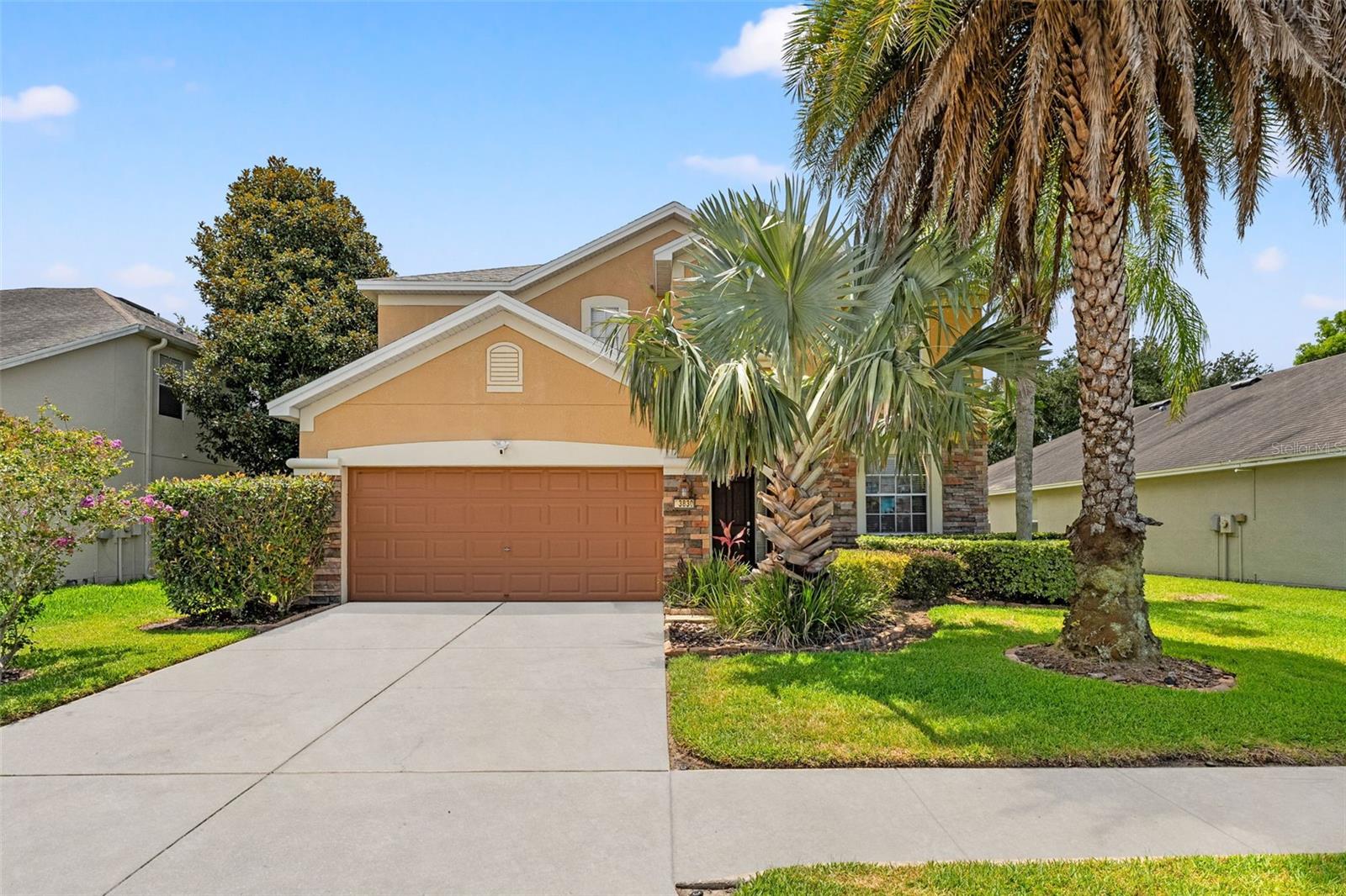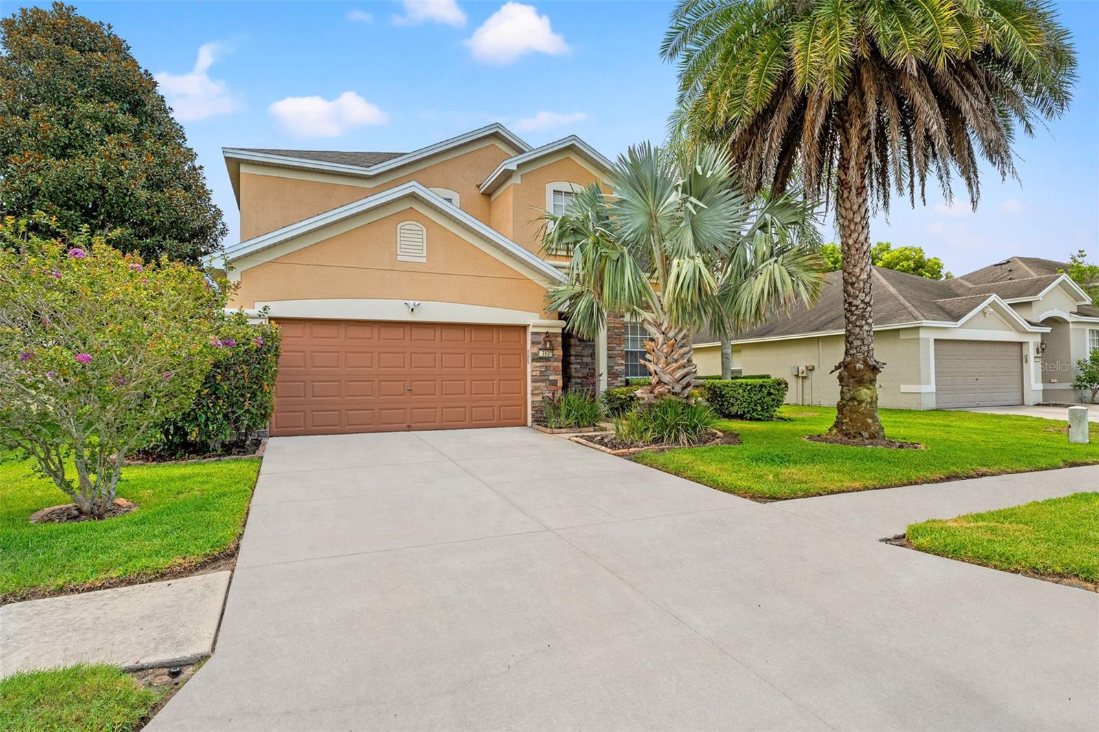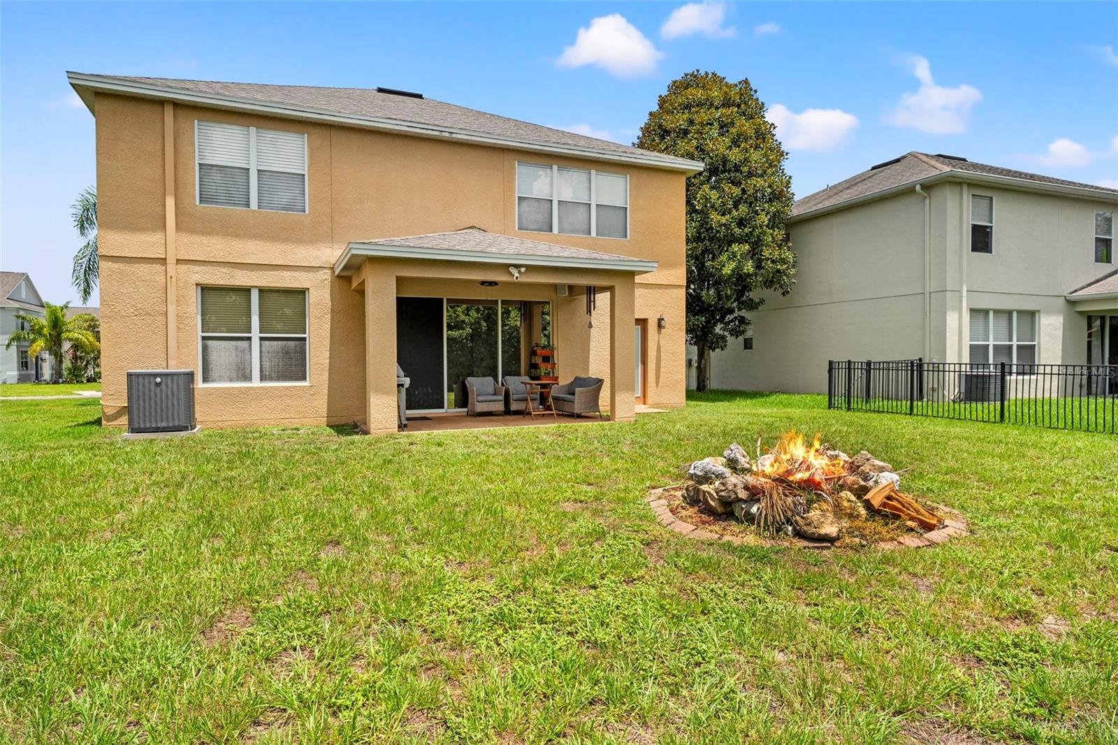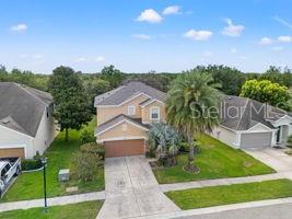 One or more photo(s) has been virtually staged. MOTIVATED SELLER!Gorgeous 4-Bedroom Home with Elegant Curb Appeal & Premium Upgrades! Welcome to this stunning 4-bedroom, 2.5-bathroom home that exudes charm from the moment you arrive. Beautifully landscaped with striking stone front elevation and an elegant 8-foot front door with phantom screen, this home is designed to impress both inside and out. Step into the bright and airy foyer featuring high ceilings with wood beam accents, Edison-style LED lighting, and durable ceramic tile floors. Off the entry, you'll find a versatile den/bonus room—perfect as a home office, playroom, or hobby space. The heart of the home is the gourmet kitchen, complete with :Rich cherry oak cabinetry,Granite countertops and ceramic backsplash,Stainless steel appliances,Stainless farmhouse sink with gooseneck faucet and built-in bottle washer,Breakfast bar with seating, plus a spacious pantry. Enjoy the open-concept layout with a large family room and dining area, prewired with indoor/outdoor speaker zones—perfect for entertaining. Oversized sliding glass doors lead to the covered lanai and expansive backyard—no rear neighbors, just wide-open space and your own cozy fire pit area.Convenient touches include:First-floor half bath with outdoor access (no need to track through the house!) Spacious laundry room with utility sink.Under-stair storage and multiple linen closets for added space.Upstairs, the oversized primary suite offers a peaceful retreat with:Dual walk-in closets,Large ensuite bath with tub, step-in shower, double vanity, and private water closet.Abundant natural light from well-placed windows.Three additional bedrooms (two with walk-in closets) and a full bath complete the second floor.Additional highlights:Updated ceiling fans, window treatments, blinds, and thermostats. New Roof 2024. Access to resort-style amenities: clubhouse, fitness center, pool, playground, tennis & basketball courts, dog park, and fishing pier — all included with the low HOA fee. Don’t miss your chance to own this move-in-ready, thoughtfully designed home in a desirable community. Schedule your private showing today!