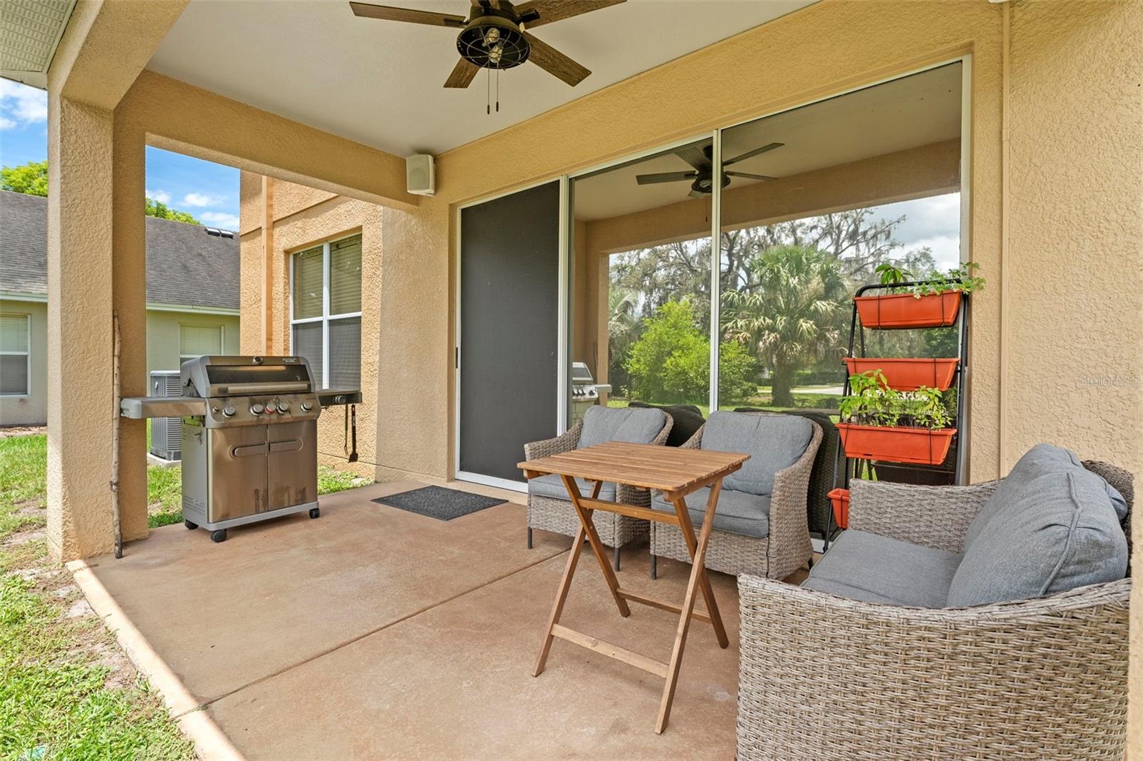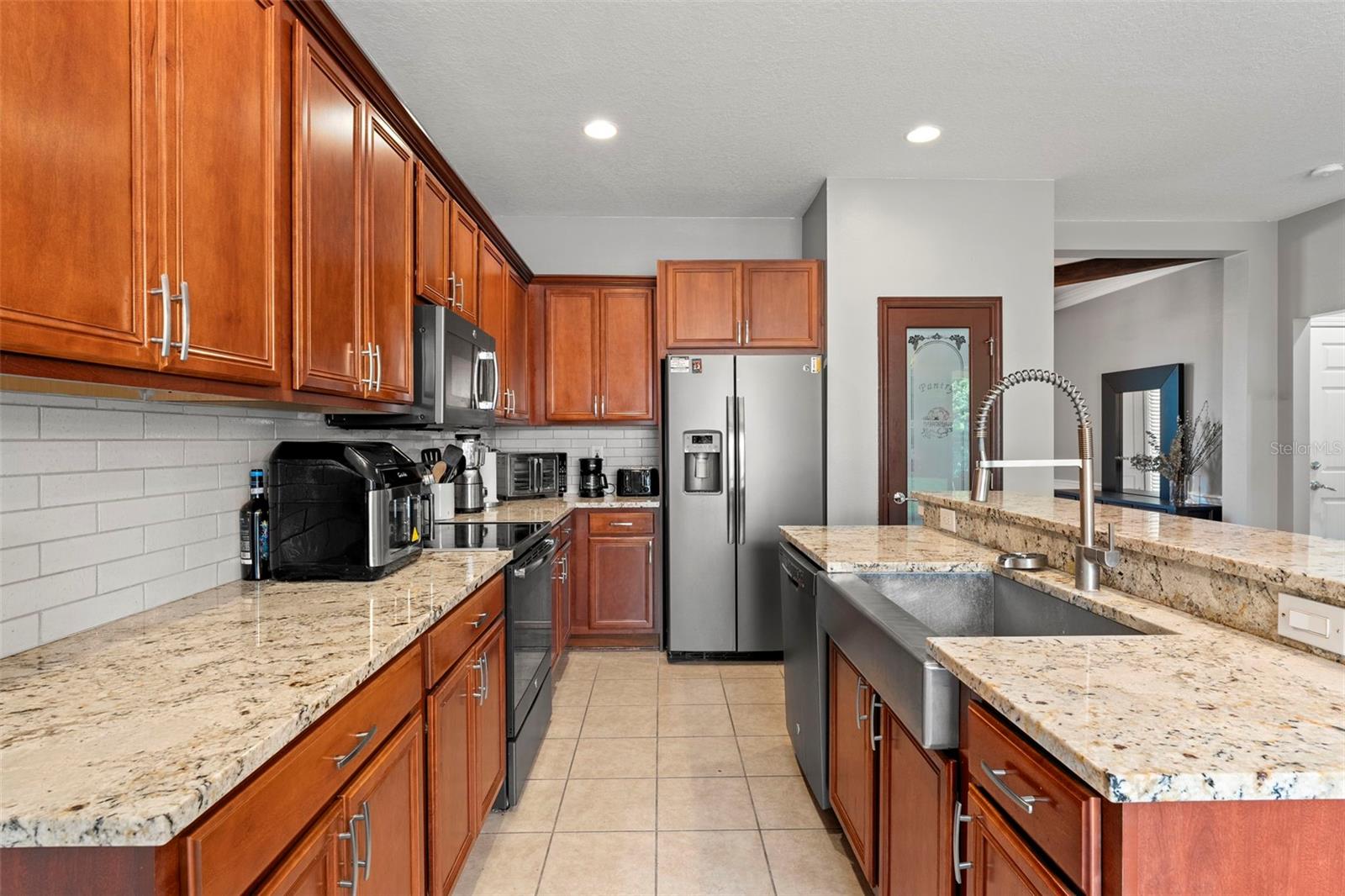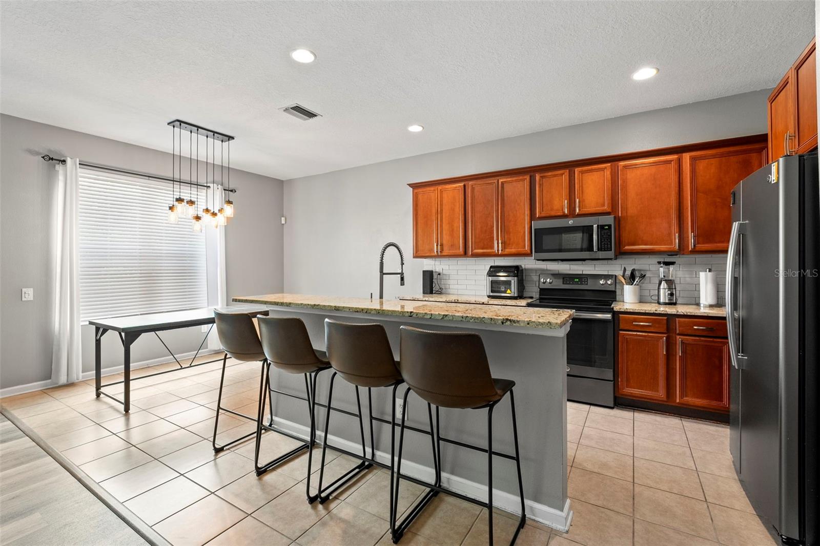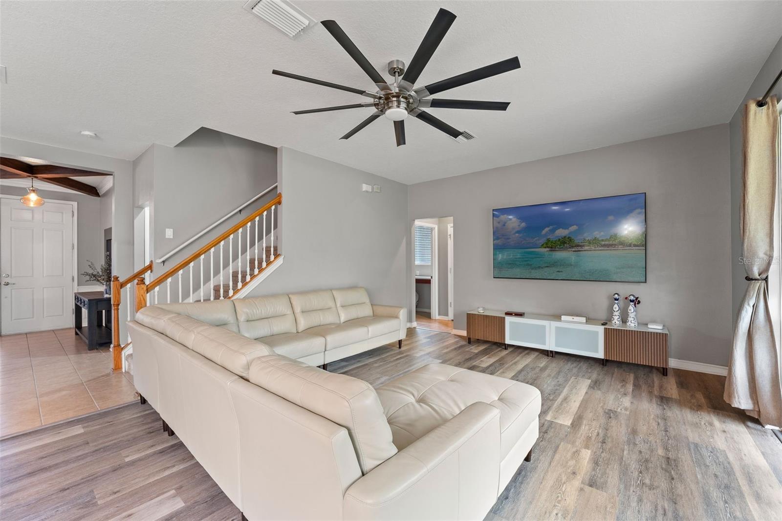 One or more photo(s) has been virtually staged. MOTIVATED SELLER!Gorgeous 4-Bedroom Home with Elegant Curb Appeal & Premium Upgrades! Welcome to this stunning 4-bedroom, 2.5-bathroom home that exudes charm from the moment you arrive. Beautifully landscaped with striking stone front elevation and an elegant 8-foot front door with phantom screen, this home is designed to impress both inside and out. Step into the bright and airy foyer featuring high ceilings with wood beam accents, Edison-style LED lighting, and durable ceramic tile floors. Off the entry, you'll find a versatile den/bonus room—perfect as a home office, playroom, or hobby space. The heart of the home is the gourmet kitchen, complete with :Rich cherry oak cabinetry,Granite countertops and ceramic backsplash,Stainless steel appliances,Stainless farmhouse sink with gooseneck faucet and built-in bottle washer,Breakfast bar with seating, plus a spacious pantry. Enjoy the open-concept layout with a large family room and dining area, prewired with indoor/outdoor speaker zones—perfect for entertaining. Oversized sliding glass doors lead to the covered lanai and expansive backyard—no rear neighbors, just wide-open space and your own cozy fire pit area.Convenient touches include:First-floor half bath with outdoor access (no need to track through the house!) Spacious laundry room with utility sink.Under-stair storage and multiple linen closets for added space.Upstairs, the oversized primary suite offers a peaceful retreat with:Dual walk-in closets,Large ensuite bath with tub, step-in shower, double vanity, and private water closet.Abundant natural light from well-placed windows.Three additional bedrooms (two with walk-in closets) and a full bath complete the second floor.Additional highlights:Updated ceiling fans, window treatments, blinds, and thermostats. New Roof 2024. Access to resort-style amenities: clubhouse, fitness center, pool, playground, tennis & basketball courts, dog park, and fishing pier — all included with the low HOA fee. Don’t miss your chance to own this move-in-ready, thoughtfully designed home in a desirable community. Schedule your private showing today!