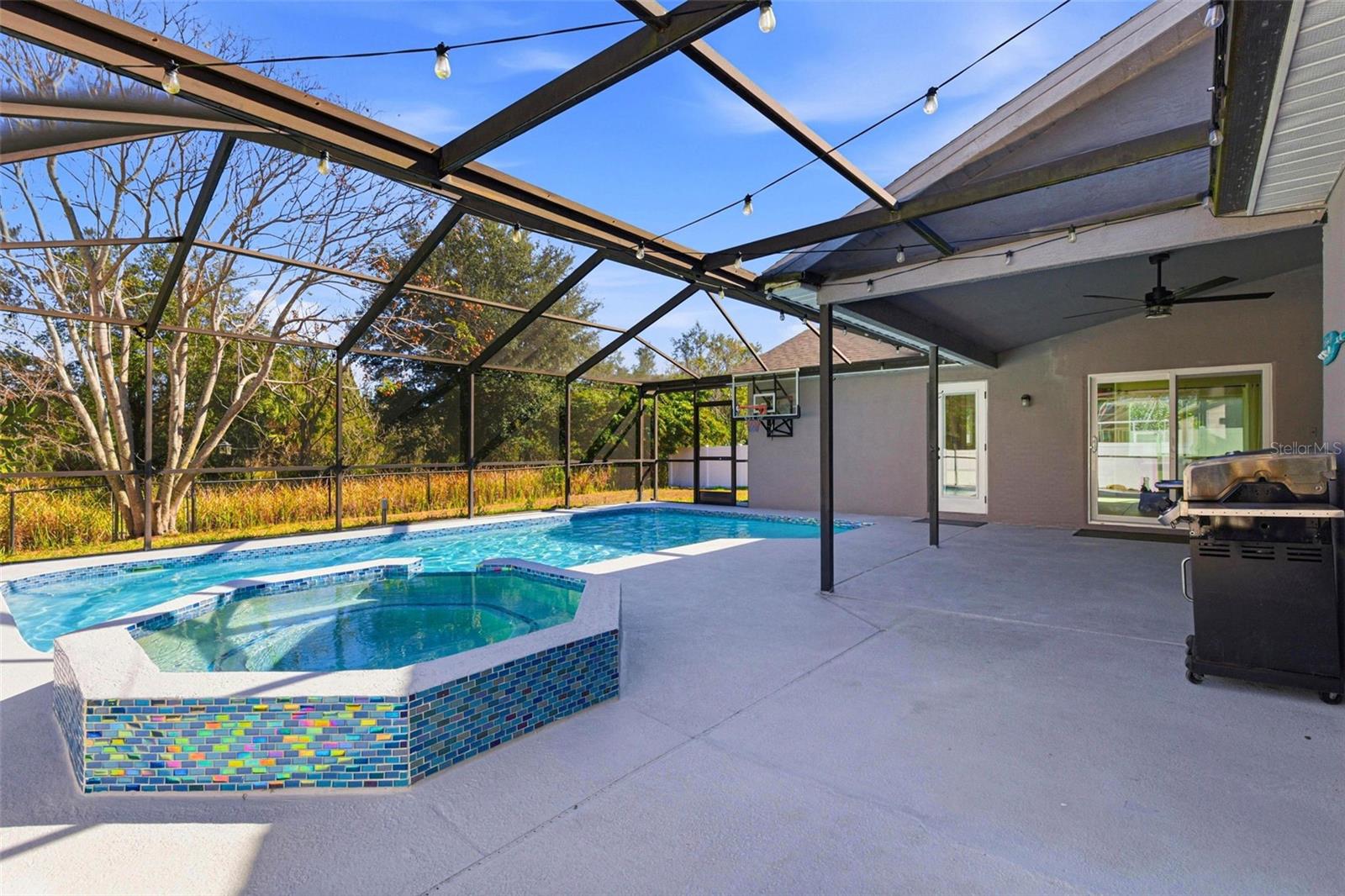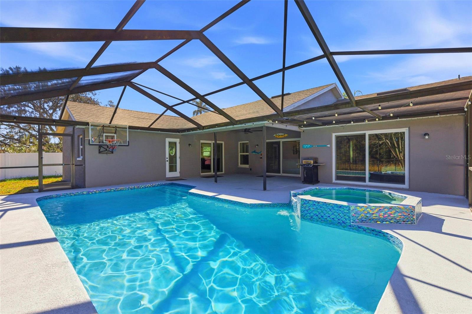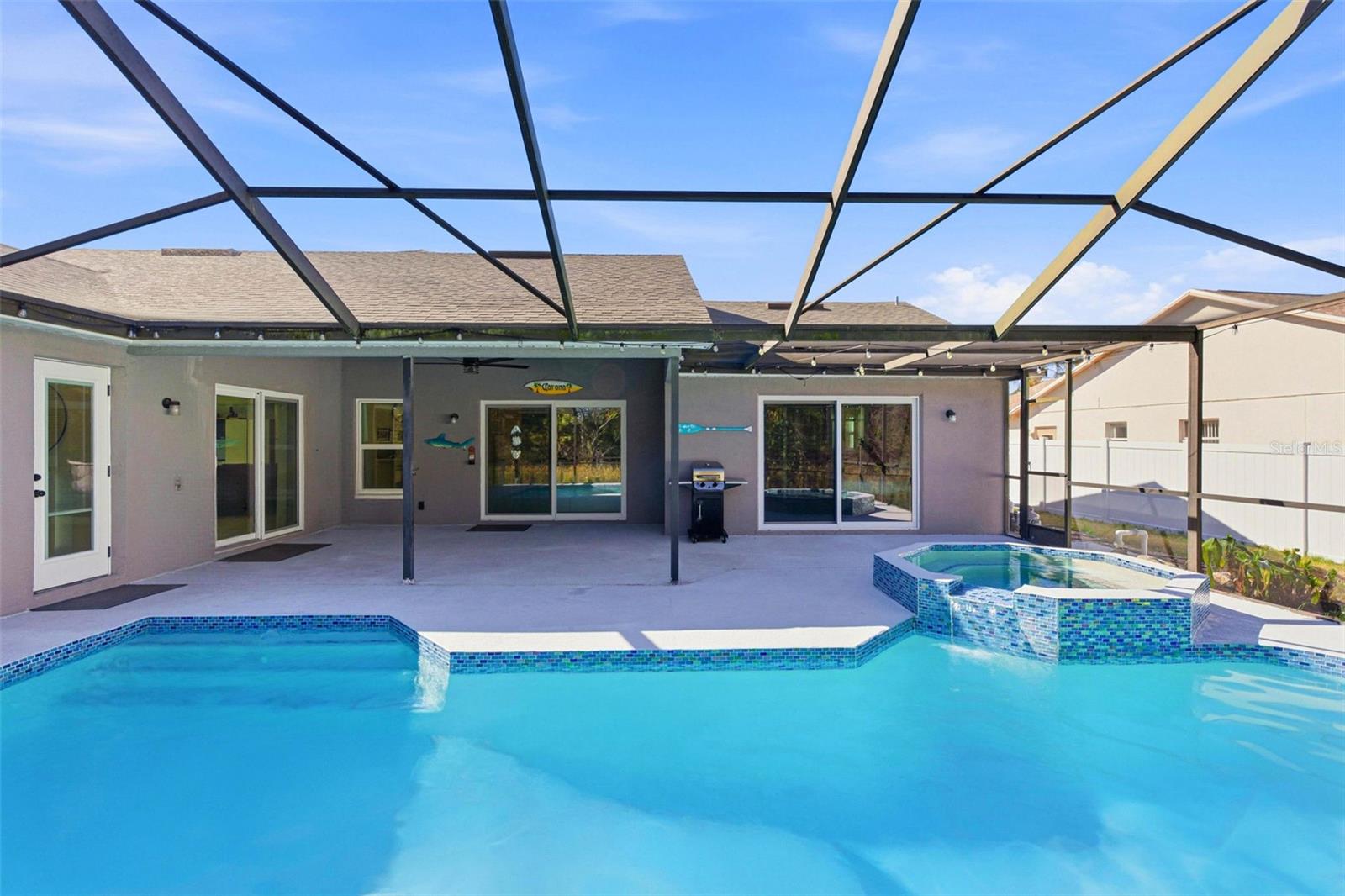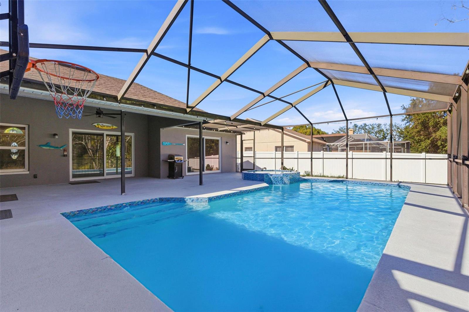 Welcome to this beautifully updated and move-in-ready home located in a desirable low-HOA community. This versatile property offers 3 bedrooms, 3.5 bathrooms, plus a spacious office that can easily serve as a 4th bedroom. A rare private studio apartment with separate entrance, full bath, and kitchenette (no range) makes this home ideal for multigenerational living, guests, or potential rental income. The main home features an open and elegant layout with vaulted ceilings, designer lighting, and a fully remodeled kitchen showcasing open shelving and new appliances, perfect for entertaining. The large living room provides ample space for relaxing and gatherings. The primary suite opens directly to the pool and includes a spa-inspired bath with a brand-new soaking tub and walk-in shower. Secondary bedrooms are generously sized and filled with natural light. Step outside to your private resort-style saltwater pool, recently resurfaced, with new pump and salt system, all overlooking a serene bird preservation area with no rear neighbors. The fully fenced backyard, expansive patio, and screened-in pool offering exceptional privacy and the perfect Florida lifestyle. Major upgrades include: • New roof, A/C, and water heater (2021) • Hurricane impact windows and doors with lifetime warranty (2024) • Fully remodeled kitchen and bathrooms (2024) • Pool resurfaced (2023); new pump and salt system (2024) • Fresh interior and exterior paint (2024) • Finished garage with epoxy floors and insulated door (2025) • New vinyl fence with double gate (2025) Conveniently located just ½ mile from Veterans Memorial Park, featuring a new playground and seasonal splash pad, with sidewalks and walking trails throughout the neighborhood. This home offers comfort, flexibility, privacy, and peace of mind. Schedule your private showing today.