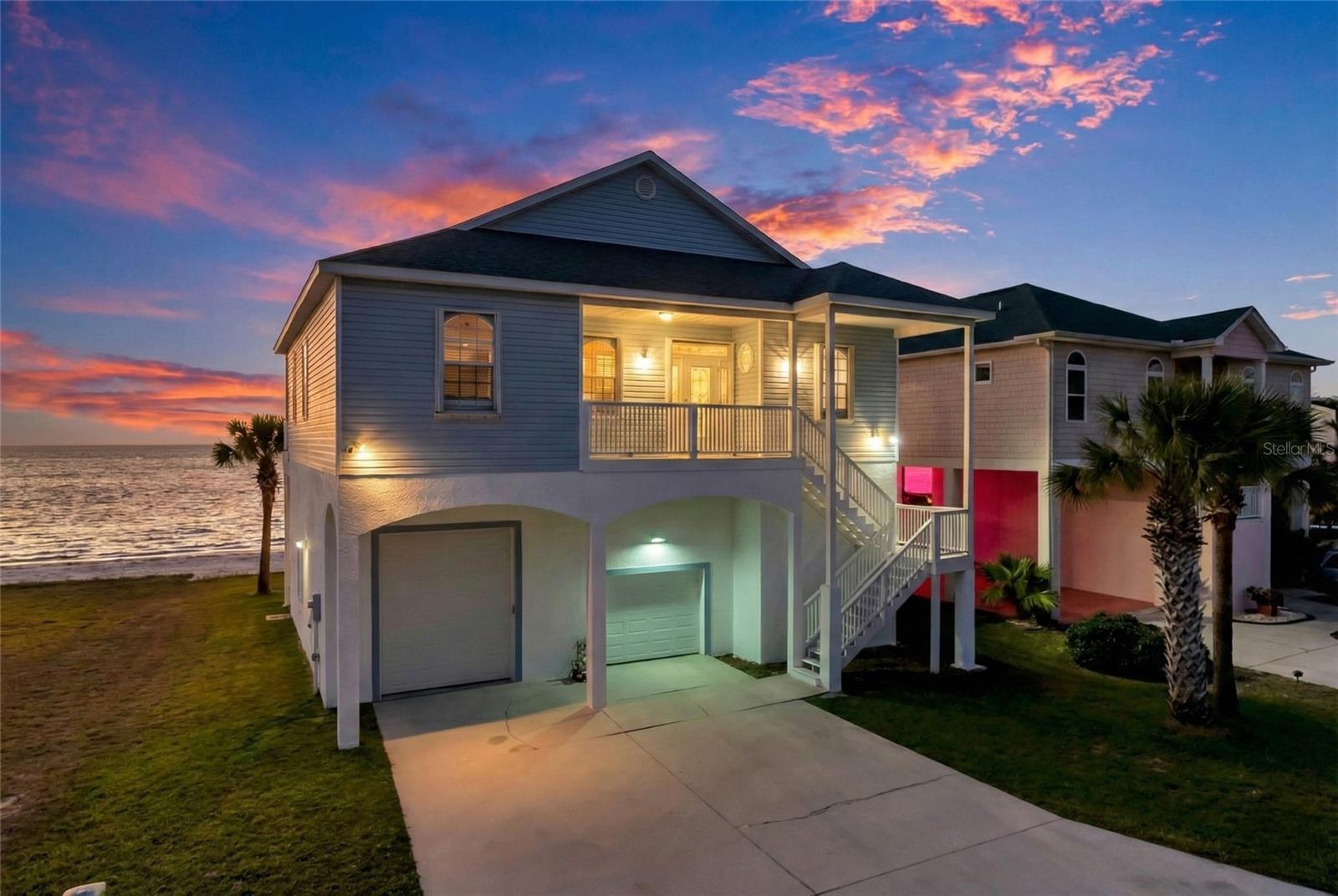 POETIC & PEACEFUL. Situated at the crown of "Cow Creek" with access to the open waters of the Gulf of Mexico. This elevated waterfront home offers breathtaking sunset views and water visibility from all living areas. Custom built by the current owner, this home has been meticulously cared for and proudly maintained by its original owner since construction. The main living area features soaring vaulted ceilings ranging from approximately 10 to 16 feet, expansive windows at every angle, with a double sided wood burning fireplace connecting both the great room and the primary bedroom. The home offers 3-bedrooms and 2-bathrooms with approximately 1,800 square feet of heated living space. A private elevator services the home. A spiral staircase provides additional access from the garage to the main living area. Below the home is approximately 1,640 square feet of garage space, offering extensive storage and flexibility. Covered outdoor living areas include approximately 1,200 square feet of open porches, creating multiple spaces to enjoy coastal breezes and sunsets. Items worthy of mention; Full HVAC system replacement in 2024 with a hypoallergenic filtration system added, complete new roof installed in 2019, (4) garage doors replaced in 2024, 80-gallon solar water heater (2018), whole house fan system, hurricane shutters and panels throughout, The home is equipped with (2) whole home electrical shutoffs, main electrical panel and subpanel, and a Goldline whole home electrical surge protection system installed at the main panel. Stand up attic space with pull down ladder access, offering convenient storage and accessibility. The interior was fully painted in 2017 and the exterior was pressure washed in January 2026. Custom wood flooring selected by the owners, crafted from a blend of red and white oak harvested from an 80-acre wood lot in Michigan. Please note the four-car garage features approximately 20-foot ceiling height, and about 15-feet of clearance to the bottom of the rafters. Three garage doors are standard height at approximately 7 feet, with one oversized garage door measuring approximately 11 feet, ideal for larger vehicles or specialty storage. A well-maintained seawall with substantial concrete capping enhances the waterfront setting. Boat lift present and not currently operational. Charming waterfront cutout along the concrete seawall creates an intimate spot for launching kayaks, quiet fishing, or enjoying peaceful water view. Fishing enthusiasts will appreciate excellent line and cast net fishing directly from the canal. Surrounded by mature trees and coastal habitat, the property regularly attracts dolphins and manatees and there is abundant birdlife including pelicans, herons, egrets, cormorants, loons, pileated rose beaks and other native species. Come own your Elevated Coastal Serenity today. Professional Video & Floorplan available upon request.