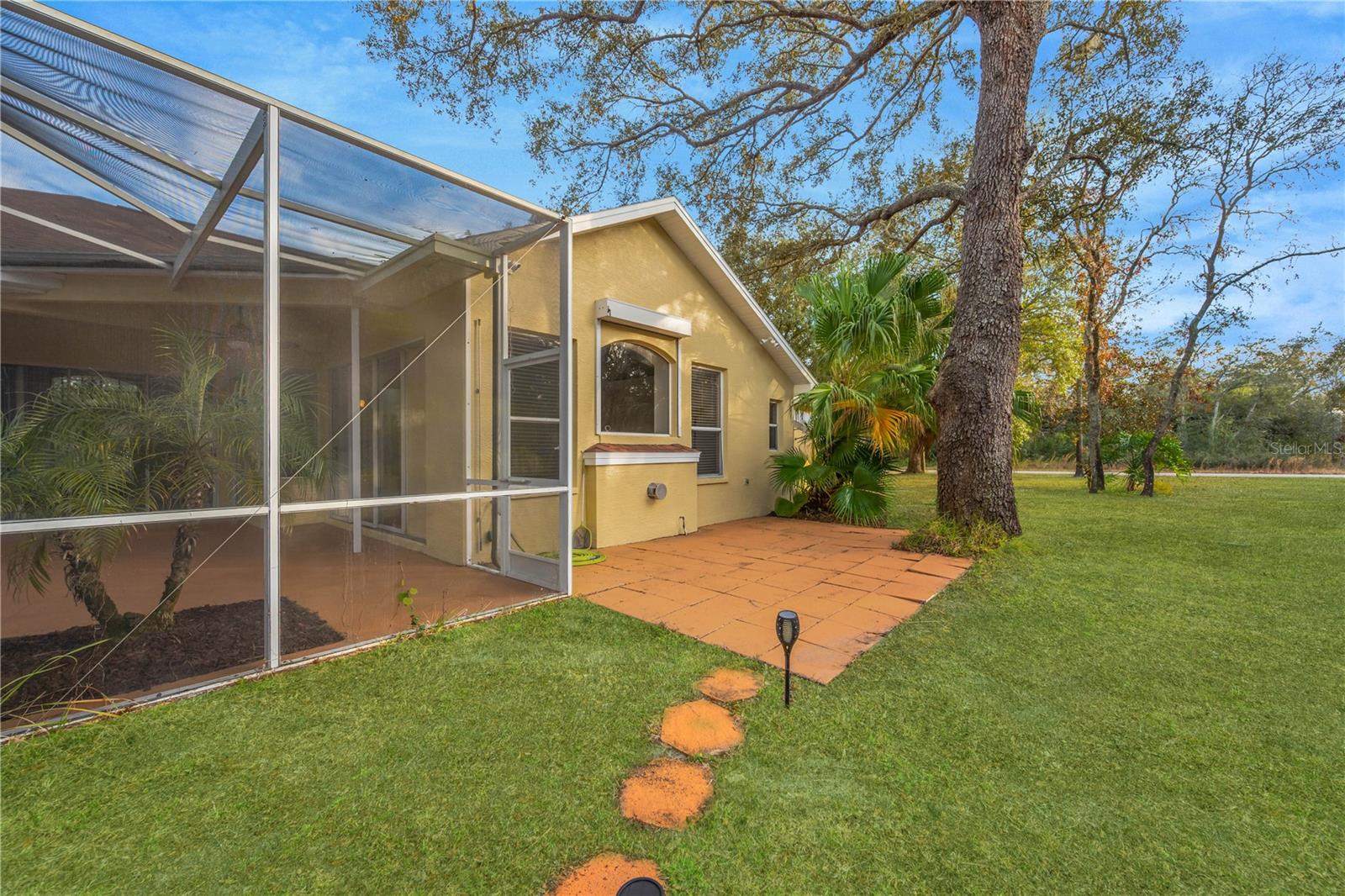 Situated beneath a grove of mature oak trees, this well-maintained home is located on 2 subdividable acres in a quiet Hudson neighborhood, offering privacy while remaining convenient to shopping, schools, and approximately 45 minutes to the airport. The residence offers three bedrooms and two bathrooms, including a recently renovated bathroom, luxury vinyl flooring throughout, and retractable shutters on main windows. Recent improvements include a roof replaced in November 2019 (less than six years old) and a recently replaced hot water heater. Pocket doors from the main living area open to the first lanai, featuring an easy-to-maintain decorative pond with waterfall providing tranquil indoor/outdoor living space. The second lanai houses a heated pool and spa, suitable for year-round enjoyment. The property also features a large artificial turf area that may be used as a dog run, outdoor seating area, or additional entertaining space. A spacious shed offers potential for a home office, studio, or other permitted use (buyer to verify). Surrounded by mature landscaping, this property presents a rare opportunity for acreage, flexibility, and convenient Florida living.