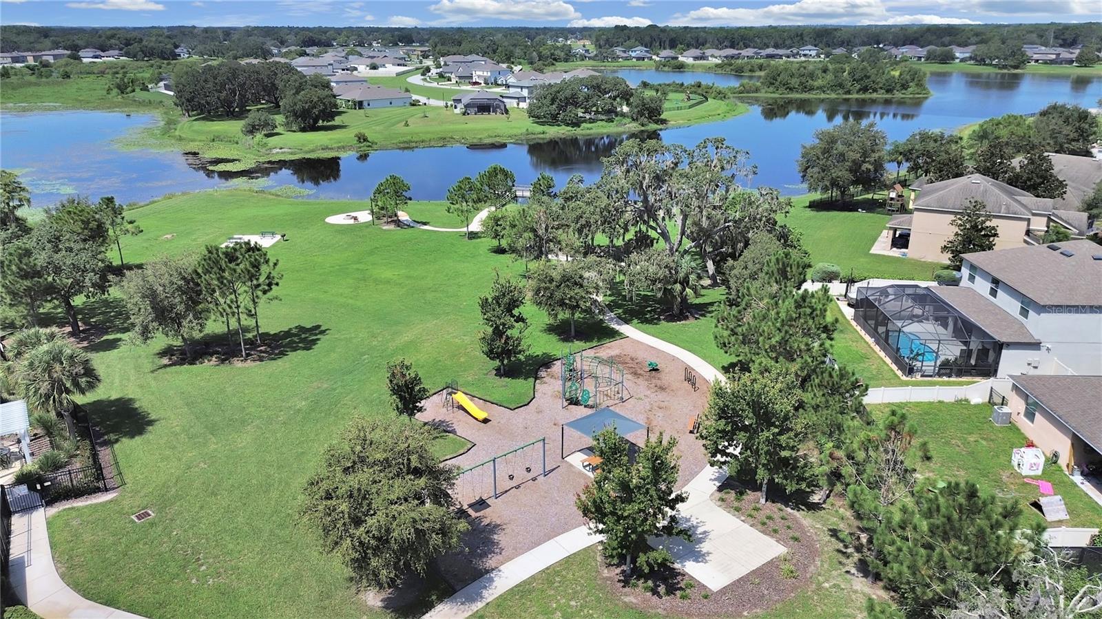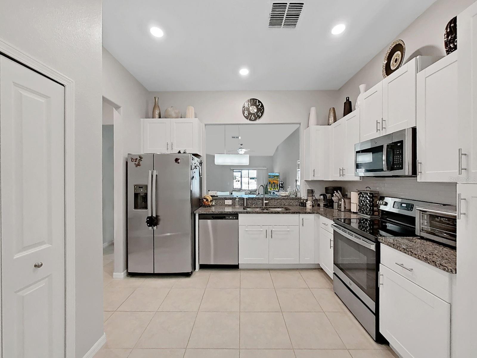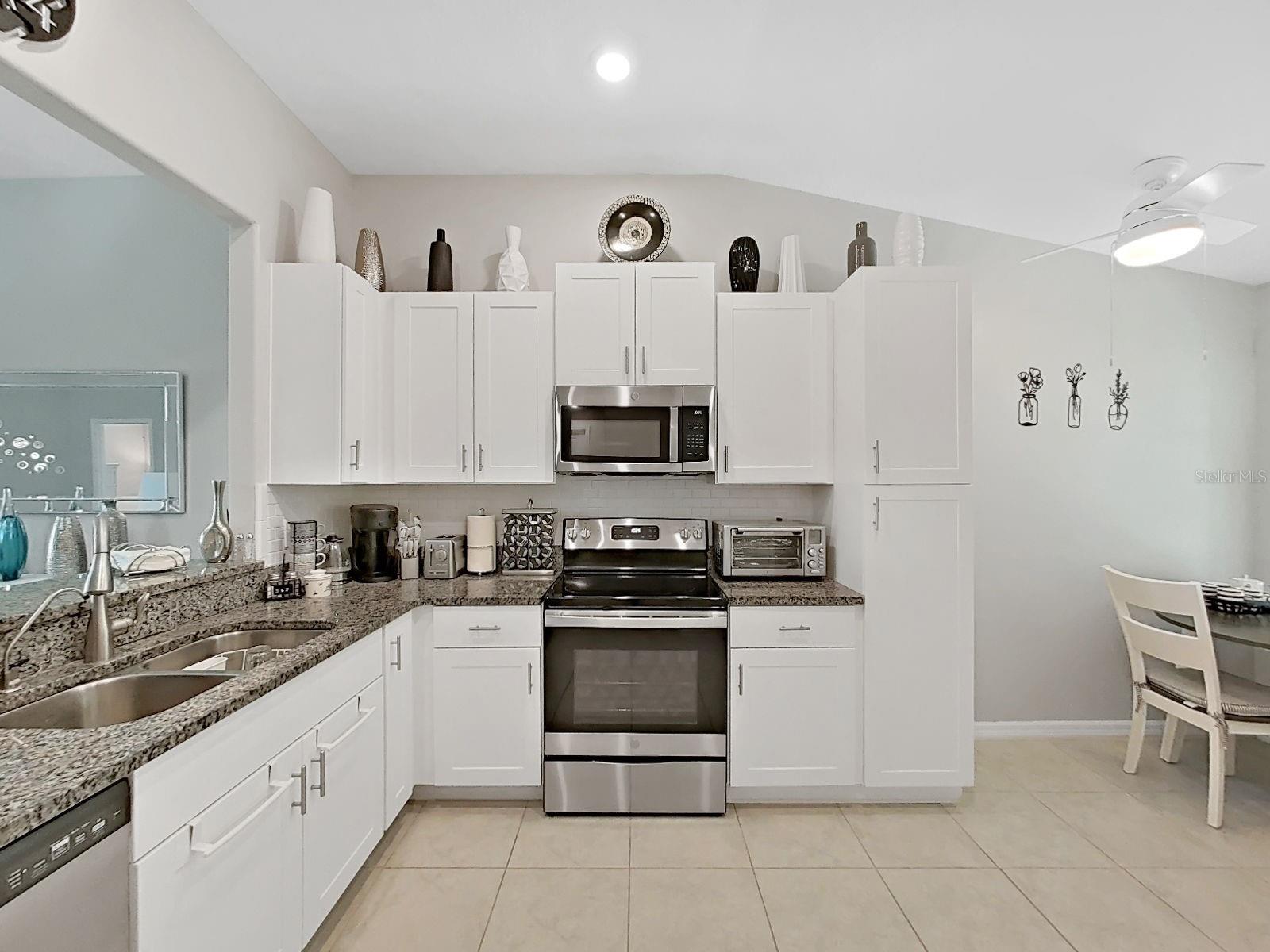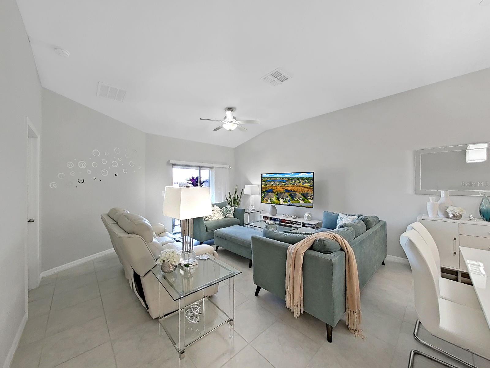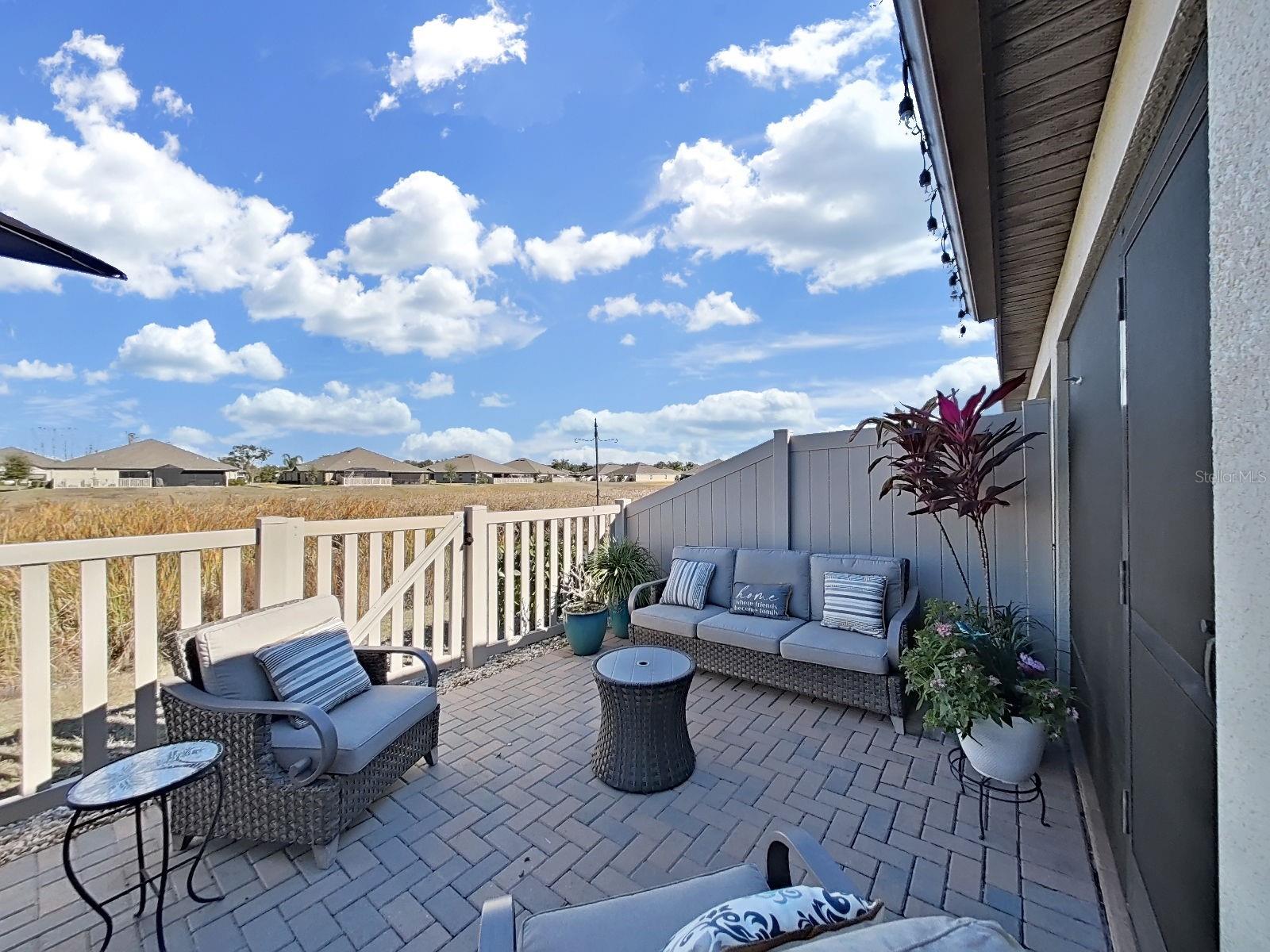 Welcome home to this beautifully maintained 2021-built villa-style residence offering 3 bedrooms, 2 bathrooms, and a 2-car garage, perfectly positioned with peaceful water and preserve views. This move-in-ready home features a spacious open floor plan, high ceilings, and a light-filled family room with sliding glass doors that seamlessly connect indoor and outdoor living. The modern kitchen is designed to impress with stainless steel appliances, white staggered-height cabinetry, an eat-in kitchen, and a dining area conveniently located just off the kitchen—ideal for both everyday living and entertaining. Enjoy Florida living at its best outdoors on the screened, covered lanai with ceiling fan, overlooking a large brick-paver patio and vinyl-fenced backyard, complete with a rear picket fence and gate. The low-maintenance exterior makes this home as practical as it is inviting. Additional features include tile and laminate flooring, ceiling fans in every bedroom and the great room, energy-efficient LED recessed lighting, and washer and dryer included. Located in a desirable lakeside community, residents enjoy a waterfront clubhouse with fitness center, resort-style pool, basketball and tennis courts, playgrounds, picnic areas, fire pit, gazebos, nature trails, community dock, and dog parks—all surrounded by scenic natural beauty. This home offers the perfect blend of comfort, style, and resort-style amenities—schedule your showing today!