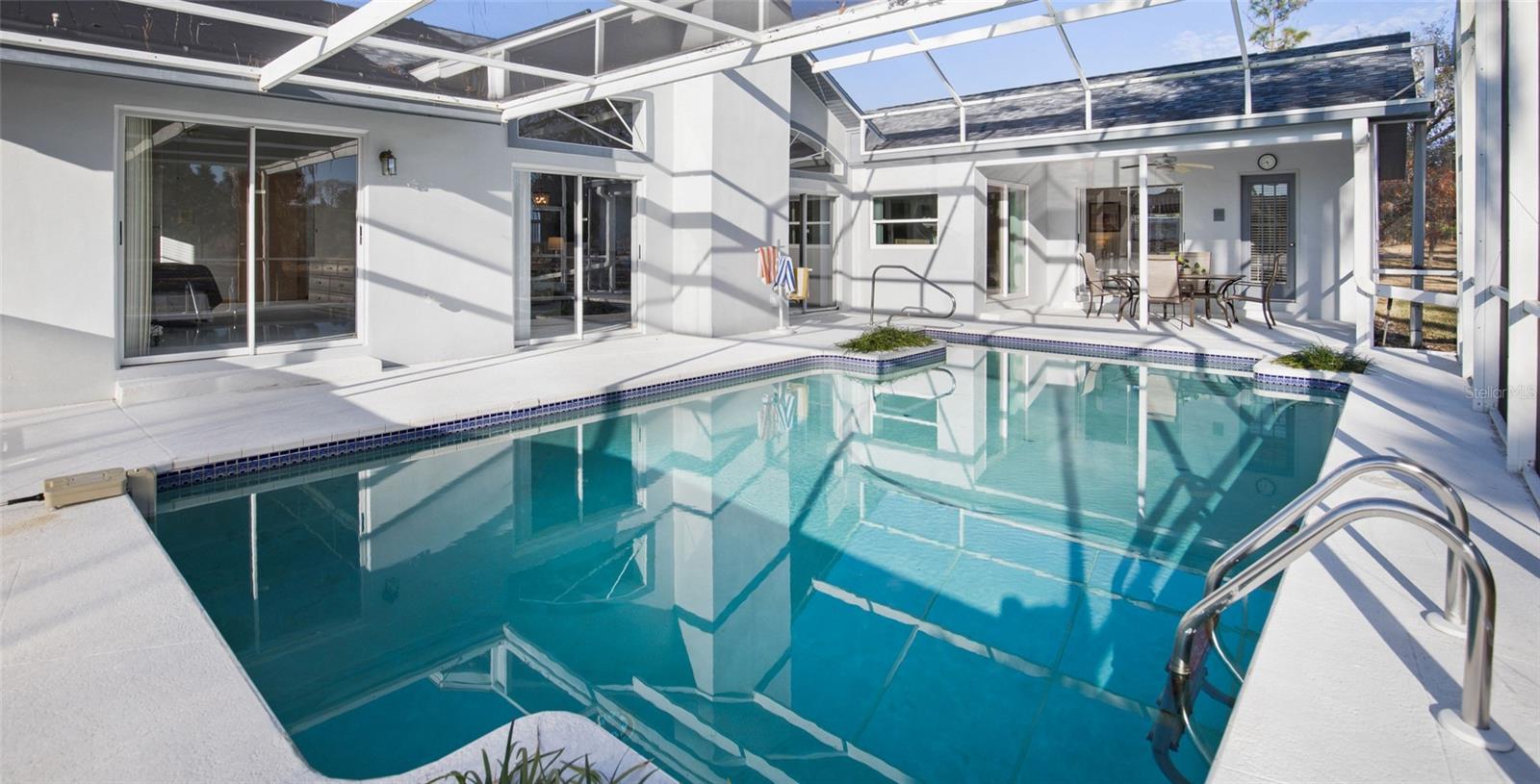 STOP THE CAR! AMAZING FIND - LARGE POOL HOME WITH PRIVACY GALORE! NO REAR NEIGHBORS. AMAZING VIEWS! 2 PRIMARY EN SUITE BEDROOMS! HEATED POOL - SCREENED CAGED POOL FEATURES NEW PUMP SYSTEM, SALT WATER AND SOLAR HEATED FOR YEAR ROUND ENJOYMENT. NEW $18k ROOF PLACED IN 2022. BRAND NEW HVAC SYSTEM 2025. 4 BEDROOM, 3 BATH, OVERSIZED 2 CAR GARAGE. OVER 2400 SQ FOOT OF INDOOR HEATED LIVING SPACE. SPLIT BEDROOMS FOR PRIVACY. MULTIPLE SLIDERS TO ACCESS THE POOL - EACH ENSUITE BEDROOM HAS PRIVATE POOL ACCESS. MASSIVE SUNKEN GREAT ROOM WITH FIREPLACE AND KITCHEN PASS THRU. 2 BATHROOMS HAVE HAD LUXURY MAKEOVERS TOP TO BOTTOM! POCKET DOORS. LOTS OF STORAGE. UPDATES TO FLOORING AND CEILINGS IN THE KITCHEN. RECESSED LIGHTING. SKYLIGHTS. INSIDE LAUNDRY. 2 POOL COVERS INCLUDED. ALL FURNISHINGS - EVERYTHING INCLUDING KITCHEN WARES CAN BE INCLUDED IN THE SALE! ONE OF THE BEST LOCATIONS IN THE COMMUNITY WITH ONE OF THE BEST OVERSIZED DRIVE WAYS FOR GUEST PARKING! VERY LARGE LOT IS .29 (OVER A QUARTER ACRE - NATURE VIEWS, TRAILS TO EXPLORE - PRIVACY AWAITS YOU HERE! LOW ANNUAL HOA. COVERED ENTRYWAY + POOL BATH + 2 DINING AREAS + BUILT IN SHELVING + VERY SPACIOUS BEDROOMS. LOCATED CLOSE TO PUBLIC TRANSIT, MEDICAL, GROCERY, RESTAURANTS AND DRIVING DISTANCE TO ALL OF THE BEST WEST COAST BEACHES. 2 HOURS TO DISNEY. GREAT LOCATION! HOME HAS BEEN A WINTER RETREAT FOR YEARS. WELL MAINTAINED, NO PETS AND NO SMOKING. WORTH TOURING. THE PRIVACY VIEW IS SOMETHING VERY SPECIAL & PRICELESS! BACK YARD TRAILS FOR WALKING OR BIKING. DOUBLE DOOR ENTRY. TOUR THIS ONE TODAY BEFORE IT'S TOO LATE! NOT IN FLOOD ZONE.