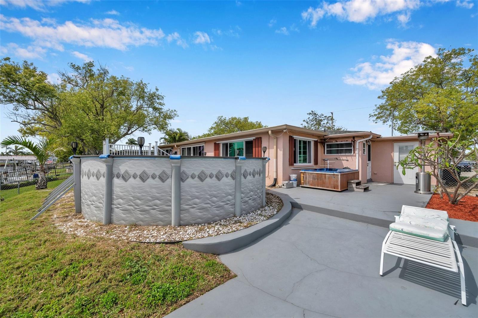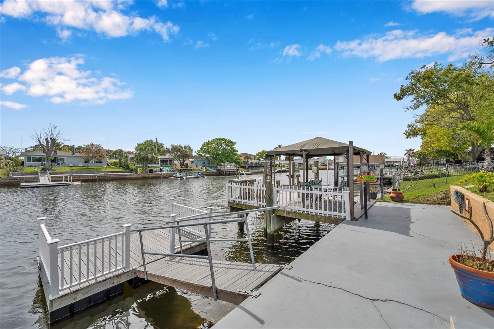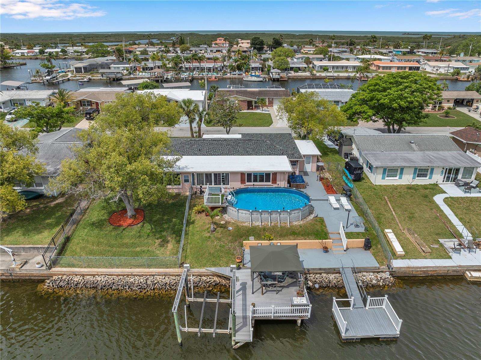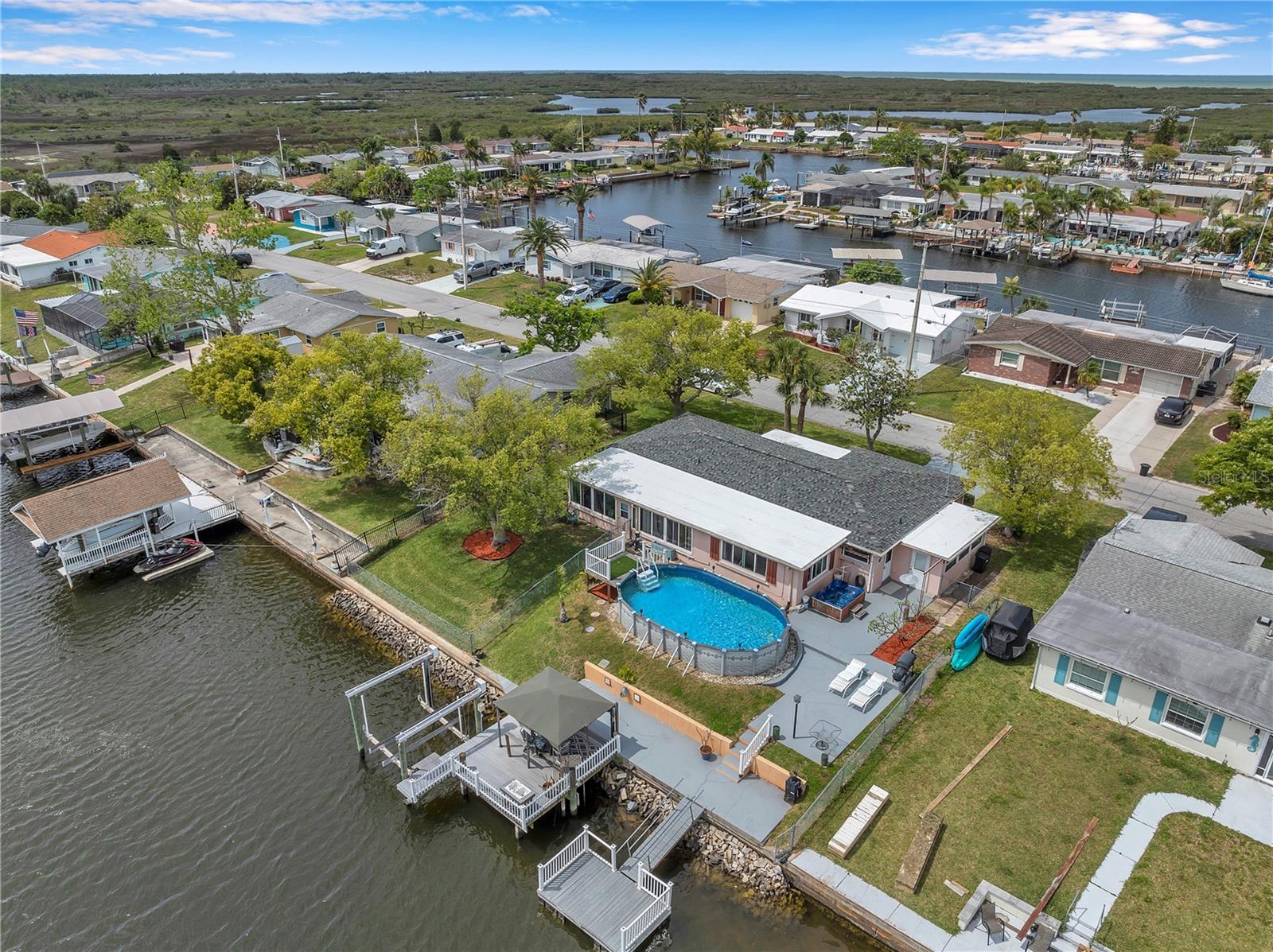 LOOK NO FURTHER. This exquisite 1574 sq ft: 3/2/2 WATERFRONT/CANAL/POOL HOME is located in the coveted Leisure Beach neighborhood in Hudson, Florida. This property offers waterfront living at its finest & boasts a BRAND NEW ROOF FEB 2024 & much more! This home sits on high grounds, in the past 11 years this home has NEVER FLOODED and never filed an insurance claim for flood or other because street has never flooded. Situated on 1.5 spacious lots, with 2 fenced yard areas with a sturdy 4' chain link, providing ample privacy and security. Step outside to enjoy 90 feet of your waterfront seawall with riprap guarding the seawalls integrity, a serene waterfront experience, which is less than a 15-minute boat ride to the beautiful open waters of The Gulf of Mexico. Truly a Fisherman's & Boaters Paradise. Indulge in leisurely afternoons by the above-ground pool or soak in the tranquility from the hot tub. The property also includes a generously sized partially covered dock, perfect for countless sunsets and for storing your watercraft. The remote-controlled 10,000 LB boat lift ensures convenient access to water adventures with tons of boating, fishing, kayaking & Dolphin Watching! The home's interior is equally impressive, with updates galore. From the fresh interior paint, the newly installed laminate tile flooring throughout to the updated appliances in the kitchen, including the extra fridge in the garage, making it truly move-in ready. Additional features include hurricane shutters with a transferable lifetime warranty, modern electrical system, a maintained drain system, a leaf filter system in gutters, a recently updated water heater.and updated sewer lines (2021) for added peace of mind. Comfort is paramount with a new Drain Sensor for the Central A/C, and the double-paned windows, which enhance energy efficiency, while a negative termite inspection provides further reassurance. With 3 bedrooms, 2 bathrooms, 2 car garage & the extra workshop room this home has ample flexible space for customization, this home offers both comfort and versatility. Don't miss the opportunity to make this lifestyle your own—schedule a showing today and envision the endless possibilities that await!