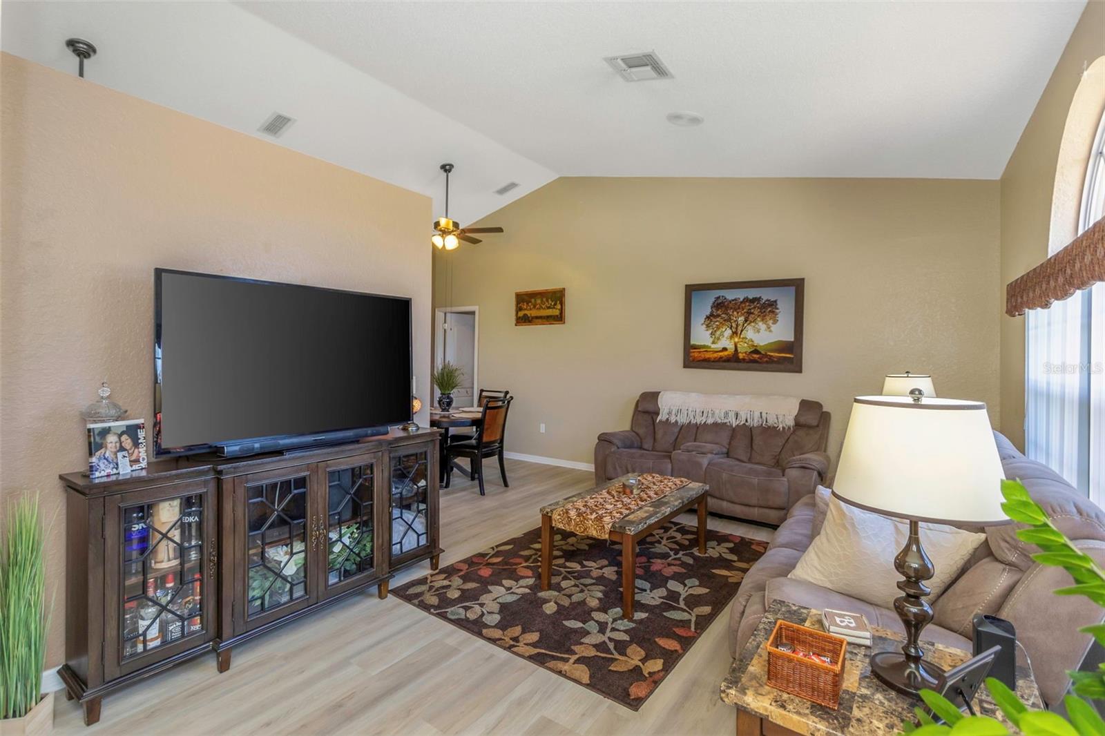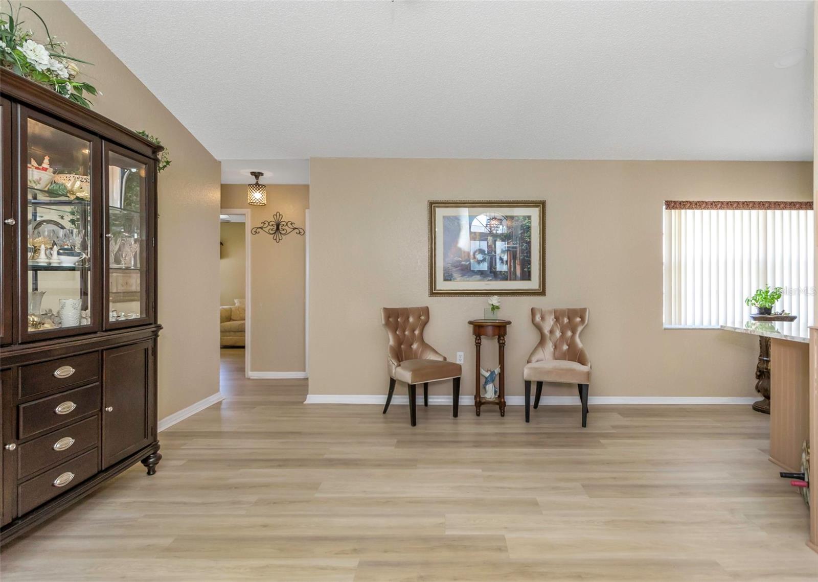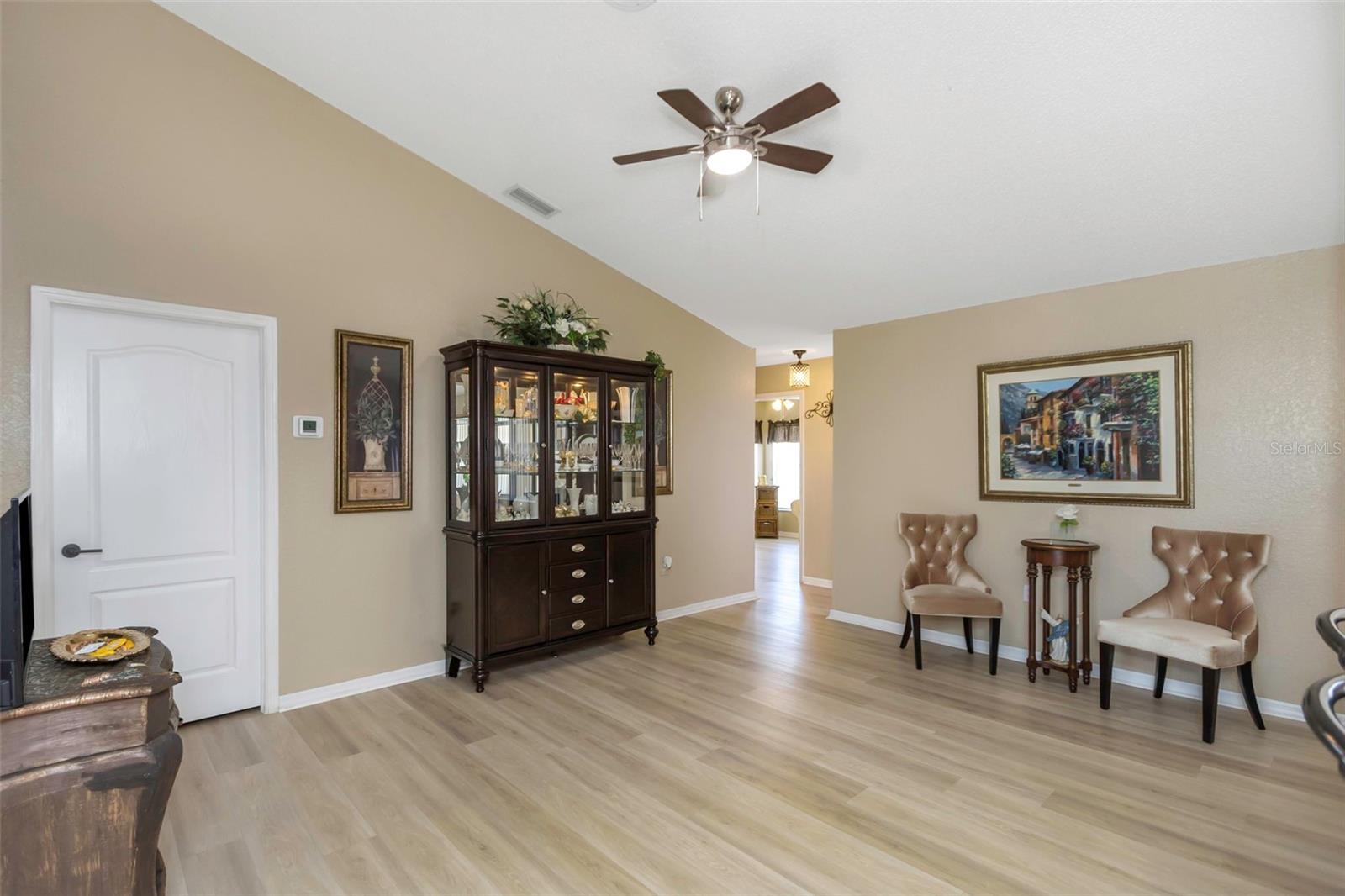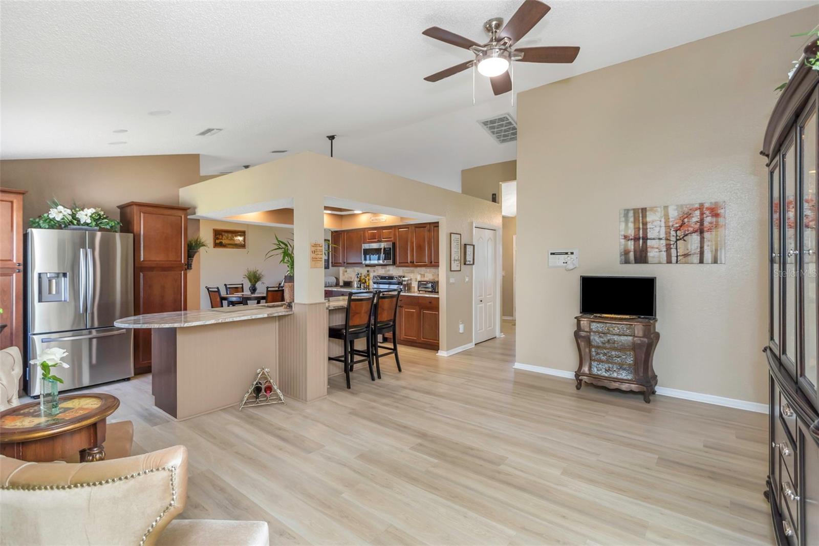 This gorgeous single-story house is perfectly placed on a generous corner lot and features three cozy bedrooms, two full baths, and a spacious two-car garage—all designed with your comfort in mind. As you arrive, the home’s appealing exterior and well-kept landscape immediately catch your eye, leading you to the impressive double front doors with tasteful glass details. Inside, a welcoming foyer greets you, setting the stage with attractive luxury vinyl plank flooring that extends throughout the home. To your right, a warm formal living room invites you in, while the nearby eat-in kitchen and master suite radiate style and ease. On the left, find a flexible dining room ideal for cherished moments with loved ones. The kitchen, truly the heart of this home, is designed for those who love to cook, boasting NEW CABINETRY, striking Copacabana granite countertops, a breakfast bar, and an island—all supported by two large pantries for all your storage needs. Natural light floods in through the windows, highlighting the kitchen’s allure. It’s also equipped with modern stainless steel appliances. The roomy dining space offers an extra touch of family comfort. Slide open the doors to the bright Florida room, which provides additional storage and a peaceful spot for unwinding. The master bedroom is a restful retreat, complete with a ceiling fan, two walk-in closets, custom blinds, and the same elegant flooring found throughout the home. The master bath is a sweet escape, featuring dual vanities, plenty of cabinet space, a refreshing walk-in shower, and a deep soaking tub for the ultimate relaxation. With a NEW ROOF & A/C 2022, RENOVATED KITCHEN, NEW FLOORS & PAINT, this home is well-maintained and ready for you to move in. Outside, the large yard beckons with potential for outdoor fun and the option to add a personal pool or design your own garden paradise. Barrington Woods offers a wealth of amenities, including a pool, fitness center, lit tennis and pickleball courts, a vibrant clubhouse, billiards, and a library—all with LOW HOA fees and NO CDD fees. Located conveniently close to fine shopping, dining, beautiful beaches, marinas, and major highways to international airports, this home presents a rare chance to live the Florida dream. Don’t let this opportunity slip away—book a private tour today and start making memories in what could be your new home! This is YOUR HOME!