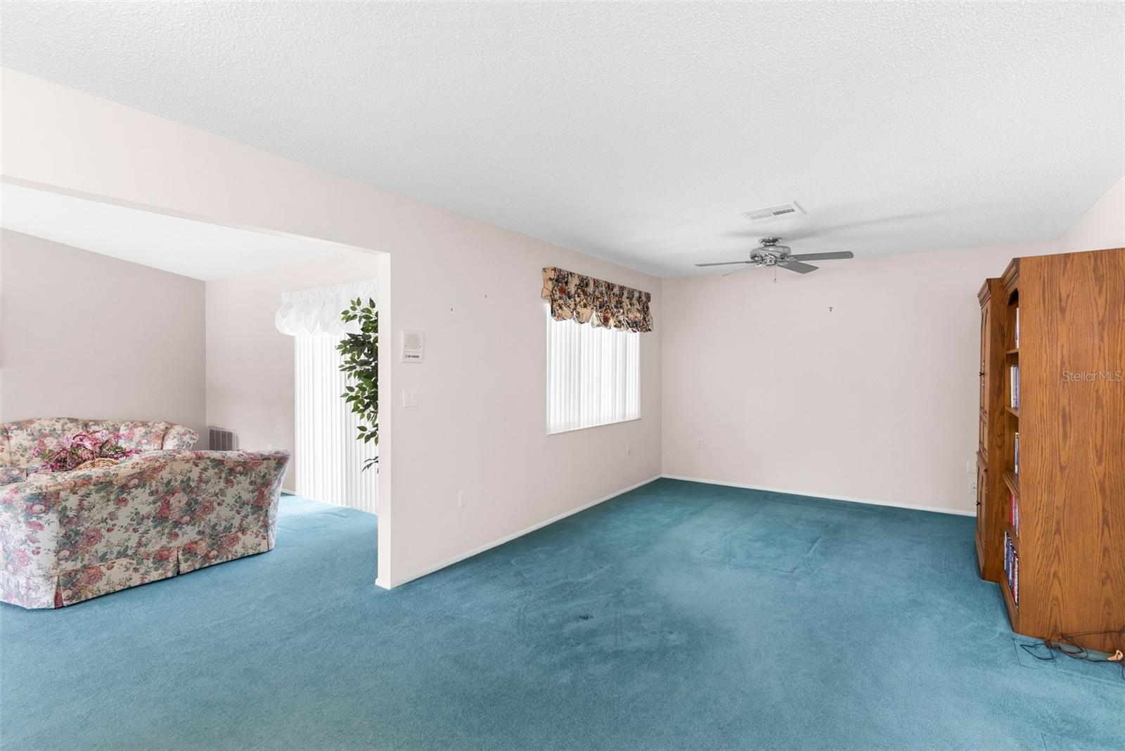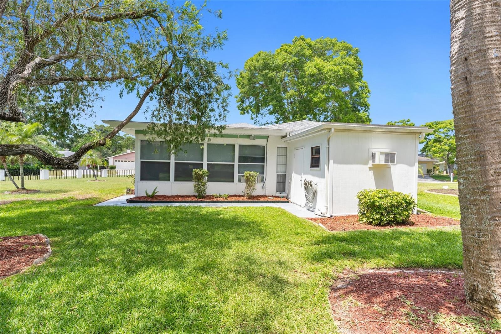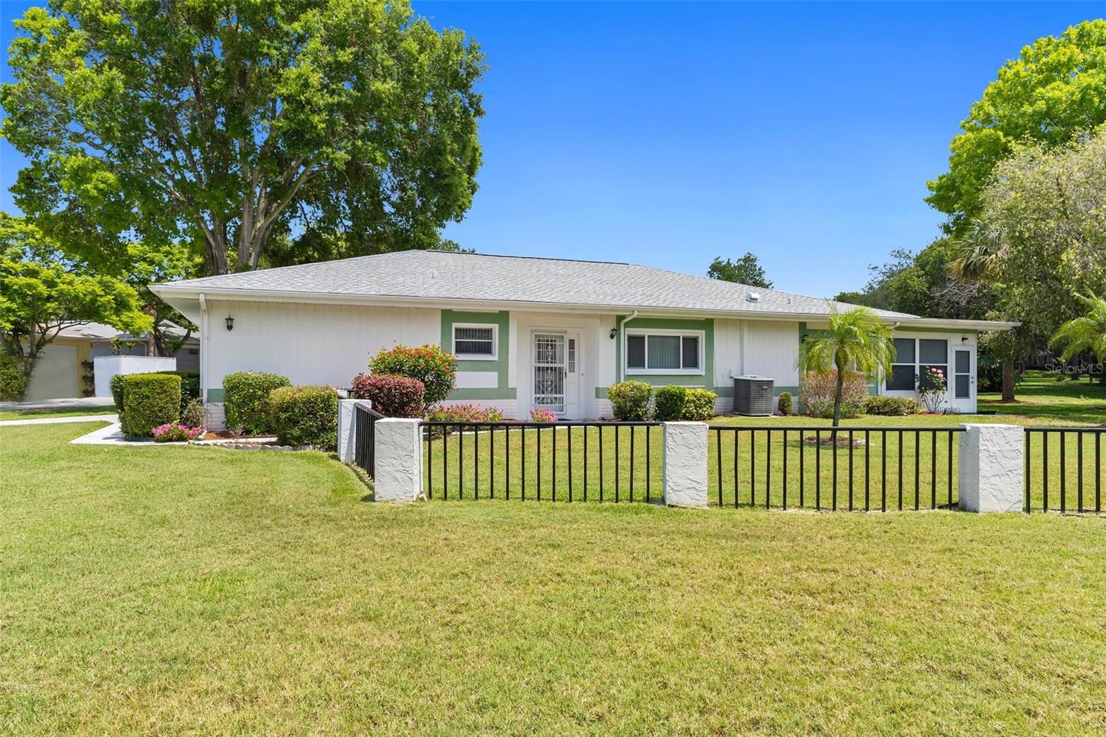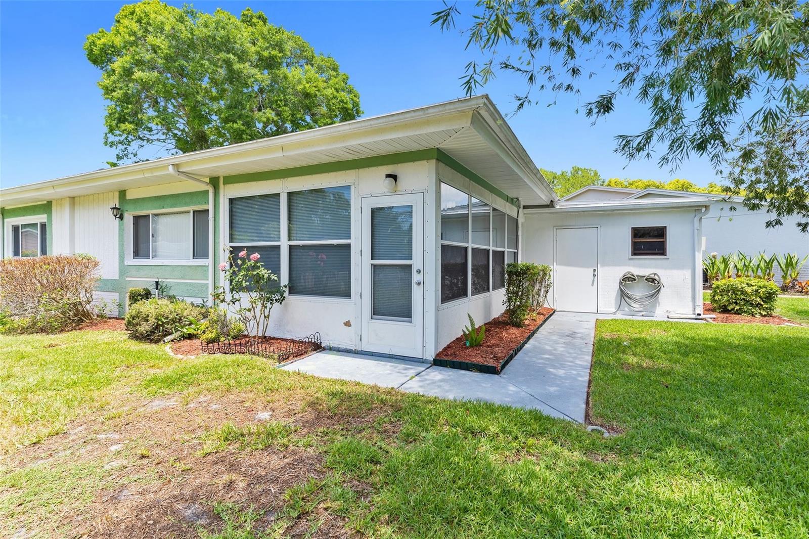NEW PRICE IMPROVEMENT! Spacious with lots of potential this two bedroom, two bathroom home located in a peaceful neighborhood. This property offers a flexible layout with a living room, dining room, den, bonus room, and a cozy kitchen. Upon entering, you're welcomed into a bright living room, the adjacent dining room provides a space for formal meals or casual gatherings. The den offers a cozy retreat, and the bonus room provides additional space for a playroom, hobby area, or home office. Step outside onto the large porch, enclosed with glass windows and equipped with its own AC unit, offering a serene space to relax or entertain. Additionally, the property includes a spacious yard with the bonus storage shed that's equipped with electricity and AC, making it perfect for a workshop, studio, or extra storage. There is a water softener and water filtration system, newer windows and irrigation. The roof was done in 2023. The community offers a clubhouse, pool and golf. The home is conveniently located near hospitals, schools and shopping