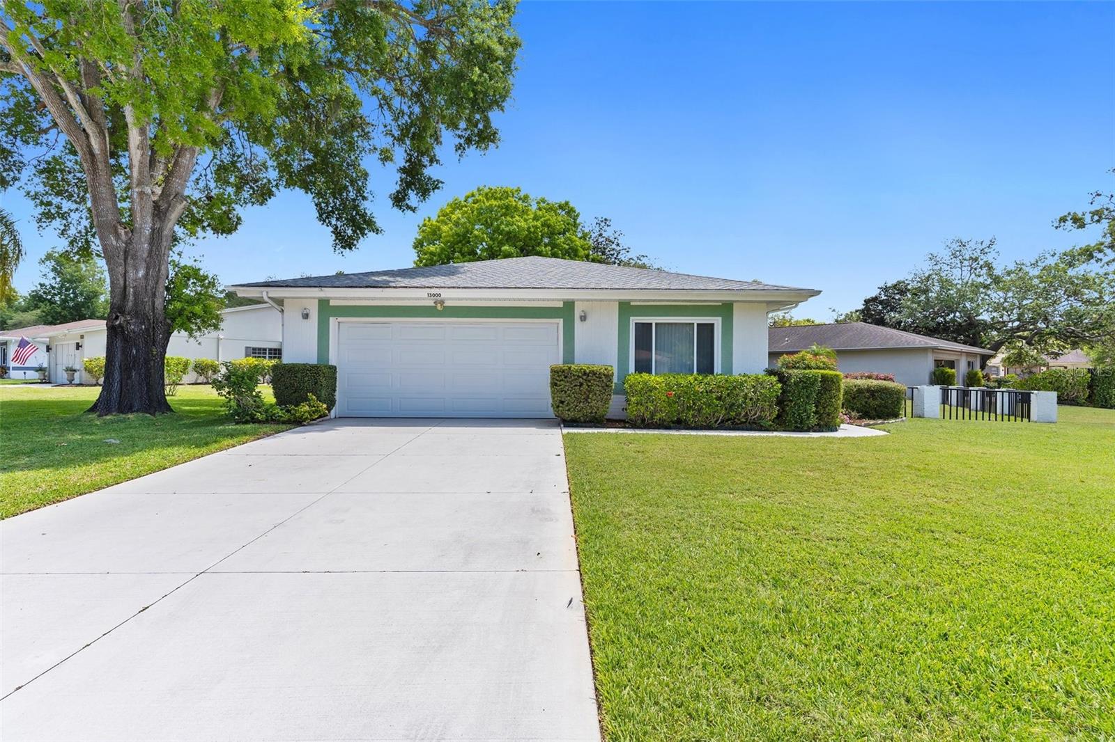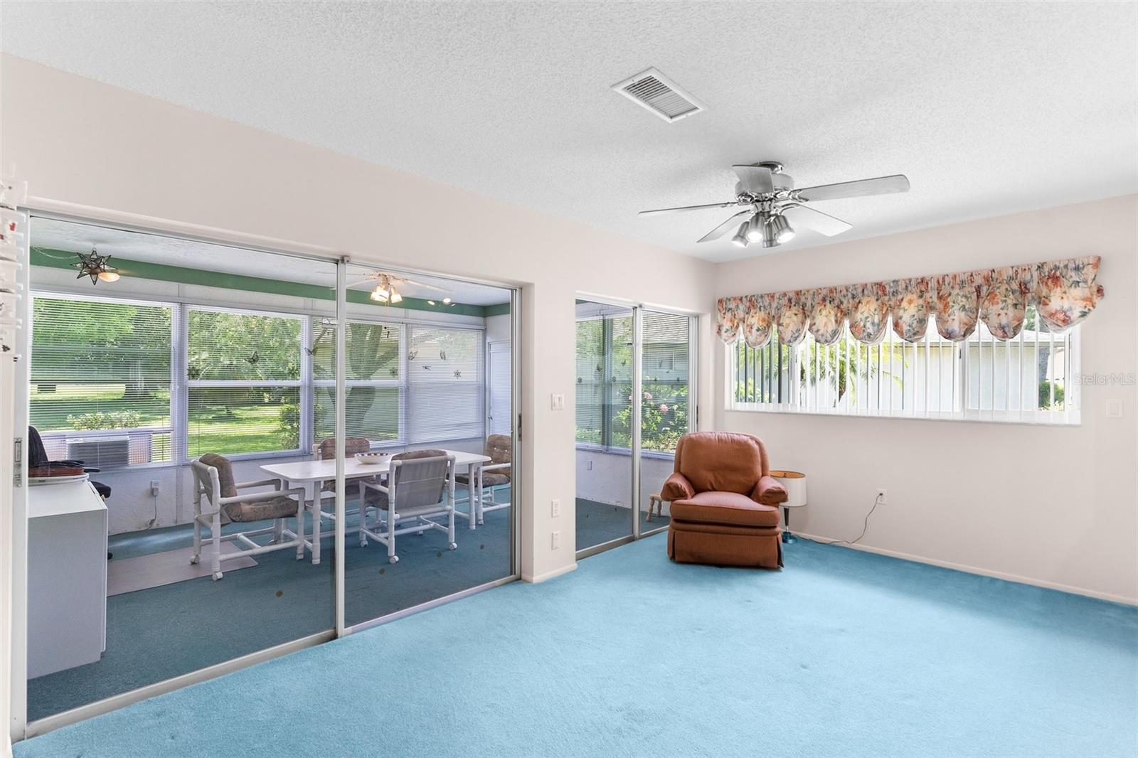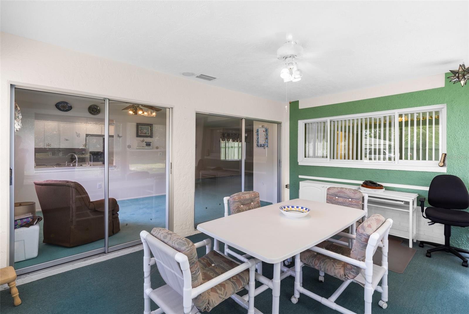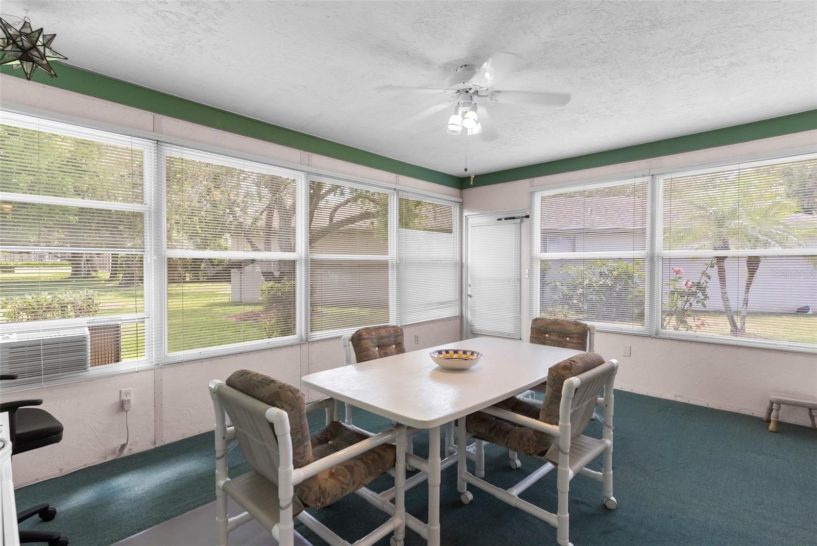NEW PRICE IMPROVEMENT! Spacious with lots of potential this two bedroom, two bathroom home located in a peaceful neighborhood. This property offers a flexible layout with a living room, dining room, den, bonus room, and a cozy kitchen. Upon entering, you're welcomed into a bright living room, the adjacent dining room provides a space for formal meals or casual gatherings. The den offers a cozy retreat, and the bonus room provides additional space for a playroom, hobby area, or home office. Step outside onto the large porch, enclosed with glass windows and equipped with its own AC unit, offering a serene space to relax or entertain. Additionally, the property includes a spacious yard with the bonus storage shed that's equipped with electricity and AC, making it perfect for a workshop, studio, or extra storage. There is a water softener and water filtration system, newer windows and irrigation. The roof was done in 2023. The community offers a clubhouse, pool and golf. The home is conveniently located near hospitals, schools and shopping