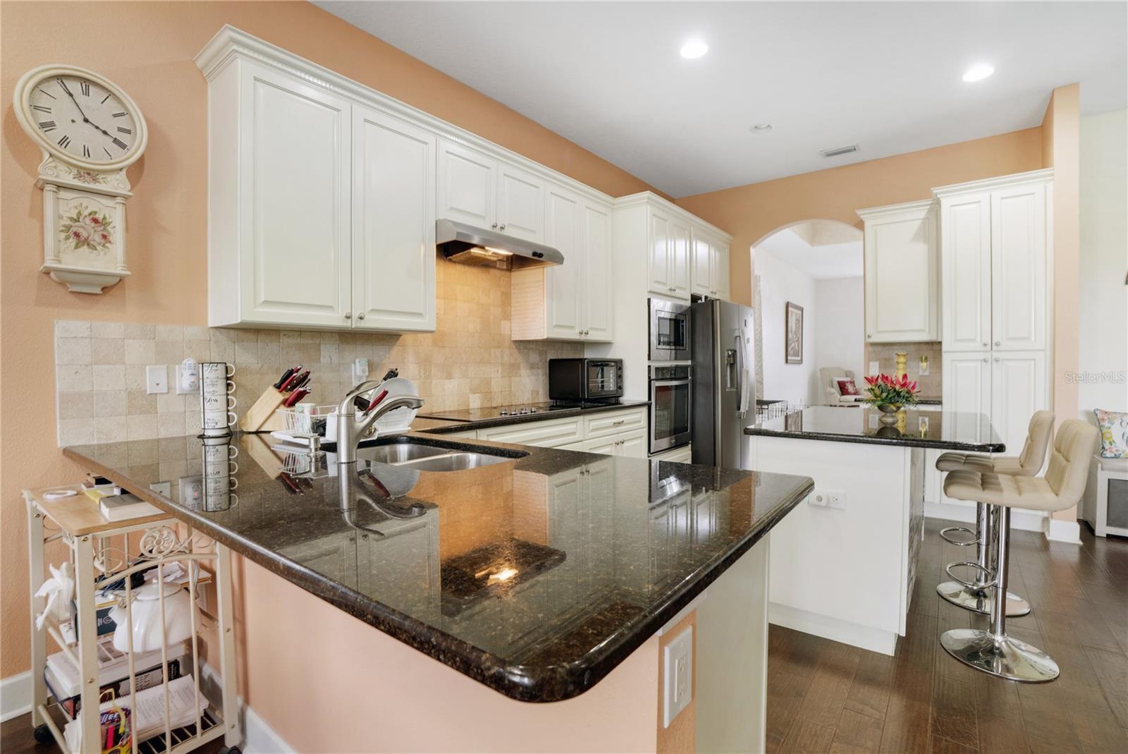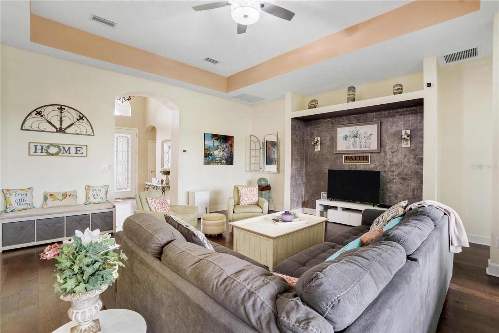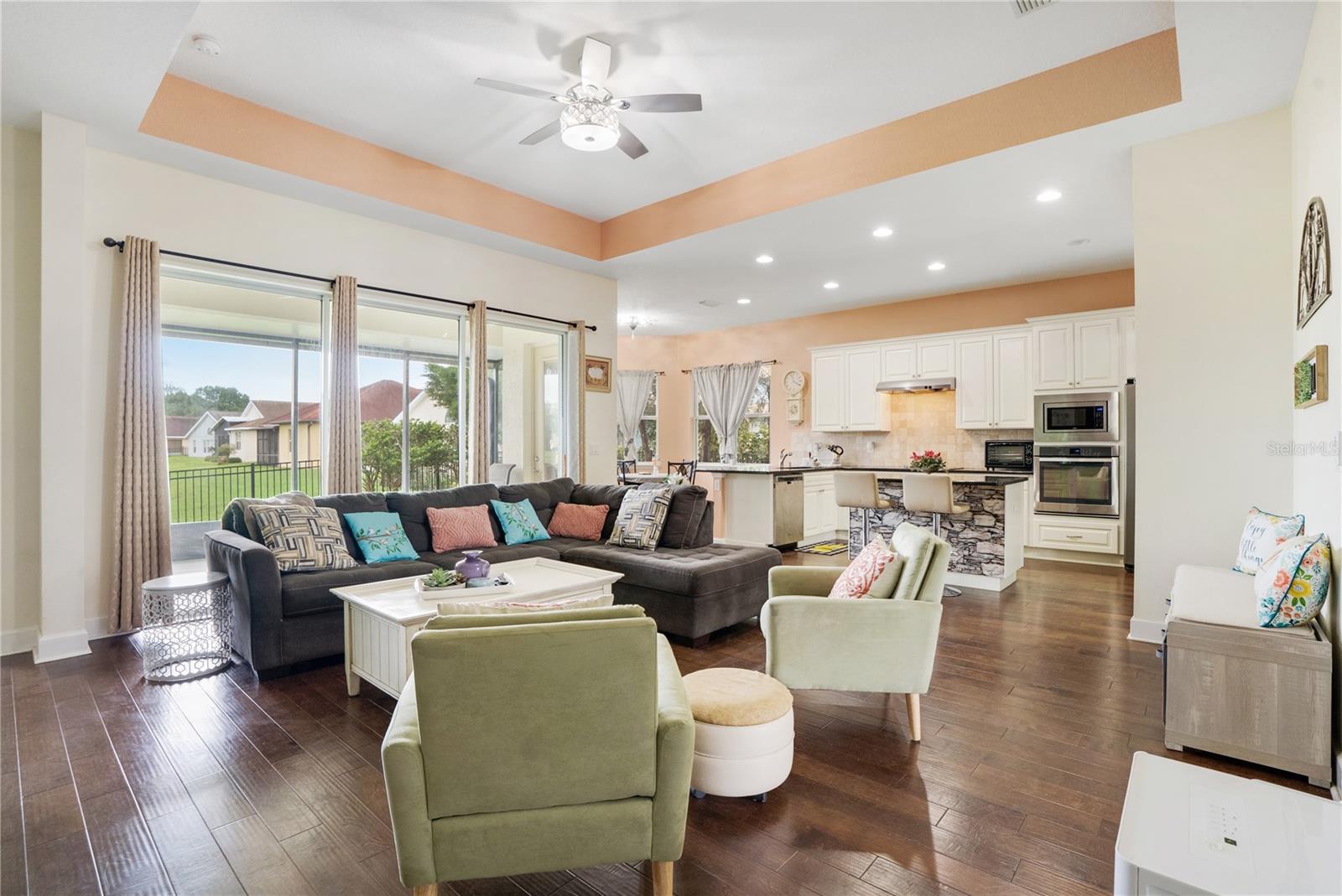 Come see this gorgeous house in the exclusive Reserve at Meadow Oaks community in Hudson!! This amazing, 3-bed, 2-bath, 2 car garage home with 2144 sqft of living space home was built in 2015. With no rear neighbors and golf course views this is a must see. Entering through the 8 foot double doors into a welcoming foyer, you notice the 10' ceilings , Grecian columns and large archways. To the right is a HUGE 14'X24" living room with marble tile. Use it for a formal living room, a pool and game room or as an office. To the left is the laundry room with garage entrance, the 2nd and 3rd bedroom and the second bathroom. Continuing forward through the arched entrance is the open kitchen and firmly room. You will notice the built in plant shelves, the soaring ceilings, wood floors and decorator touches to the TV wall and the sliders to the screened and covered lanai and golf course. The open kitchen has a granite covered island, 42 inch cabinets and stainless steel appliances. There is a breakfast nook with bay windows looking out to the backyard and golf course. The primary suite is HUGE at 12X17 feet with double walk in closets and an ensuite bath with dual vanities, a soaking tub and separate shower and a private water closet. The main bedroom also has sliders to the covered lanai. The community includes a clubhouse, pool, tennis courts, gym, and access to the public golf course. Come and enjoy all this community has to offer. Short distance to the beaches and Veteran's Expressway. Although I have an amazing photographer the home is better than the pics! Schedule a showing today! LOW HOA and NO CDD! This hoe is ready for you.