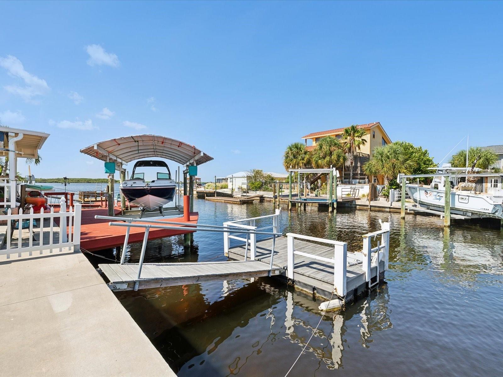 CALLING ALL BOATERS! DIRECT ACCESS TO THE GULF OF MEXICO! IT'S PARTY TIME ON YOUR EXPANSIVE, COMPOSITE DECK WITH AWE-INSPIRING WATERFRONT VIEWS! YOUR VERY OWN PRIVATE DOCK WITH A LIFT FOR YOUR BOAT. NO NEED FOR TRAILER, LOWER YOUR BOAT INTO THE WATER AND SAIL AWAY. MOST IMPRESSIVE AND UNIQUE IS THE ROOFTOP DECK WHERE YOU WILL ENJOY SUNSETS AND SUNRISES. COVERED OUTSIDE LANAI FOR RELAXATION AND ENTERTAINMENT. TRULY A FLORIDA OASIS OF FUN AND SUN! THE INTERIOR OF THIS 3 BEDROOM, 2 BATH HOME HAS BEEN TASTEFULLY RENOVATED. THE OPEN CONCEPT ALLOWS FOR A SEAMLESS FLOW. THE LIVING ROOM PROVIDES A COZY AND INVITING SPACE OPEN TO A BEAUTIFUL KITCHEN WITH MODERN APPLIANCES, WOOD CABINTREY, GRANITE COUNTERTOPS AND A BREAKFAST BAR. THE ADJACENT DINING AREA IS PERFECT FOR FAMILY GATERINGS. THE PRIMARY BDROOM IS VERY SPACIOUS WITH GENEROUS CLOSET SPACE AND THE ENSUITE IS GRAND! ENORMOUS WALK IN SHOWER, BUILT IN VANITY AND ALL TILED FOR EASY MAINTENANCE. THE SPLIT BEDROOM PLAN HAS 2 ADDITIONAL BEDROOMS, PERFECT FOR GUESTS OR SETTING UP A HOME OFFICE. AND THERE IS AN ENCLOSED FLORIDA ROOM OVERLOOKING THE PICTURESQUE WATERFRONT. THE GARAGE FLOOR HAS AN EPOXY FLOOR FOR CLEANLINESS. THE WASHER/DRYER IS NEW AND DOES THE JOB OF BOTH WASHER AND DRYER. IF YOU ARE LOOKING FOR AN INCOME INVESTMENT THIS BEAUTIFUL WATERFRONT PROPERTY WOULD ALSO MAKE A PERFECT AIR B&B! CLOSE TO HUDSON BEACH, SHOPPING AND RESTAURANTS. THIS HOME HAS IT ALL! SCHEDULE YOUR PERSONAL SHOWING TODAY!