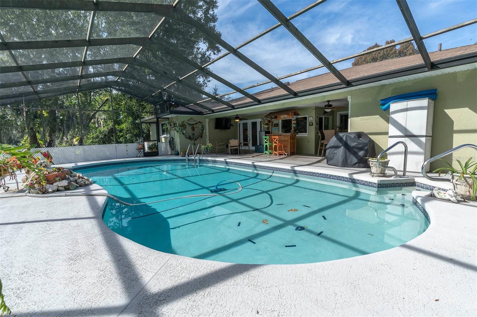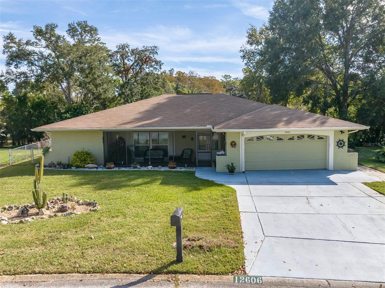 Welcome to this beautifully updated 4-bedroom, 3-bathroom pool home in the highly sought-after Beacon Woods community featuring $50,000 in recent improvements. A new A/C system, a leaf filter system installed on the entire house for hassle-free gutter maintenance, new fascia and soffits for a polished exterior, upgraded irrigation system with new valves and fittings for effortless lawn care, a new garbage disposal, a new sewer line hook-up for reliable plumbing, new outdoor motion lights for enhanced security and curb appeal, and new sheetrock on the garage ceiling for a clean, finished look. As you approach, a charming screened-in front porch with tile flooring invites you to relax and enjoy your morning coffee. Entering through the double etched glass front doors, you’ll find a spacious living room adorned with crown molding, setting a sophisticated tone for the home. Just off the living room, the dining area features hurricane-rated sliders that open to the lanai and pool area, creating a seamless indoor-outdoor flow. The home features durable tile and laminate flooring throughout, with cozy carpet in two of the bedrooms, providing both style and comfort. The updated kitchen is a chef’s dream, featuring light cabinetry, granite countertops, stainless steel appliances, and a large window that fills the space with natural light. Adjacent to the kitchen, a cozy eating area includes a generous pantry. The family room, located next to the kitchen, features hurricane-rated double doors leading out to the lanai and pool area, providing additional access and security. The home also includes hurricane-rated windows throughout. The primary suite is a true retreat, offering a spacious layout, walk-in closet, and an elegantly updated ensuite bathroom with a modern vanity, bowl sink, and walk-in shower. Down the hall, the second bedroom is perfectly positioned with a nearby updated bathroom featuring a walk-in shower. The home’s split floor plan offers added privacy with two additional bedrooms, which share a third bathroom equipped with a tub. Step outside to discover your private backyard oasis, where a heated pool with a waterfall feature awaits. The expansive lanai is the ideal spot to unwind, complete with an outdoor shower for added convenience. The home has been upgraded with newly installed fascia and a leaf filter gutter protection system for ease of maintenance. The sprinkler system has been updated with new valves and PVC fittings. Beyond your home, Beacon Woods offers a fantastic array of amenities, including an 18-hole golf course, community pool, tennis, handball, and shuffleboard courts, a children’s playground, and a clubhouse hosting a variety of activities. Enjoy scenic sunsets just minutes away at Hudson Beach. With shopping, dining, entertainment, and medical facilities nearby, plus a low HOA, no CDD fees, and not being in a flood zone, this updated Beacon Woods gem is ready to welcome you home! Home has been remediated and fully insurable.