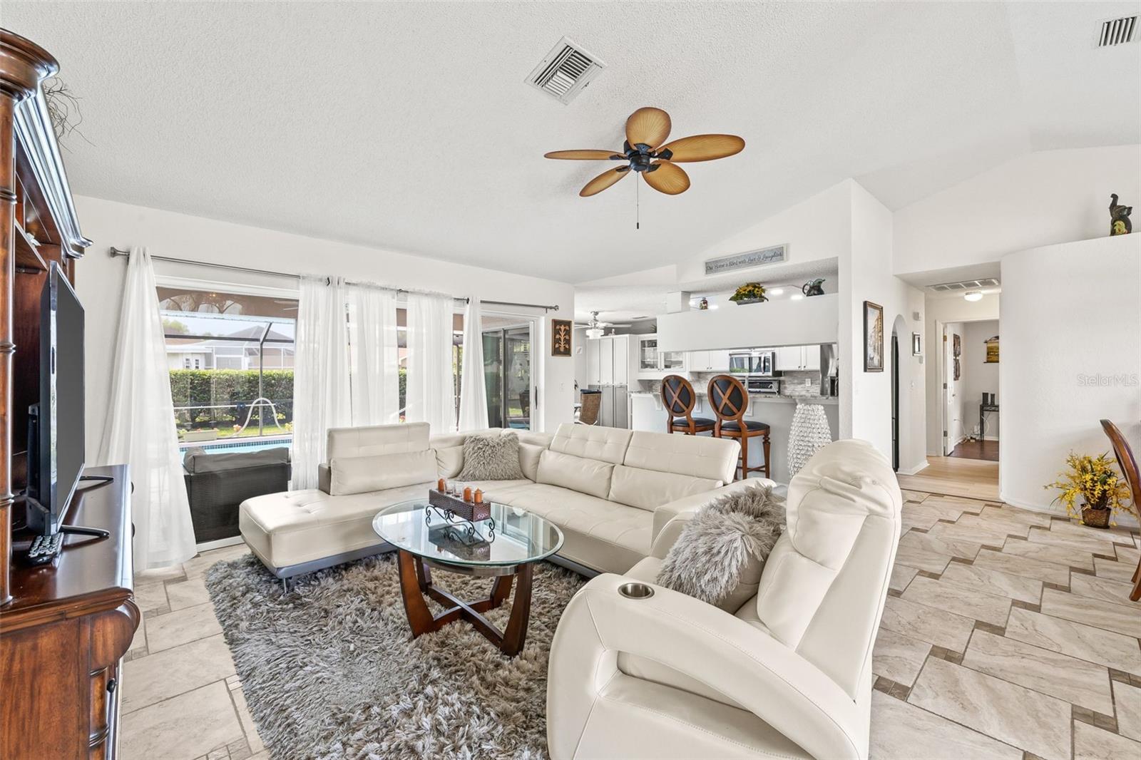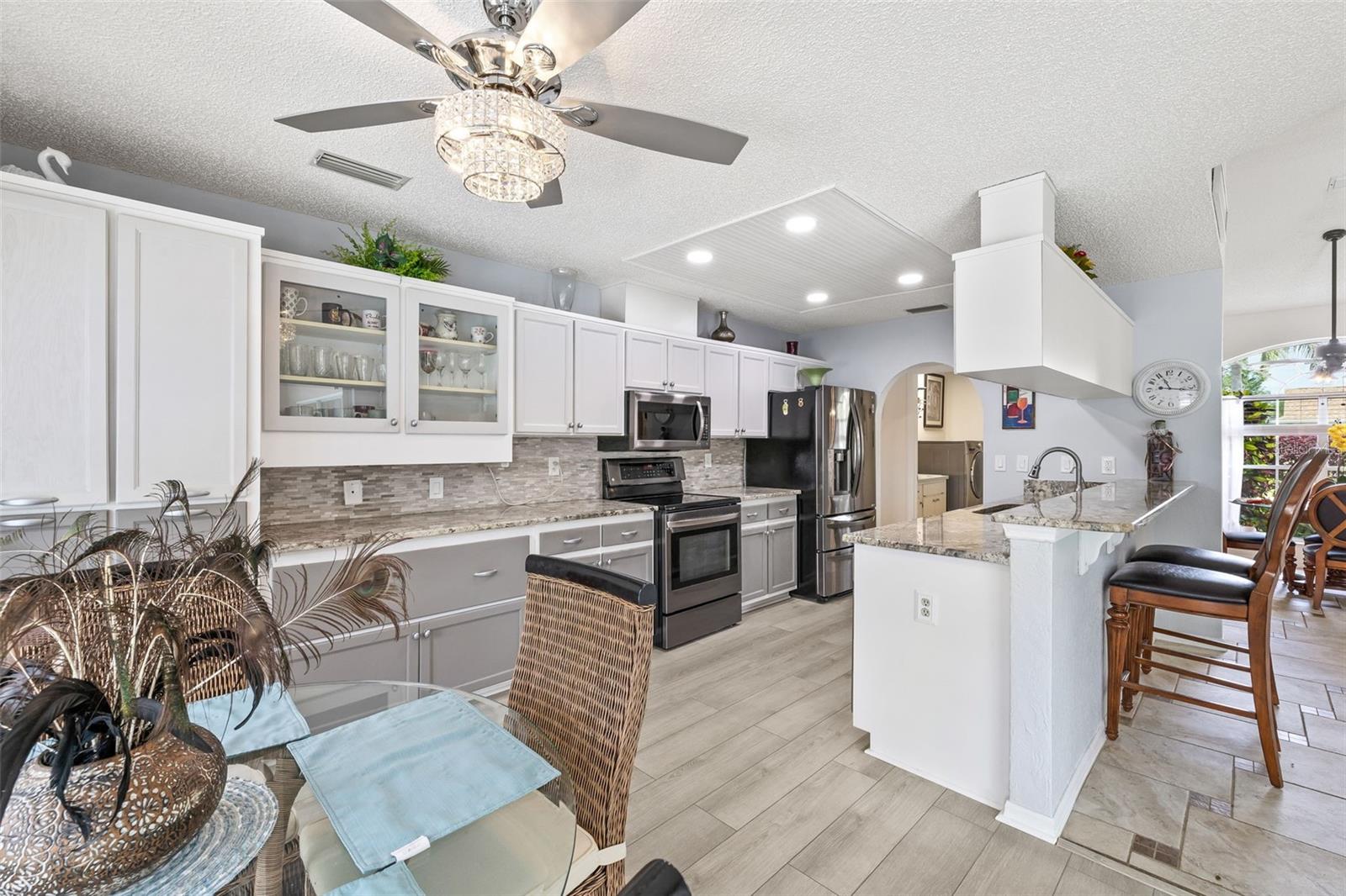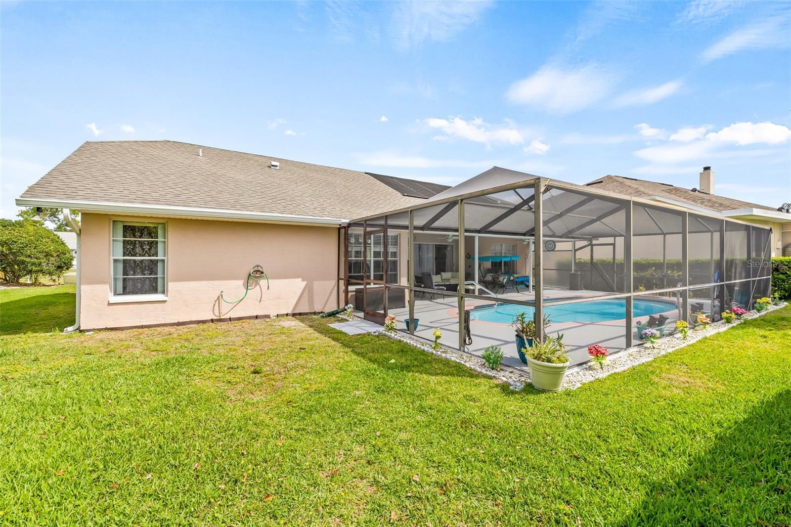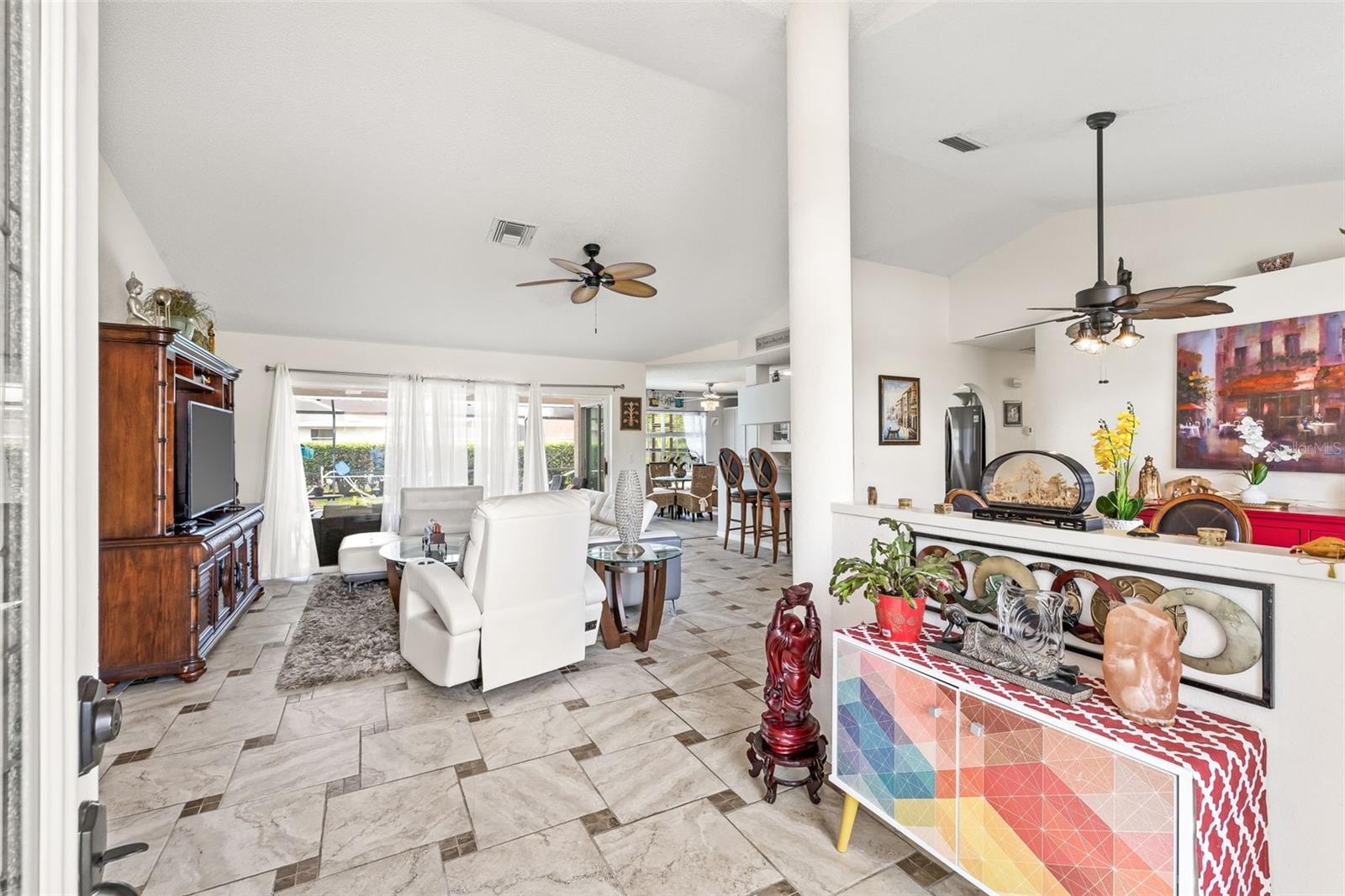 Must see this gorgeous and well maintained home.Split plan design for privacy. 3 bedroom ,2 bath, 2 car garage plus pool. Move in Ready. Exterior has been freshly painted. New French double entry doors replaced 2024. As you enter the home you will be greeted into the Great room that has vast space to entertain and Dinning room for a formal dining that views in to the Pool and patio. Enjoy swimming in the six feet deep solar panel heated pool that has been totally re-screened and freshly painted deck for year-round enjoyment. Kitchen was updated with premium vinyl flooring and offers granite countertops, updated cabinets, stainless steel appliances, breakfast bar, and breakfast nook. Laundry room holds a counter space with utility sink, a pair of matching LG washer and dryer that convey, Laundry room and hallways were updated with premium vinyl flooring. All ceiling fans have been replaced through out the home. Master bedroom opens to a view of the pool from the back window. Master bathroom includes a garden tub, walk- in shower, stall with ledge seating, dual sinks, granite countertops, and walk-in closet. The two other guest rooms have been updated with premium vinyl flooring. Guest bathroom has new vanity set, Garage floor was freshly painted with plenty of space for workshop and tools. New outdoor security lights. Landscaping is well maintained. Backyard offers privacy via perfectly trimmed bushes to 7 feet height. Well irrigation system, Water softener, HVAC replaced in 2019 with new ductwork. Quiet and Friendly neighborhood. Golf and Country Club is located across the main road. Clubhouse offers Pool, Tennis, golf course, playground, and much more. Located close to all Shopping, Restaurants, Schools, Hospitals, and Major Highways, Don't miss this opportunity. MOTIVATED SELLER.