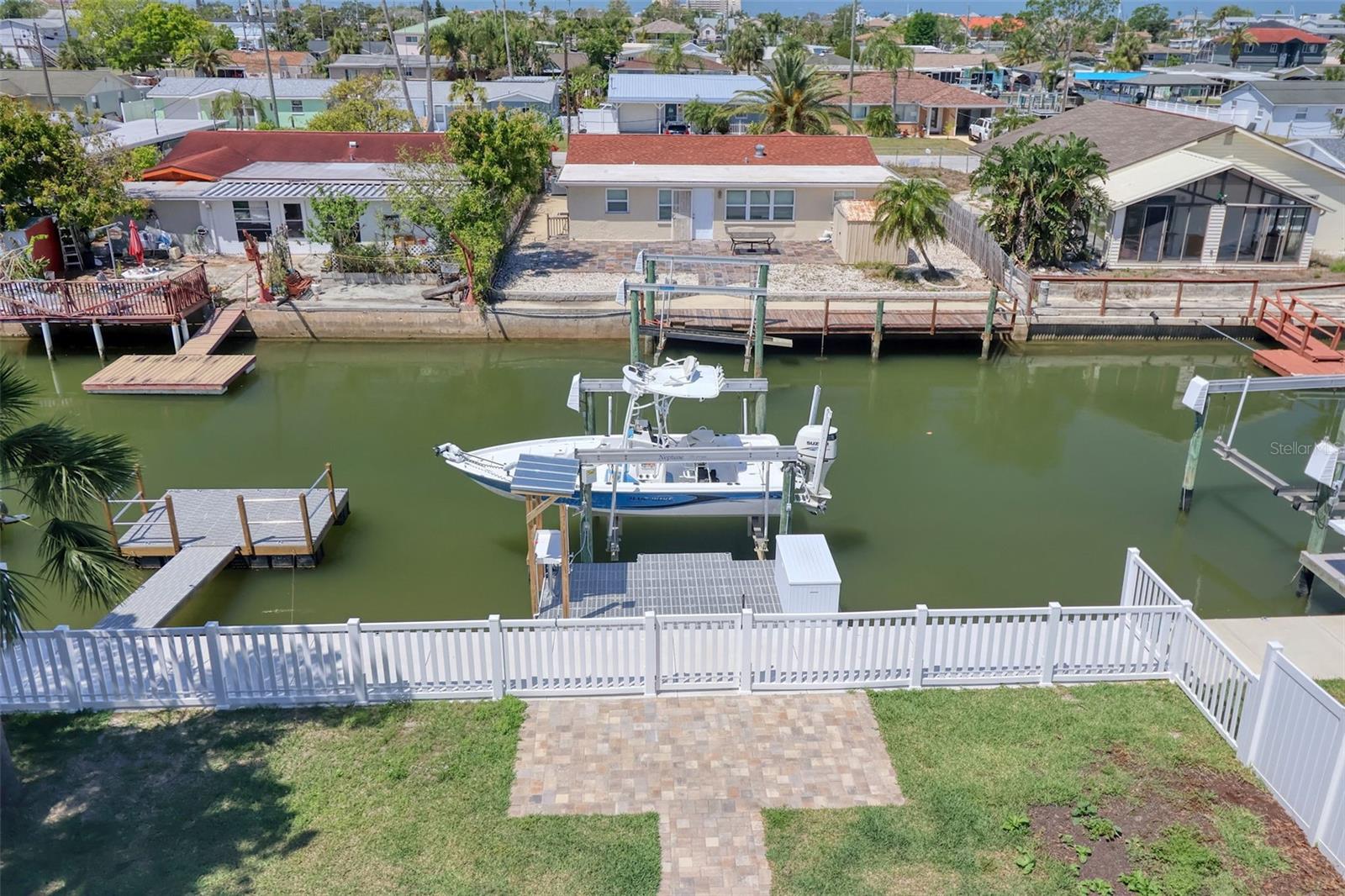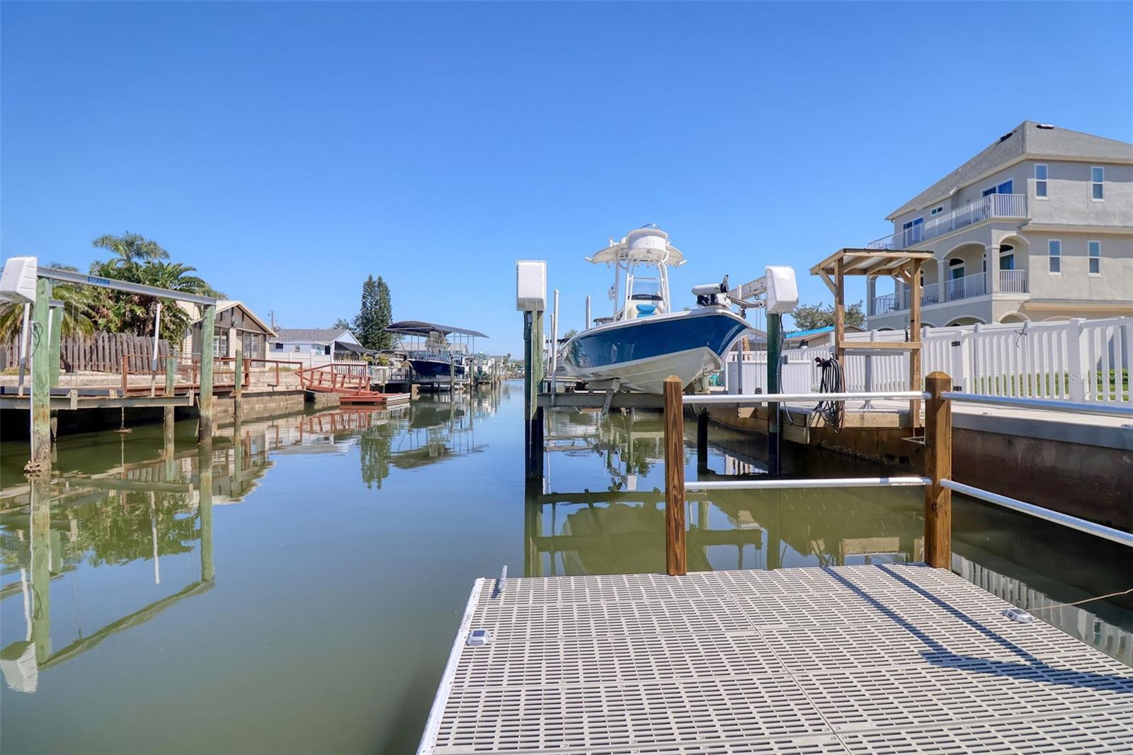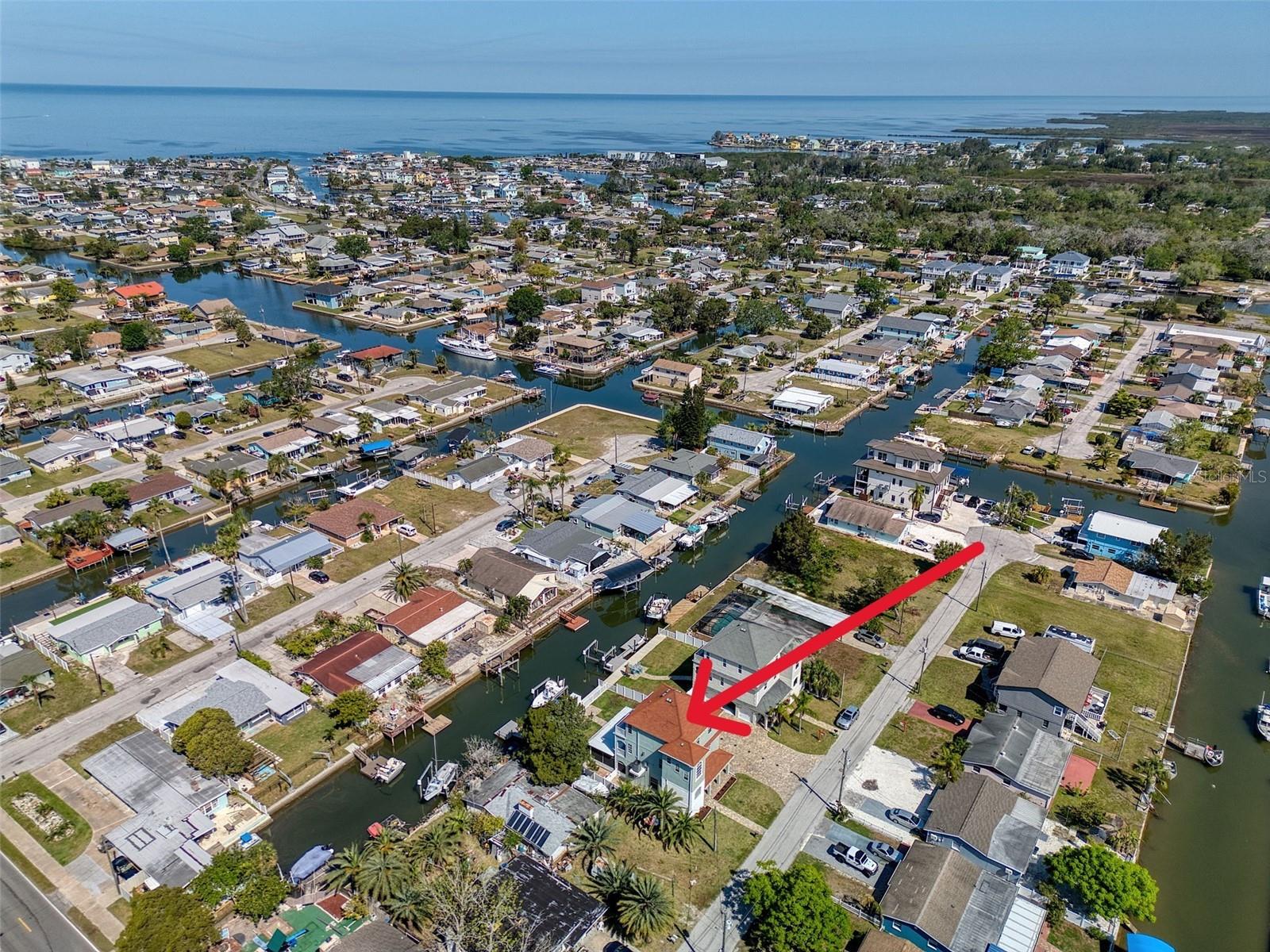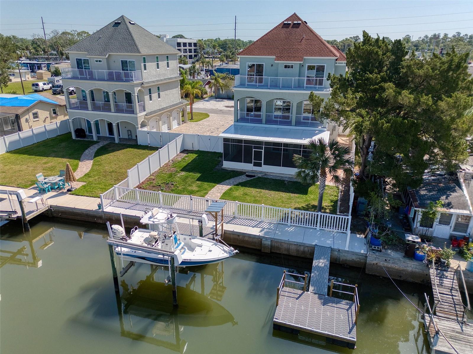 One or more photo(s) has been virtually staged. DIRECT GULF ACCESS with NO HOA and a BOATLIFT! This ELEVATED 3-bedroom, 3-bathroom home offers breathtaking sunsets from the two upper balconies and MOVE IN READY! Must have features including a 10,000 lb boat lift with GEM remote (NEW motors 2025). Fish cleaning station with water and electric. A floating dock with flow thru decking for easy cleaning and easy access kayaking, paddleboarding or your jet ski. Off the 3 car garage you will find a large screened in lanai with shades which is the perfect outdoor entertaining space all year round or sit back and relax after a long day with your favorite beverage. There is also a storage room for all your fishing gear and a 1/2 bath. Upstairs is a spacious, open concept layout with high ceilings, crown molding, large baseboards, waterproof luxury vinyl flooring and a dream kitchen with a large island for entertaining. Double STAINLESS-STEEL oven & appliances, GRANITE countertops and a breakfast bar. 7-NEW impact sliders (2023) and a 1/2 bath complete the 2nd floor main living space. On the 3rd floor you will find your primary bedroom with ensuite, a balcony for sunset views and a walk-in closet with built in shelves and storage. The 2nd bedroom has a walk-in closet and access to the balcony as well. The back yard is completely fenced in for privacy with plenty of space for your fur babies to run. Other notable upgrades include an underground propane line for the fireplace and tankless water heater. Whole house tenting with warranty was done in 2025 as well as NEW interior paint and NEW exterior paint in 2024. NEW 19 SEAR AC UNIT in 2022. Bring the boat and your fishing poles and start living the salt life today! Hudson Beach is a golf cart friendly small coastal town located just north of Clearwater and Tampa with a small public beach, marinas and waterfront restaurants like Sam's Beach Bar, Ollies and Inn on the Gulf just a short ride away. Conveniently located off Hwy 19 with shopping & hospital nearby. And just 15 minutes to the expressway for easy access to downtown Tampa and major airports. Don't miss the opportunity to own this unique waterfront property! PS- the same home is available for sale next door! Ideal for multi-generational living, best friends, grandparents or make it a shared vacation retreat! Call me to schedule a showing today!