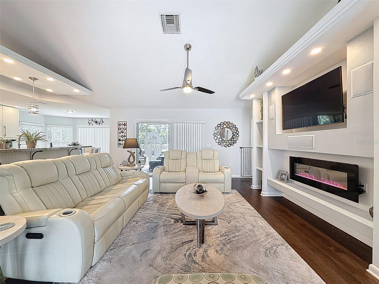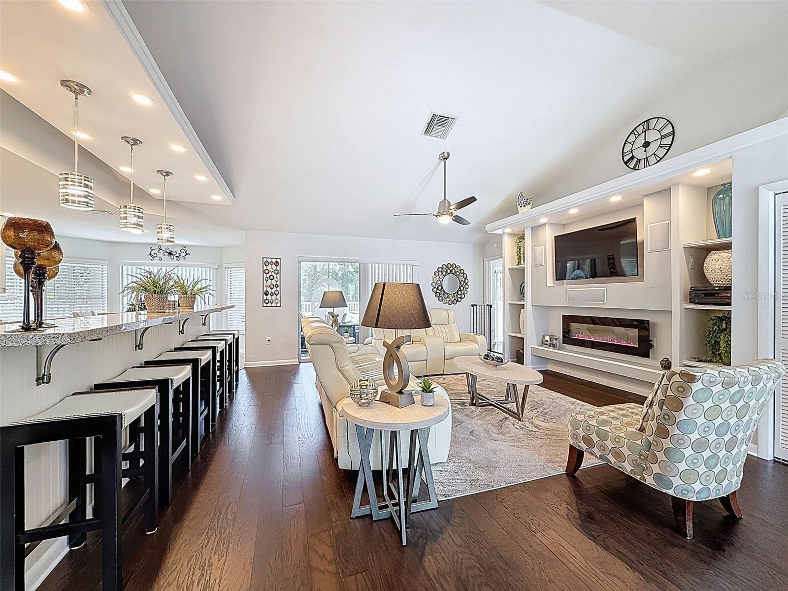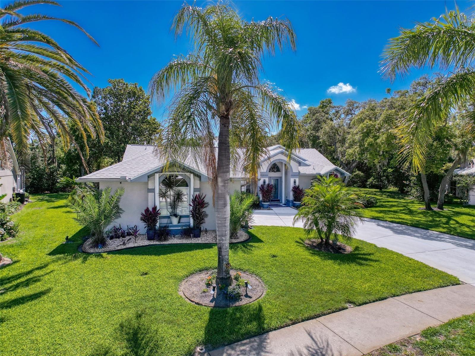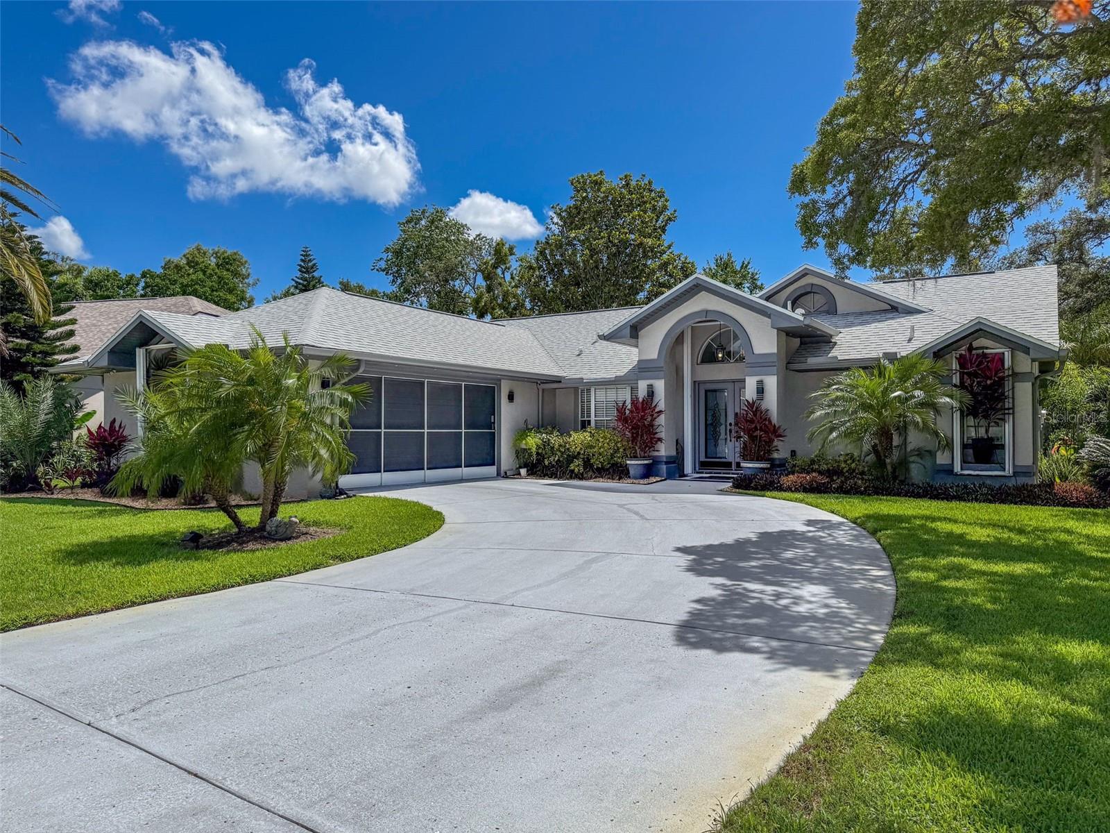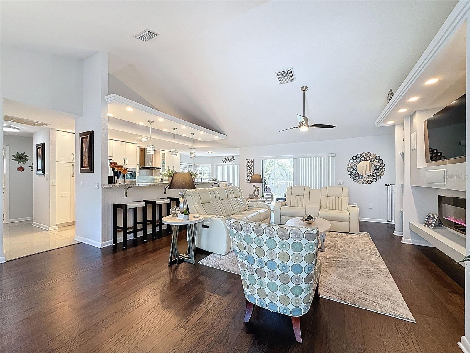 As you enter this lovely home you see Pride of Ownership. Freshly painted inside, this home has been upgraded from top to bottom. Open floor plan with a breakfast bar, eat-in kitchen with white designer shaker cabinets, soft close doors and drawers. Let's not forget the refrigerated wine cooler and separate wine rack, built in oven and microwave, induction cook top. Complete kitchen with granite countertops. Great Room has built-in shelves designed for your TV and flat glass electric fireplace. Both baths have granite or designer tile countertops and jetted tubs in both baths with tiled step in shower in the master ensuite. Home was designed on a split plan, Primary on one side of the house and 2 bedrooms on the opposite side. Engineered hardwood floors in main living areas and lighter porcelain tiled floors in kitchen and baths. All the rear rooms view the screened lanai, 2 side patios and the oversized private, peaceful, fenced backyard. All doors and windows have hurricane shutters. Low HOA dues provide a beautiful clubhouse, fitness center, pool and ping pong tables, pool, pickleball, basketball, tennis courts, bocci and shuffleboard. Located 45 minutes from Tampa International Airport, 2 miles to the Gulf of America. Pack your fishing rod and kayaks, don't forget the golf clubs to play on the abundant number of public courses nearby.