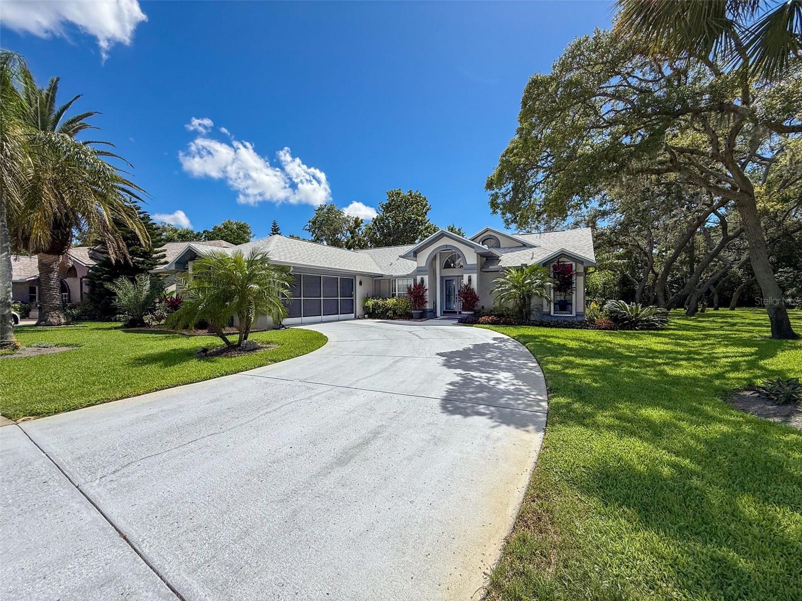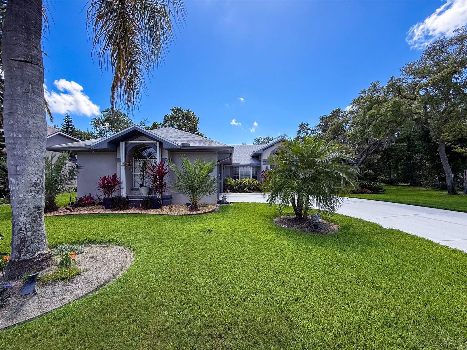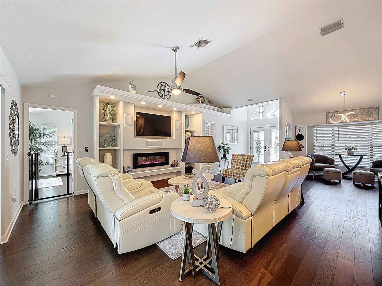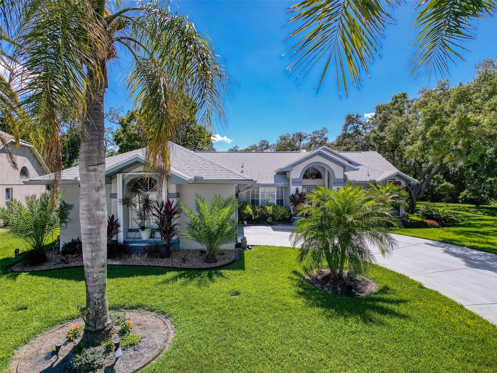 As you enter this lovely home you see Pride of Ownership. Freshly painted inside, this home has been upgraded from top to bottom. Open floor plan with a breakfast bar, eat-in kitchen with white designer shaker cabinets, soft close doors and drawers. Let's not forget the refrigerated wine cooler and separate wine rack, built in oven and microwave, induction cook top. Complete kitchen with granite countertops. Great Room has built-in shelves designed for your TV and flat glass electric fireplace. Both baths have granite or designer tile countertops and jetted tubs in both baths with tiled step in shower in the master ensuite. Home was designed on a split plan, Primary on one side of the house and 2 bedrooms on the opposite side. Engineered hardwood floors in main living areas and lighter porcelain tiled floors in kitchen and baths. All the rear rooms view the screened lanai, 2 side patios and the oversized private, peaceful, fenced backyard. All doors and windows have hurricane shutters. Low HOA dues provide a beautiful clubhouse, fitness center, pool and ping pong tables, pool, pickleball, basketball, tennis courts, bocci and shuffleboard. Located 45 minutes from Tampa International Airport, 2 miles to the Gulf of America. Pack your fishing rod and kayaks, don't forget the golf clubs to play on the abundant number of public courses nearby.