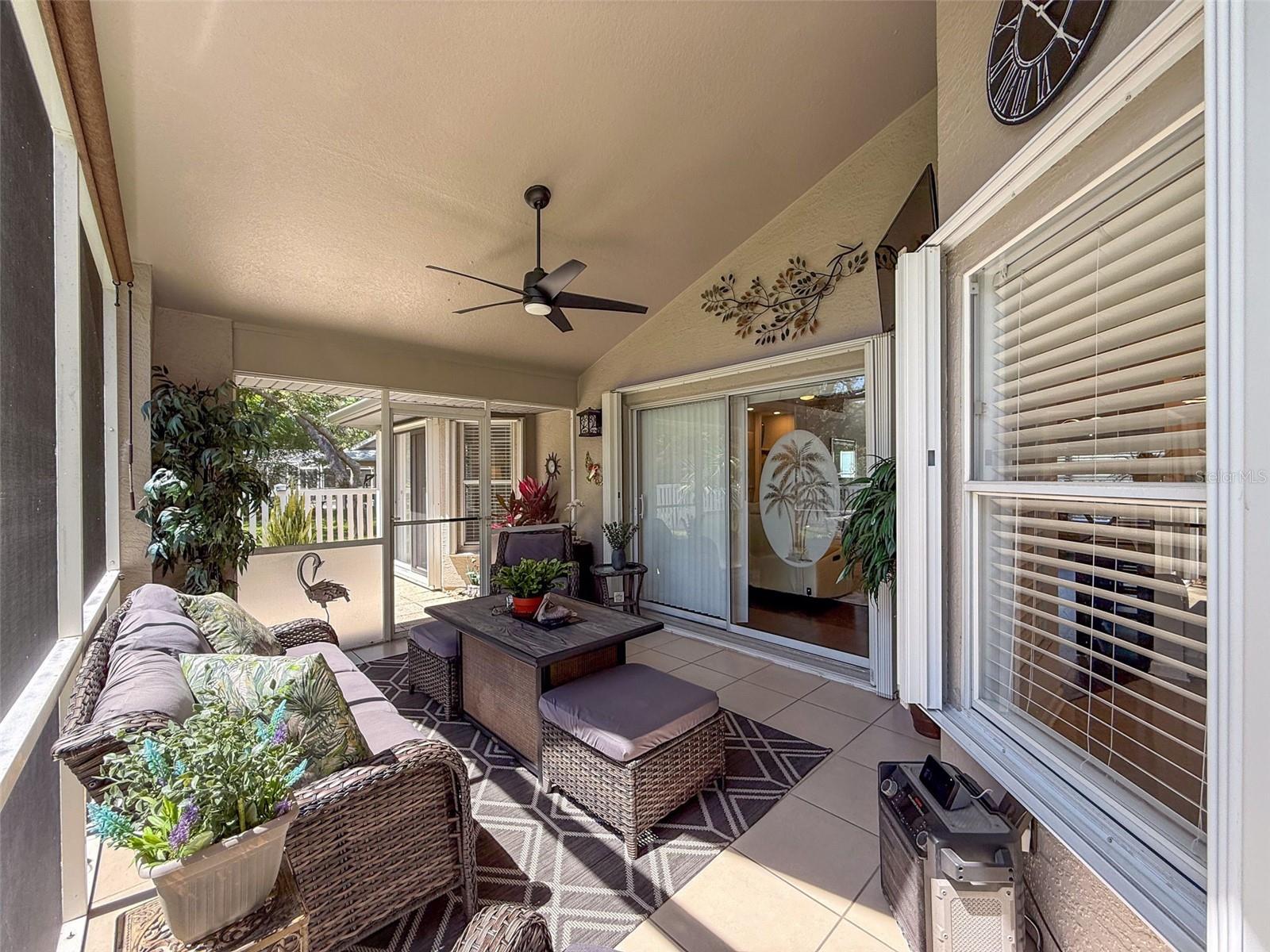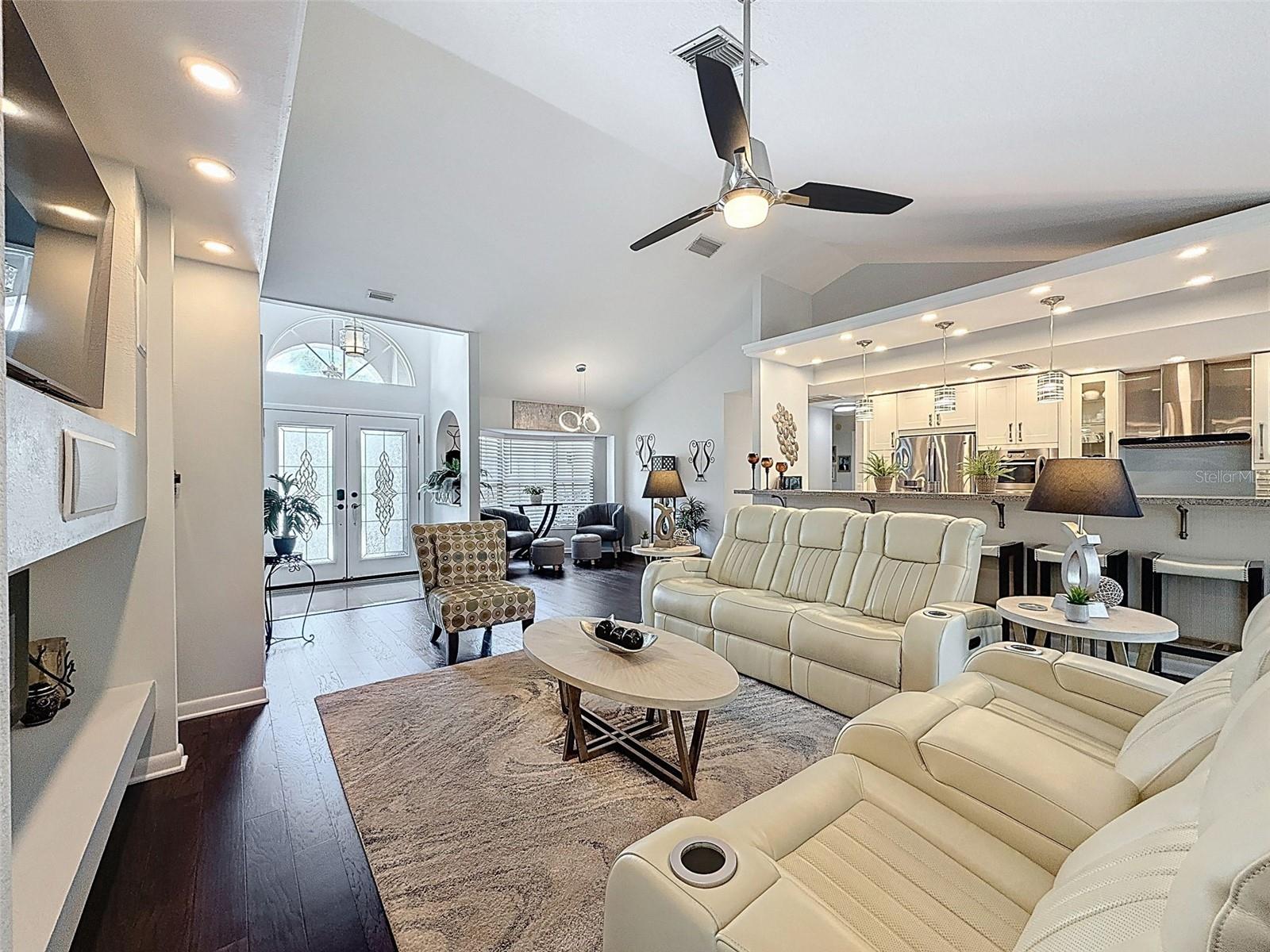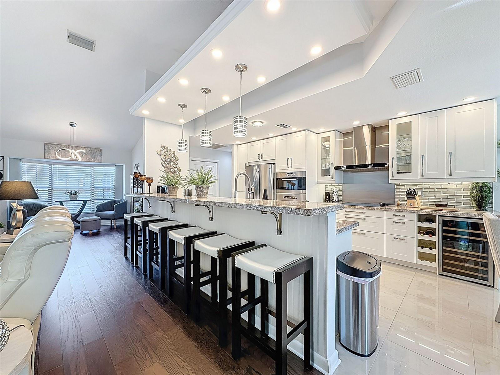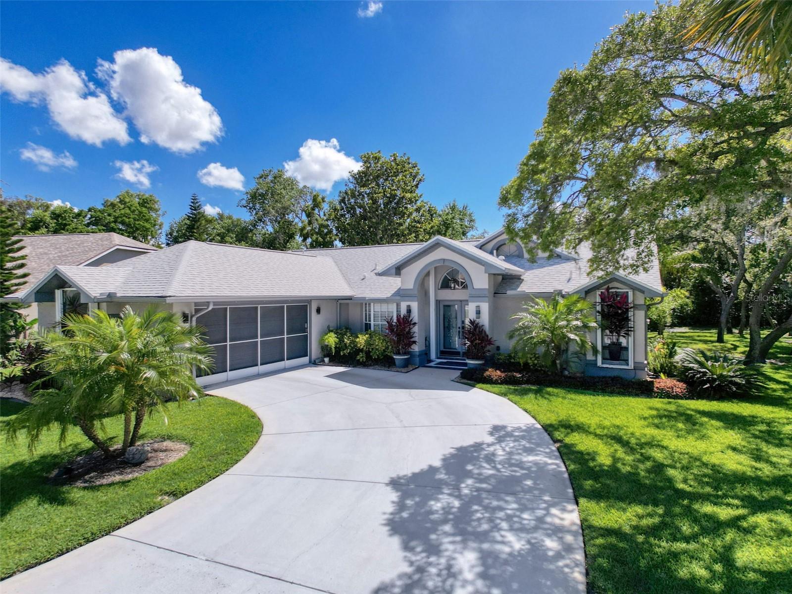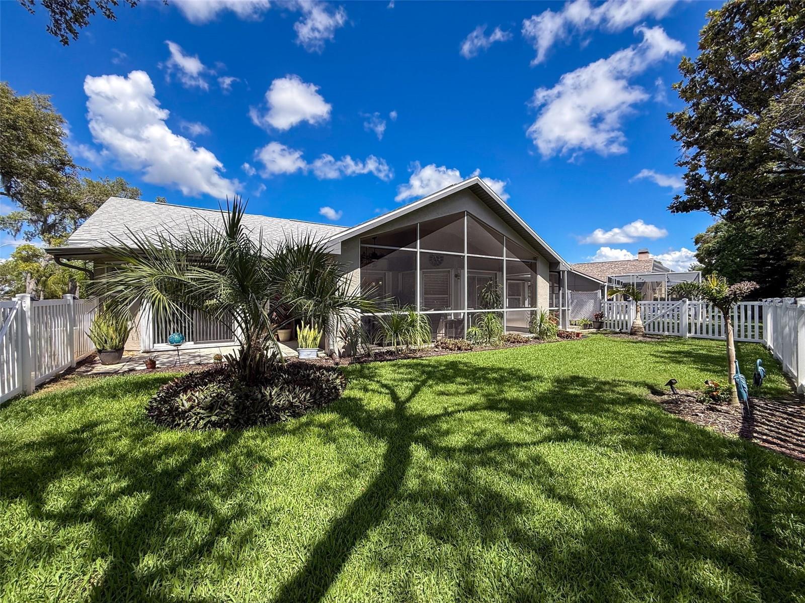 As you enter this lovely home you see Pride of Ownership. Freshly painted inside, this home has been upgraded from top to bottom. Open floor plan with a breakfast bar, eat-in kitchen with white designer shaker cabinets, soft close doors and drawers. Let's not forget the refrigerated wine cooler and separate wine rack, built in oven and microwave, induction cook top. Complete kitchen with granite countertops. Great Room has built-in shelves designed for your TV and flat glass electric fireplace. Both baths have granite or designer tile countertops and jetted tubs in both baths with tiled step in shower in the master ensuite. Home was designed on a split plan, Primary on one side of the house and 2 bedrooms on the opposite side. Engineered hardwood floors in main living areas and lighter porcelain tiled floors in kitchen and baths. All the rear rooms view the screened lanai, 2 side patios and the oversized private, peaceful, fenced backyard. All doors and windows have hurricane shutters. Low HOA dues provide a beautiful clubhouse, fitness center, pool and ping pong tables, pool, pickleball, basketball, tennis courts, bocci and shuffleboard. Located 45 minutes from Tampa International Airport, 2 miles to the Gulf of America. Pack your fishing rod and kayaks, don't forget the golf clubs to play on the abundant number of public courses nearby.