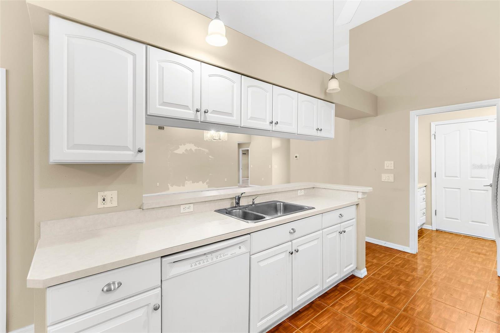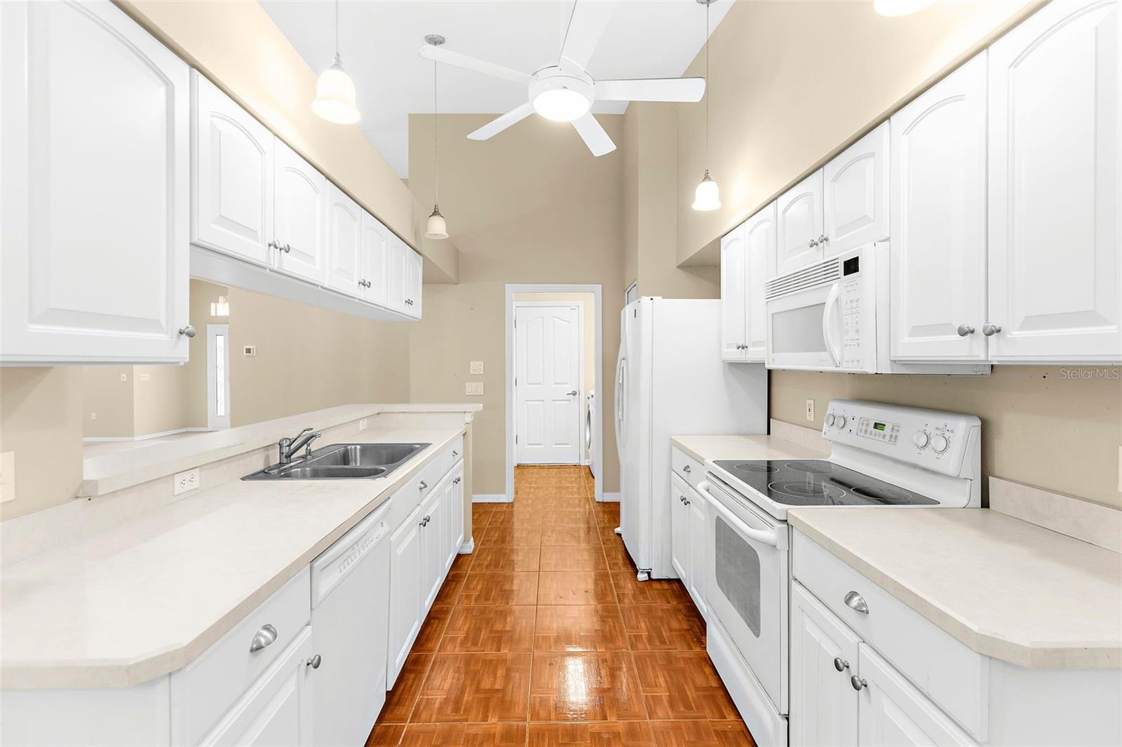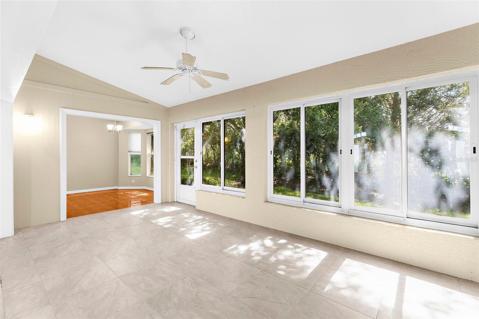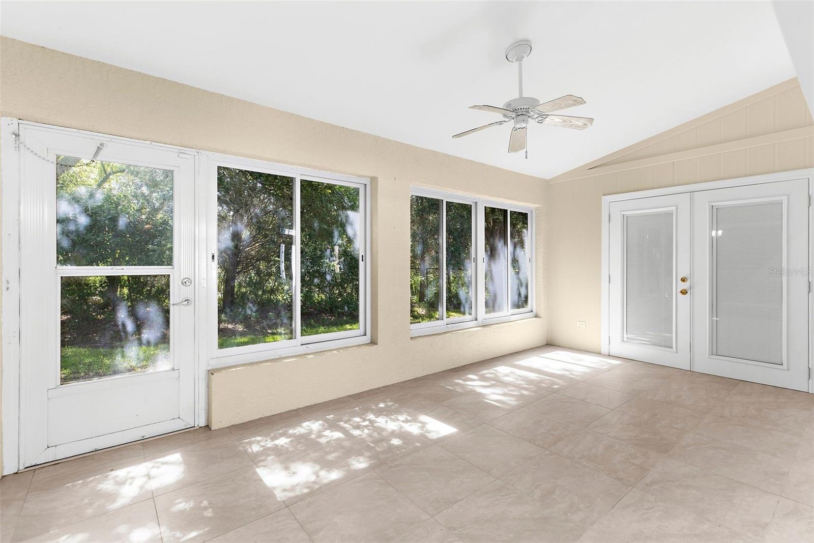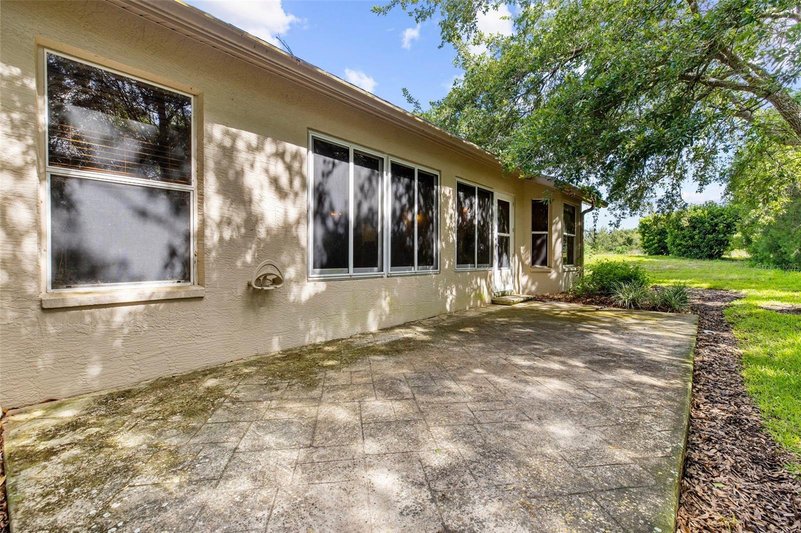 One or more photo(s) has been virtually staged. DESIRABLE END UNIT with extra long driveway, plenty of room for your guests to park in the active 55+ , gated private golf community of Heritage Pines. Looking for an active community !!! Low HOA fee covers cable, internet, exterior maintenance, lawn care, irrigation and exterior painting. ,fitness center, heated pool and spa, tennis, crafting, woodworking, pickleball and more. This 2 bedroom 2 bath end unit has a premier walk in shower in primary bath and a walk in tub in 2nd bath. AC installed in 2024.The sun room has been enclosed with new windows and opens up to living and dining area adding a larger open feel. No rear neighbors makes for lots of privacy on your back patio, Inside laundry off kitchen and garage with cabinets and counter space for folding.