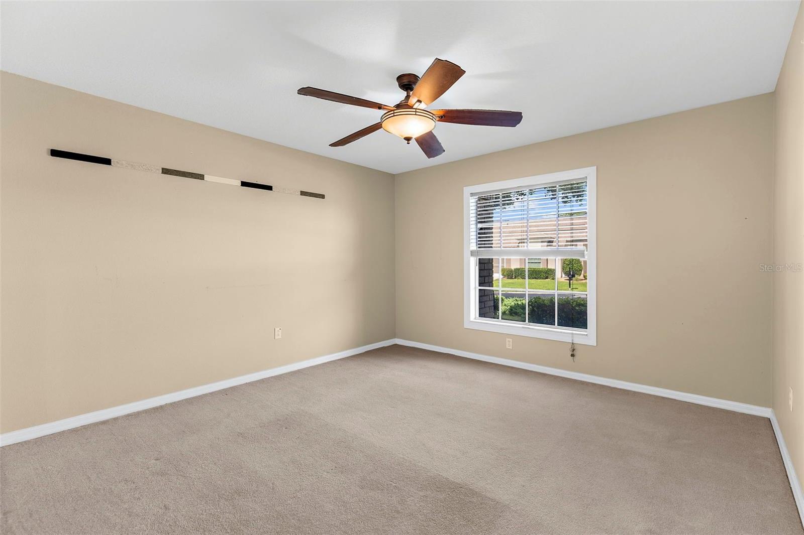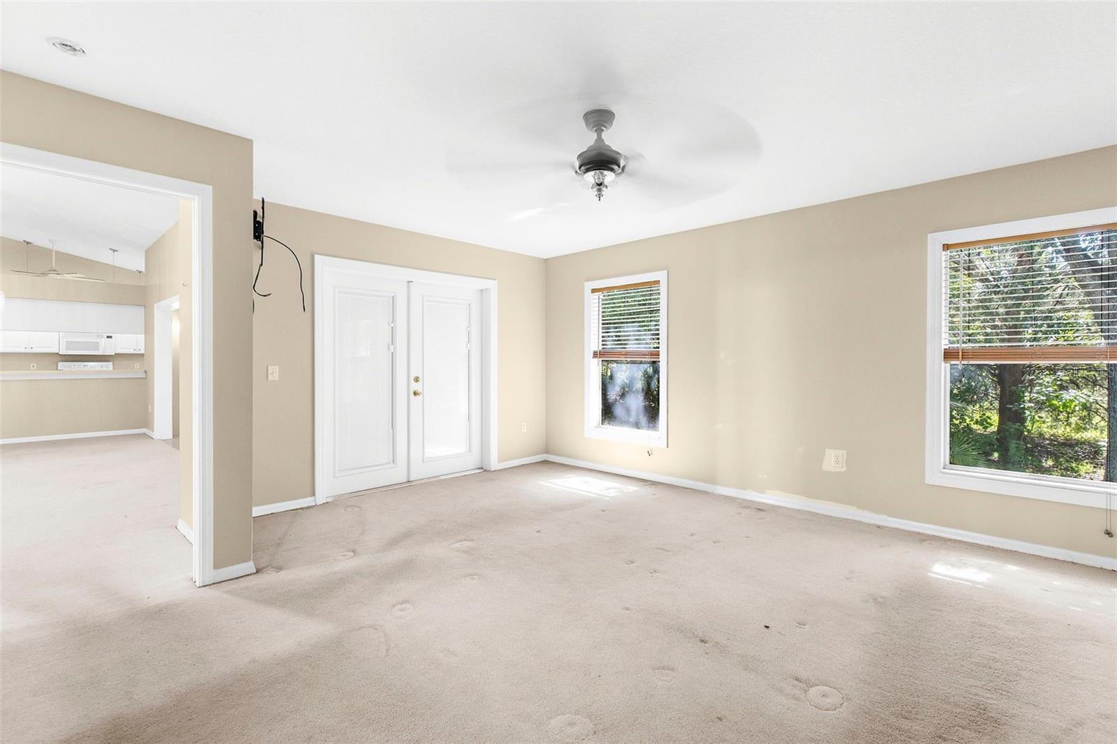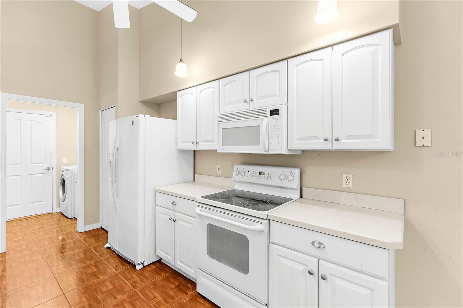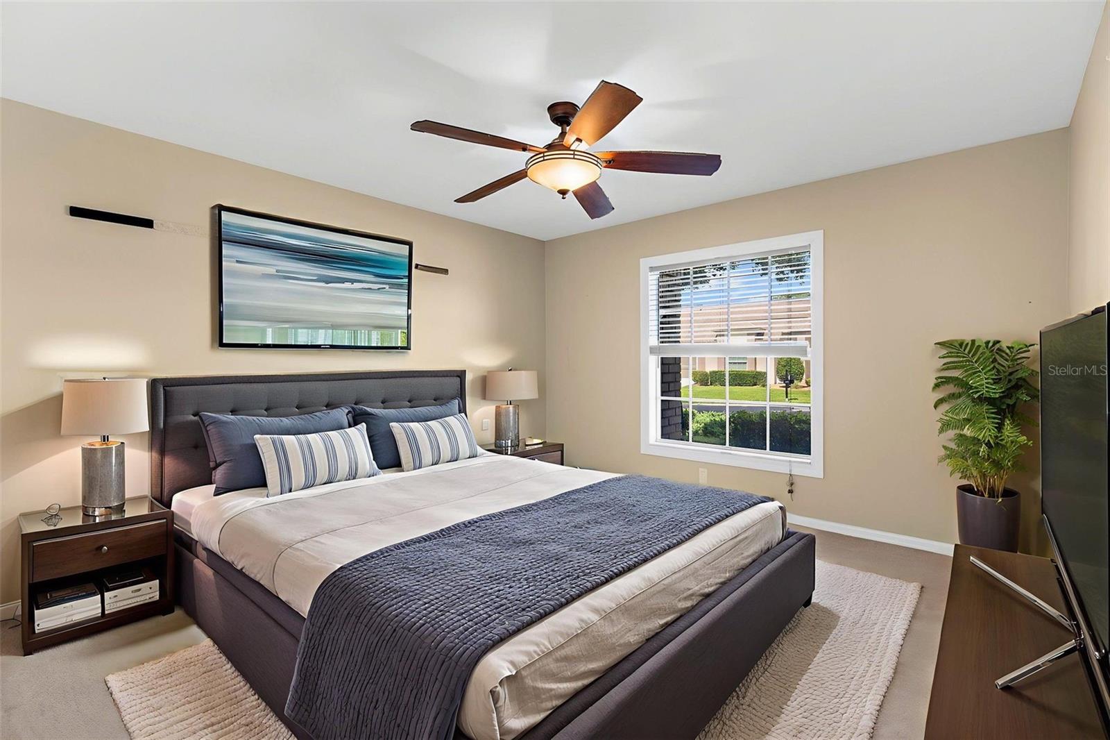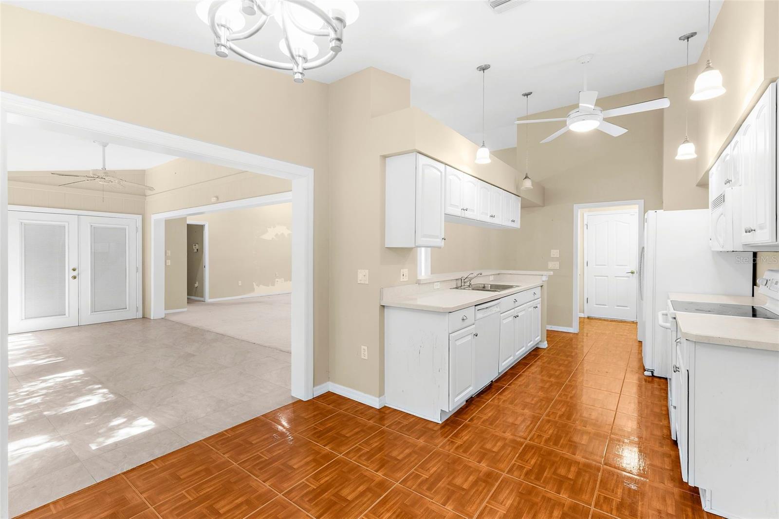 One or more photo(s) has been virtually staged. DESIRABLE END UNIT with extra long driveway, plenty of room for your guests to park in the active 55+ , gated private golf community of Heritage Pines. Looking for an active community !!! Low HOA fee covers cable, internet, exterior maintenance, lawn care, irrigation and exterior painting. ,fitness center, heated pool and spa, tennis, crafting, woodworking, pickleball and more. This 2 bedroom 2 bath end unit has a premier walk in shower in primary bath and a walk in tub in 2nd bath. AC installed in 2024.The sun room has been enclosed with new windows and opens up to living and dining area adding a larger open feel. No rear neighbors makes for lots of privacy on your back patio, Inside laundry off kitchen and garage with cabinets and counter space for folding.