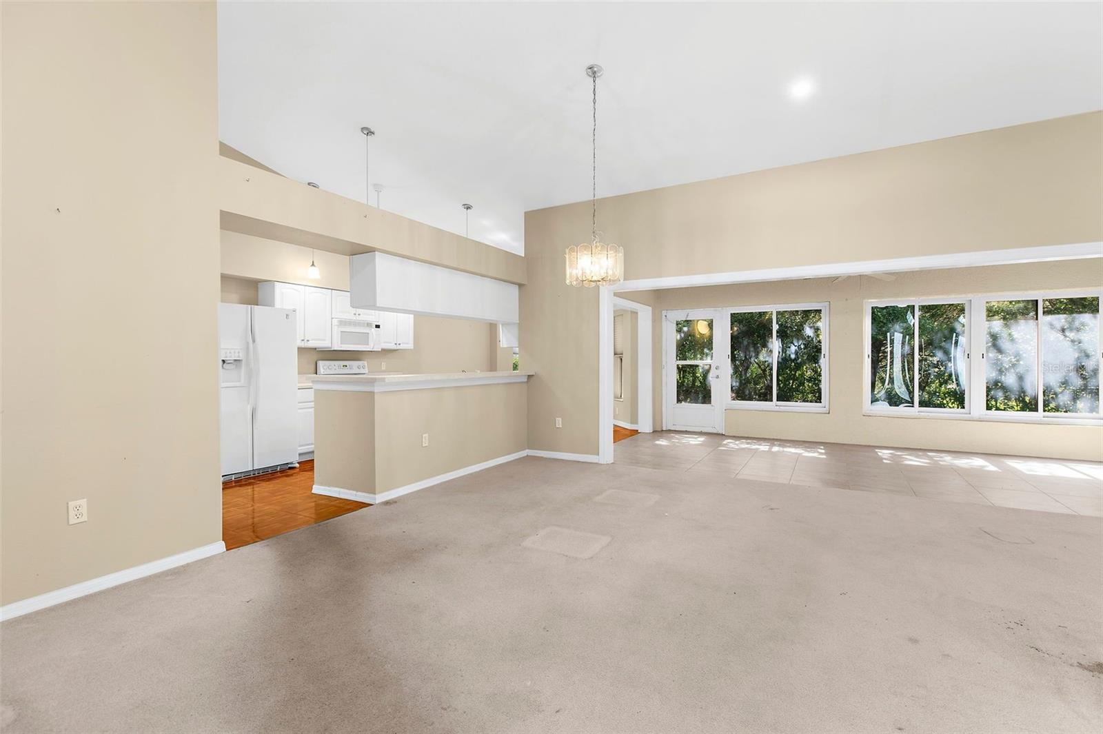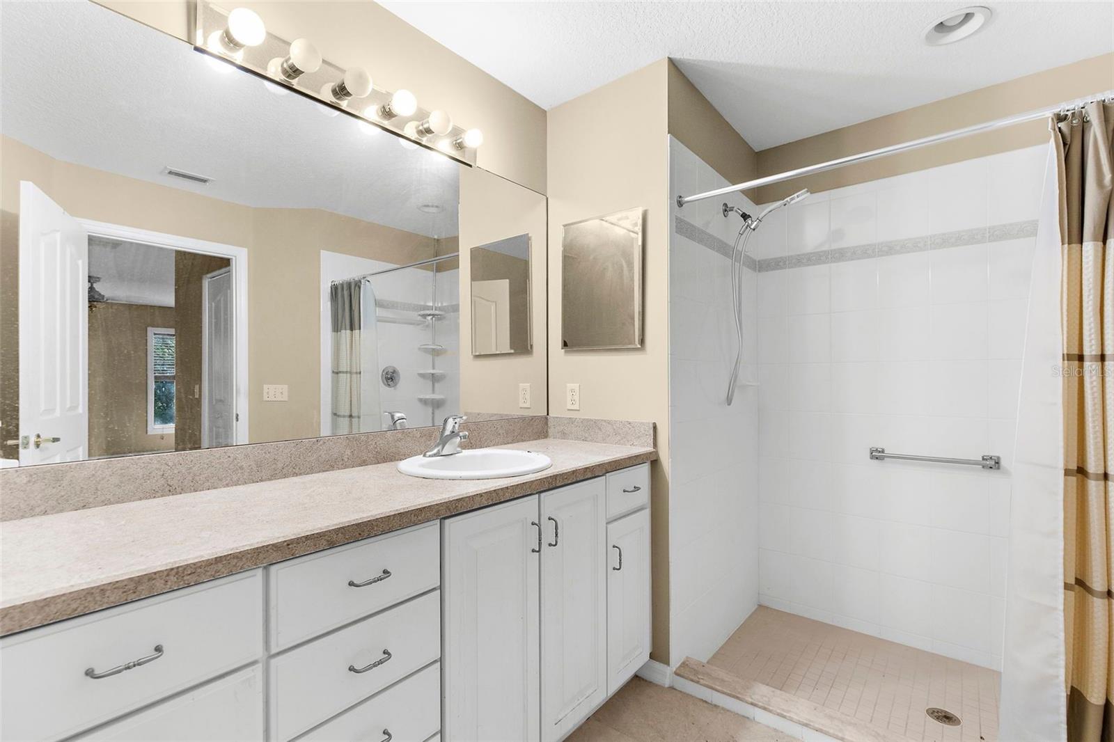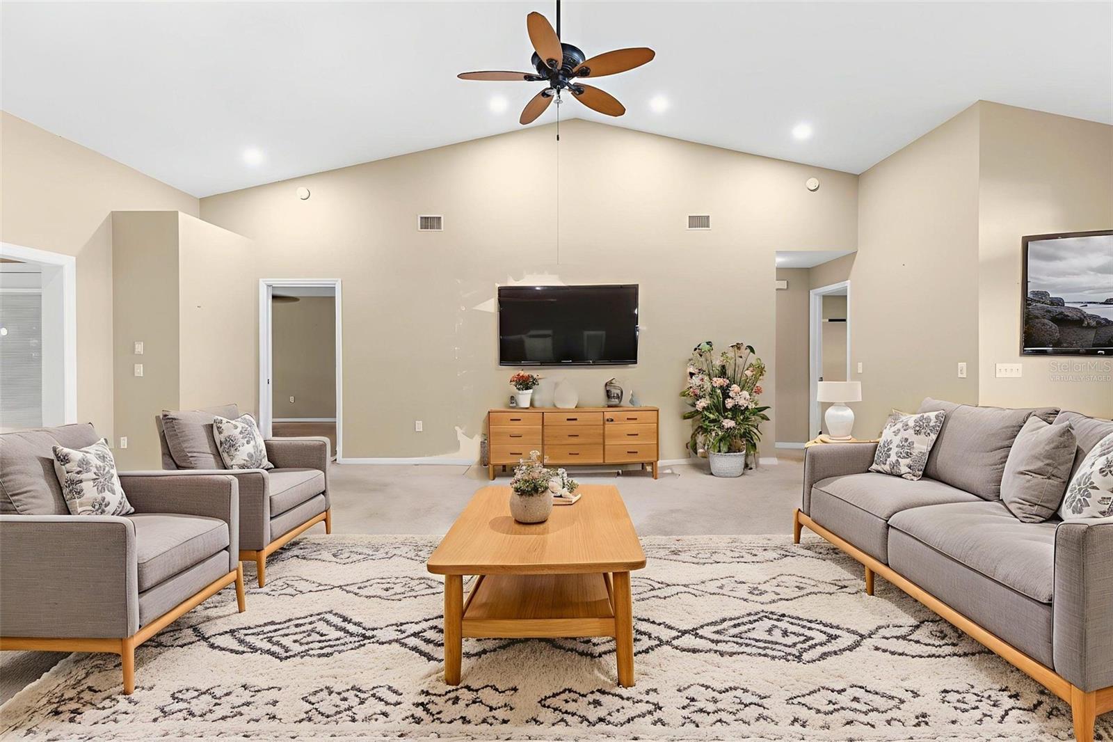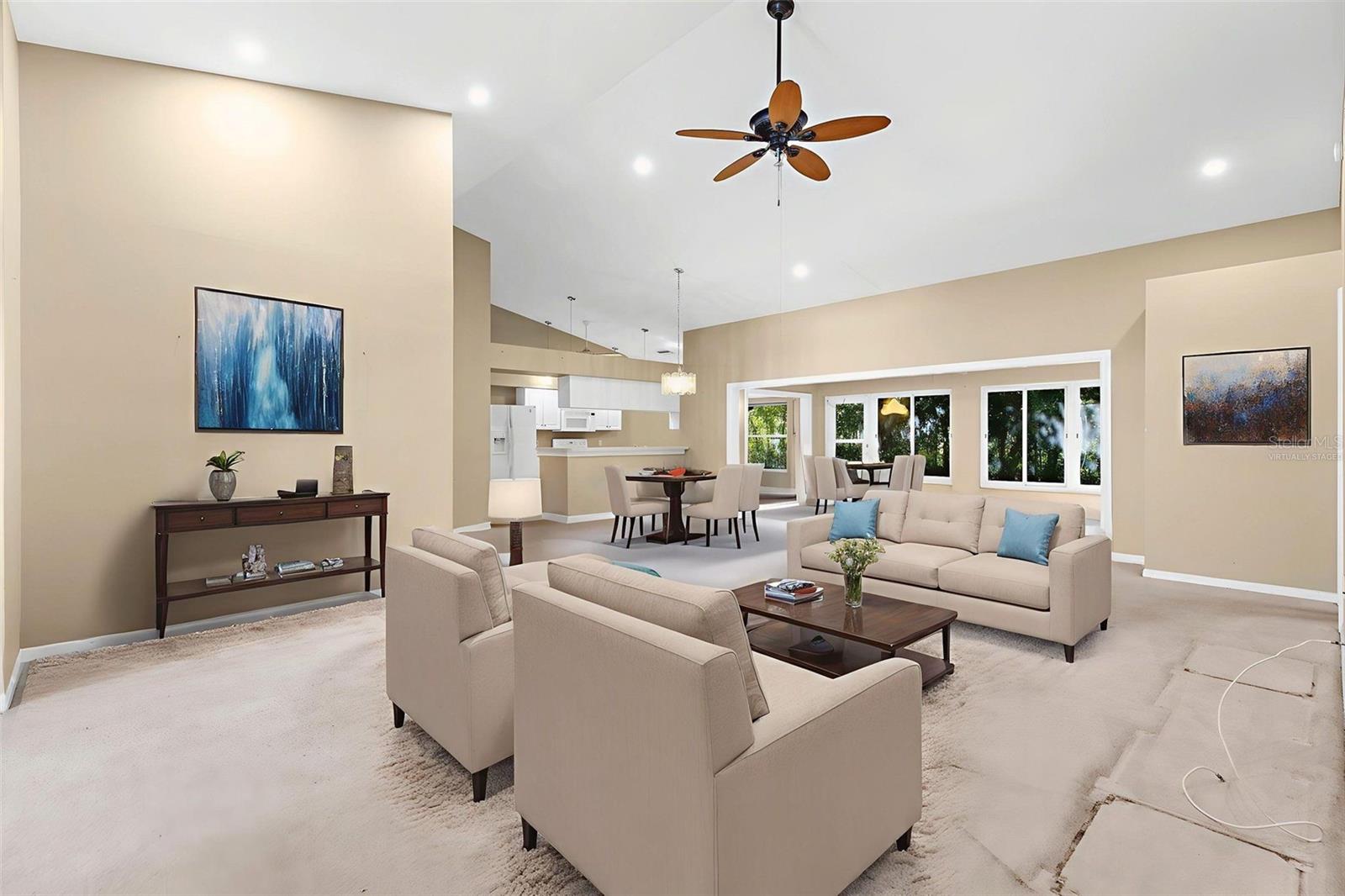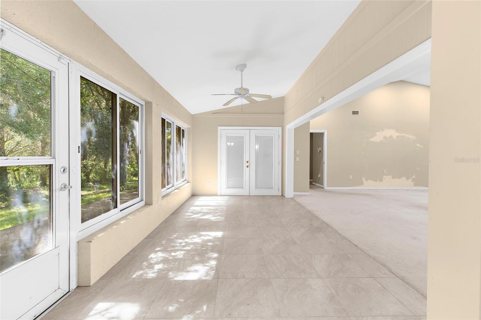 One or more photo(s) has been virtually staged. DESIRABLE END UNIT with extra long driveway, plenty of room for your guests to park in the active 55+ , gated private golf community of Heritage Pines. Looking for an active community !!! Low HOA fee covers cable, internet, exterior maintenance, lawn care, irrigation and exterior painting. ,fitness center, heated pool and spa, tennis, crafting, woodworking, pickleball and more. This 2 bedroom 2 bath end unit has a premier walk in shower in primary bath and a walk in tub in 2nd bath. AC installed in 2024.The sun room has been enclosed with new windows and opens up to living and dining area adding a larger open feel. No rear neighbors makes for lots of privacy on your back patio, Inside laundry off kitchen and garage with cabinets and counter space for folding.