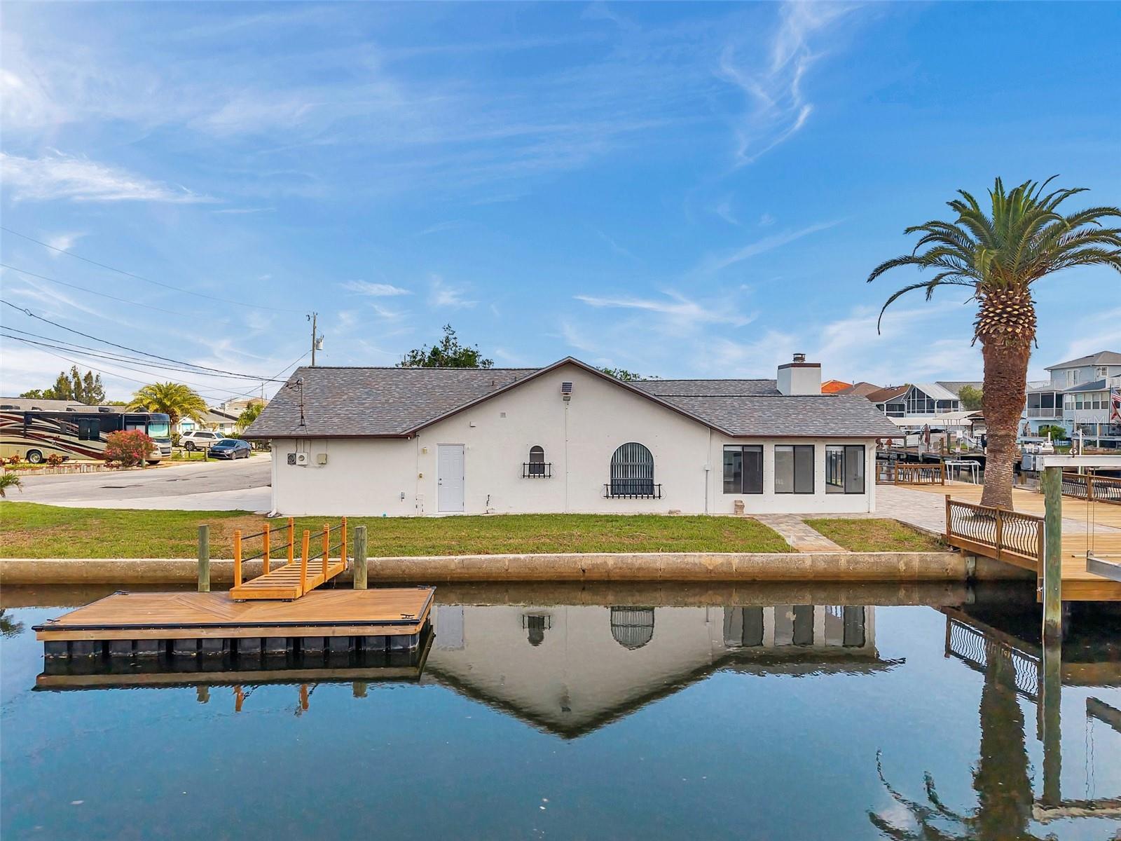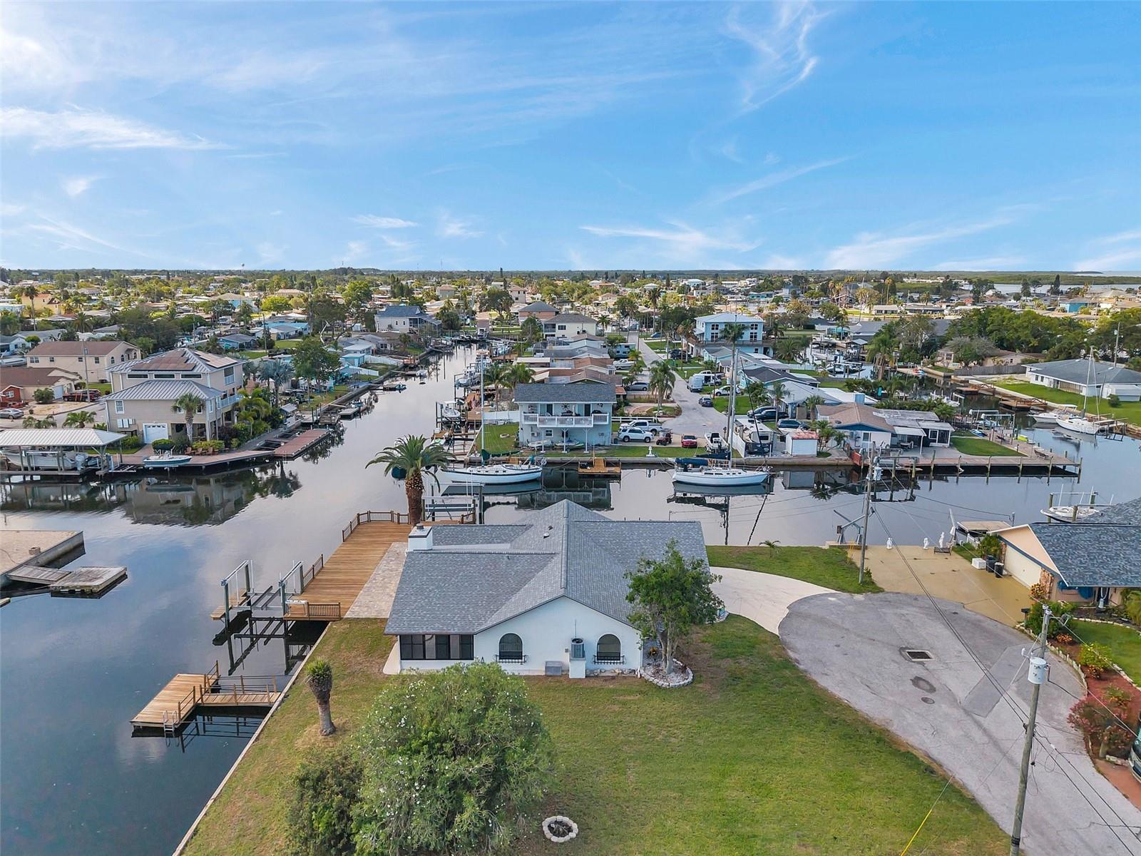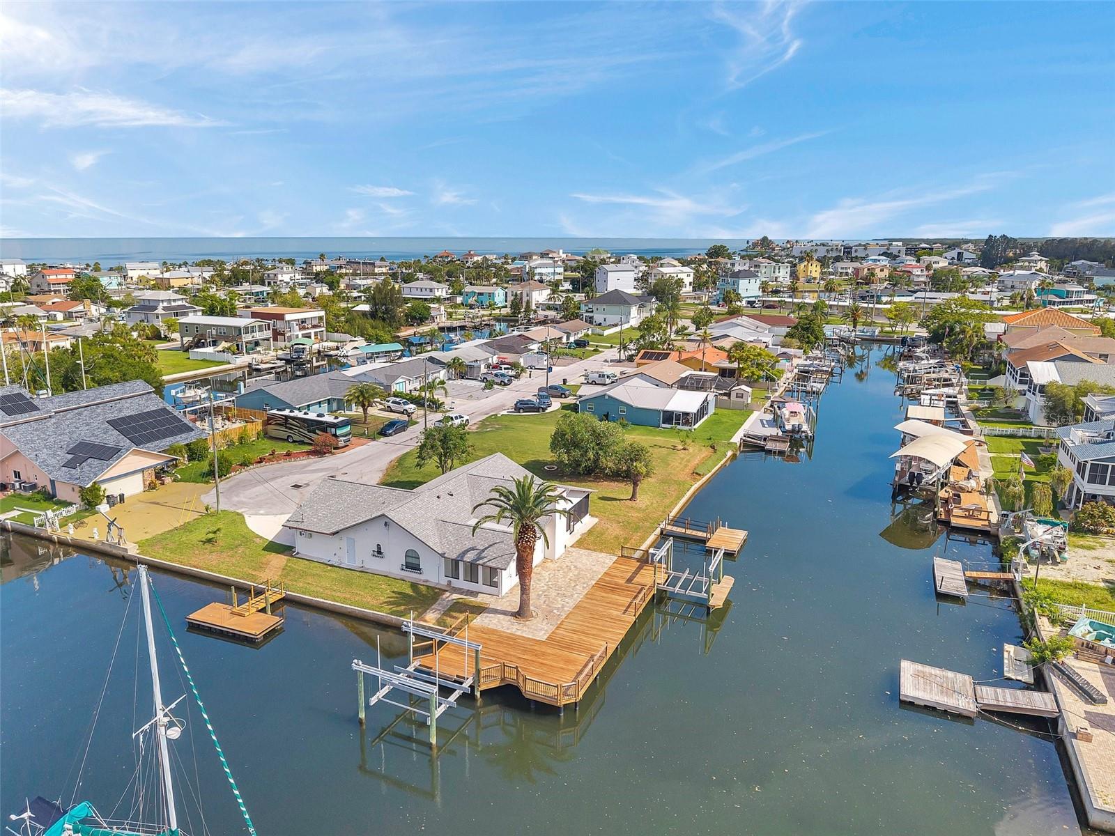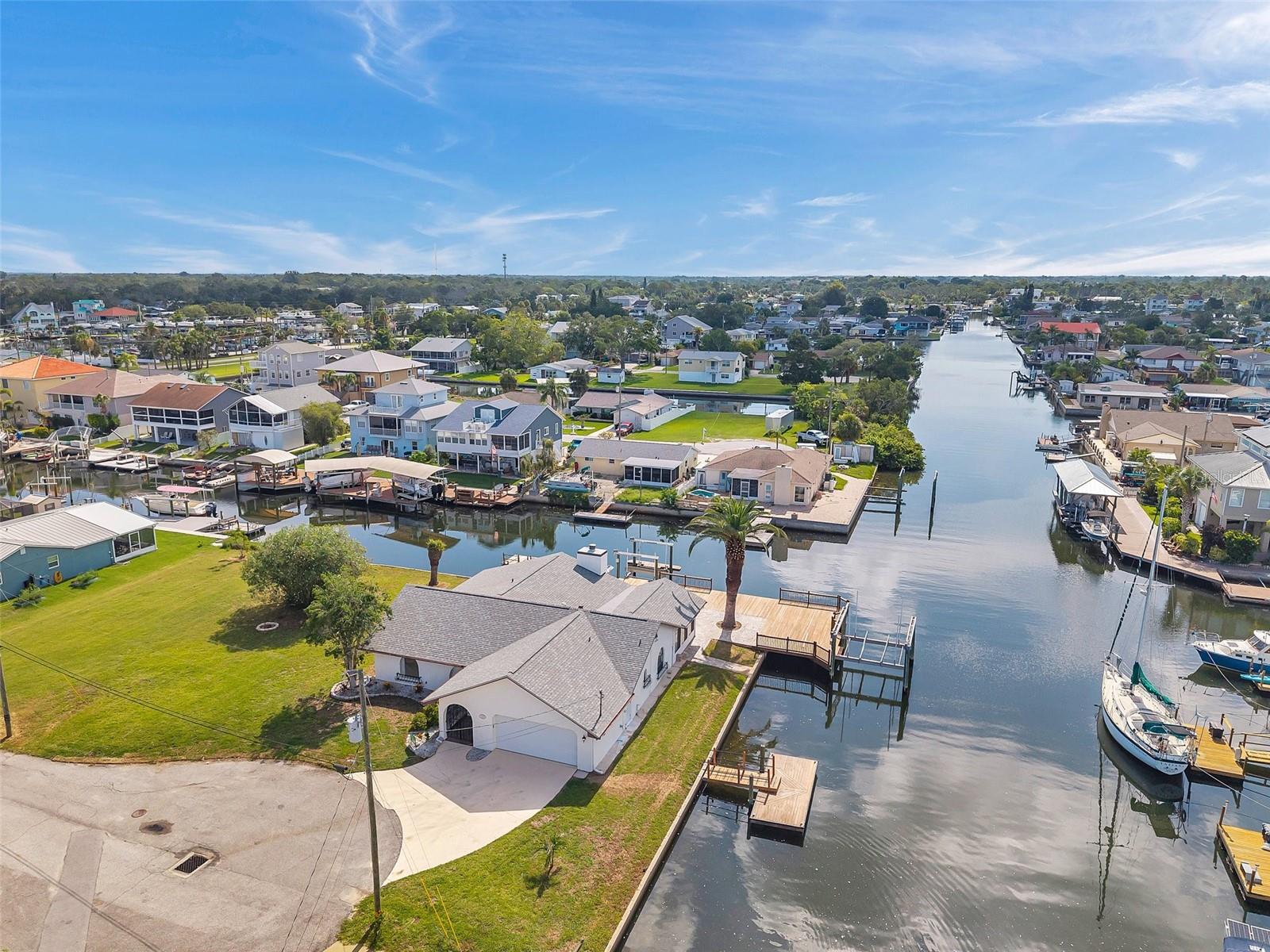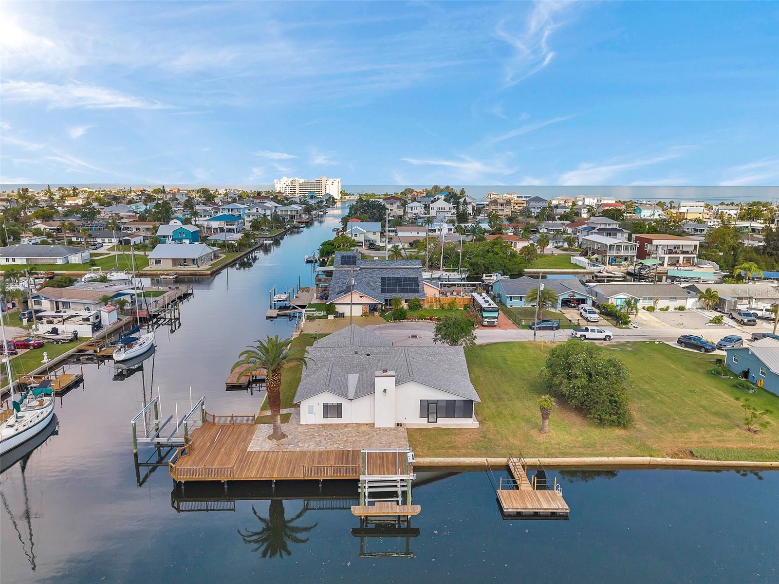 One or more photo(s) has been virtually staged. Welcome to your dream home in the sought-after coastal community of Hudson Beach Estates. Situated at the end of a quiet cul-de-sac on an oversized 0.27-acre lot, this waterfront stunner boasts 270-degree panoramic water views and over 200 feet of waterfront—a rare gem perfect for boaters and sunset lovers alike. This home features two floating docks, 2 boat lifts (one 16K and one 10K), and an expansive wraparound deck for entertaining, lounging, and taking in the views. Minutes to the open Gulf, only 5 canals away, this is a boater’s paradise. Step inside this newly remodeled home to an open-concept layout that seamlessly blends indoor and outdoor living. The kitchen offers beautiful quartz countertops, stainless steel appliances and white cabinets for that classic coastal feel. The spacious primary bedroom has a private ensuite, with walk-in shower, and two large closets. There are two additional bedrooms and a bathroom in a split-floor plan design offering privacy and comfort. The family room boasts a wood burning fireplace to snuggle up while enjoying the water views. There is a covered screen porch off the family room and a bonus room off the primary suite, ideal as a home office, guest lounge or game room. New roof installed in 2022. Bring all your toys! This waterfront community has sailboat deep water and is RV and golf cart friendly. There is a public beach just a short ride on your golf cart with waterfront restaurants and marinas. A 45-minute ride to Tampa International Airport. Close to New Port Richey’s historic downtown, rich with dining, culture and family-friendly activities. Come enjoy the Florida Waterfront lifestyle in this beautiful move in ready home. Schedule your private showing today! Home is also listed for rent, please see MLS # W7877100